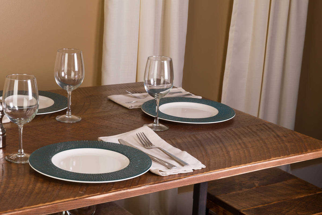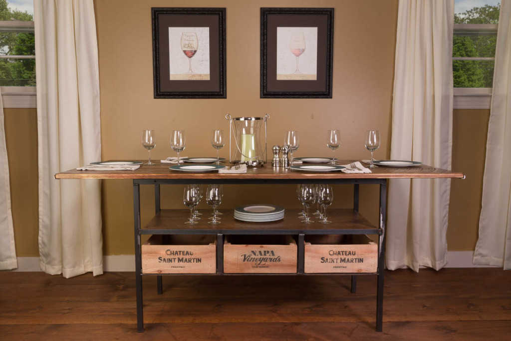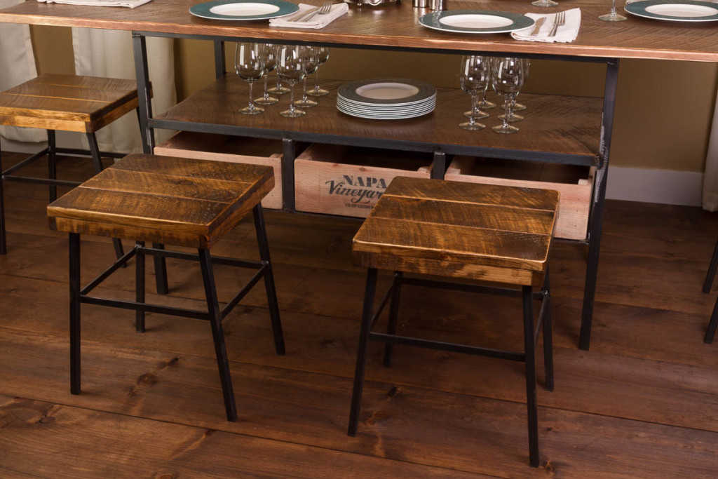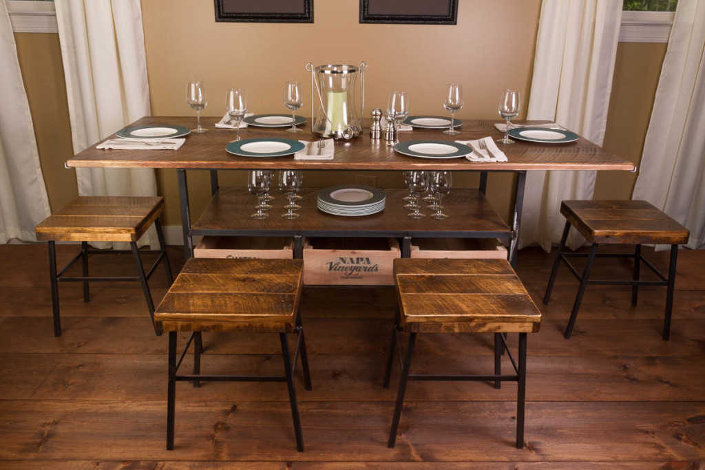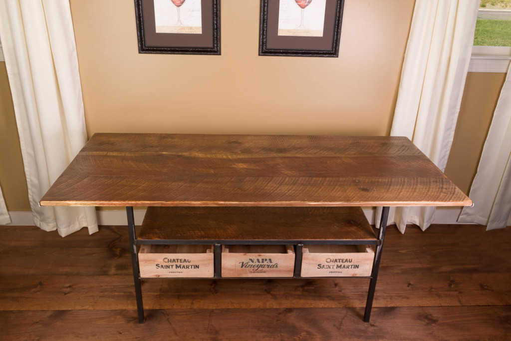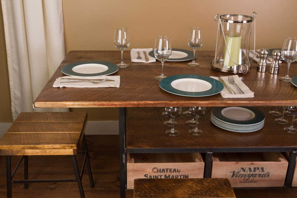The solid wood table top is designed from distressed reclaimed wood with a weathered patina. The table contains 3 manual slides out wine crates. Lower shelf is perfect for storage. Shelf measures 21" deep by 45" wide. design. Set includes four Cellar stools.