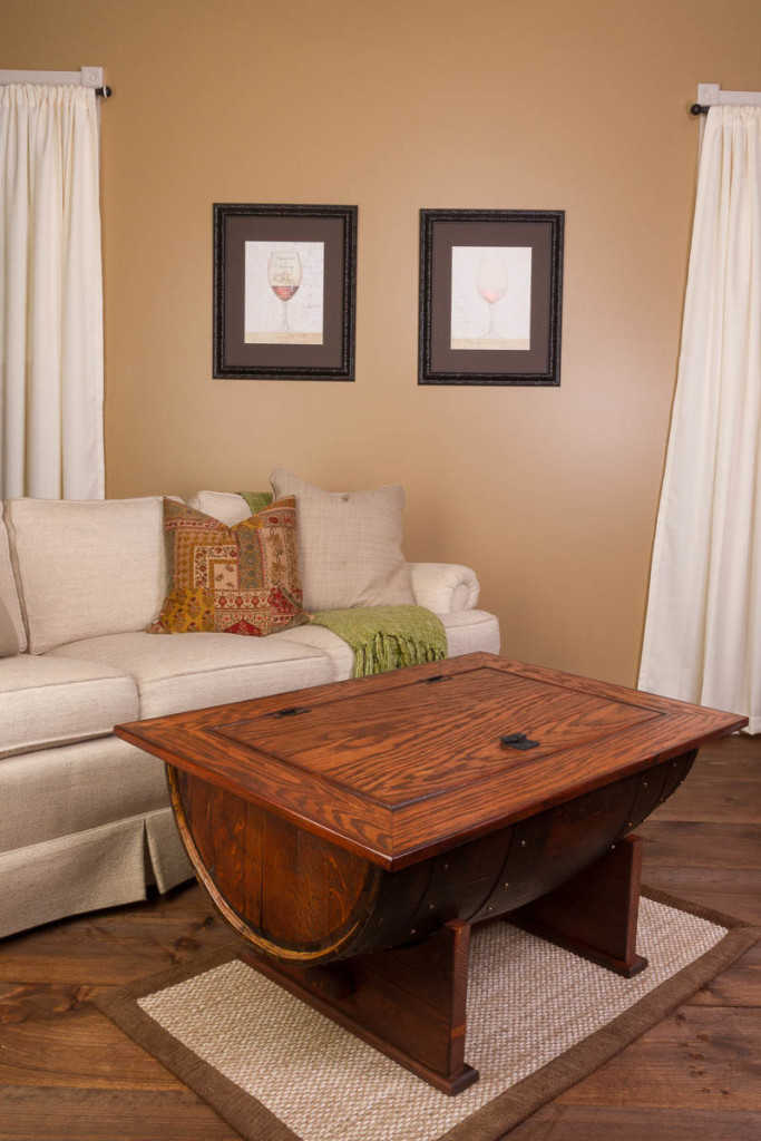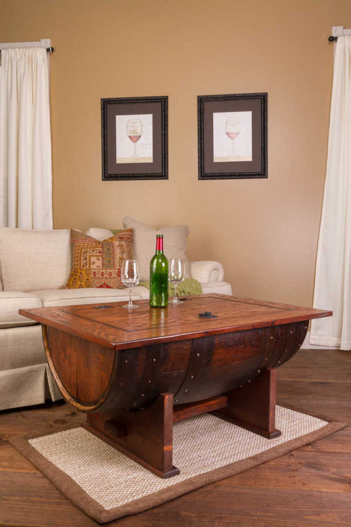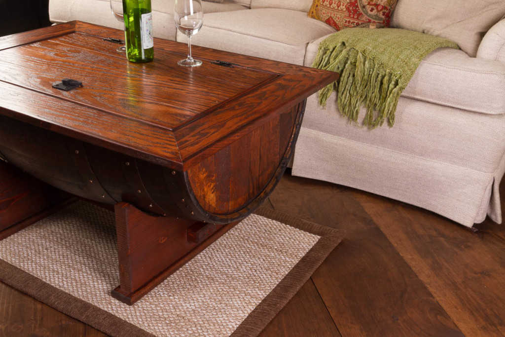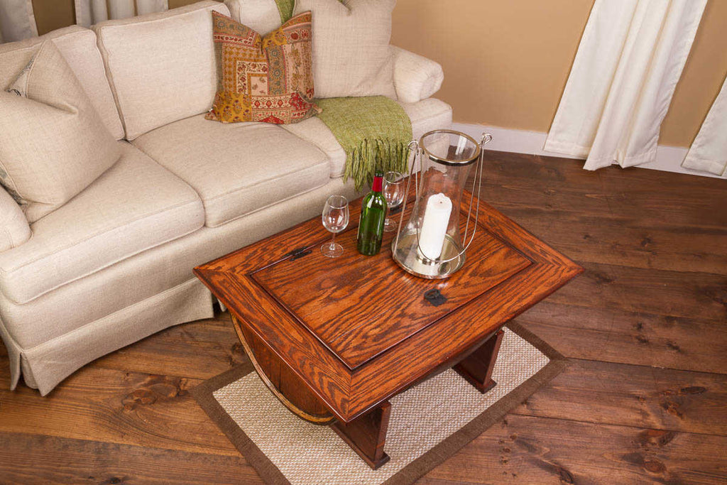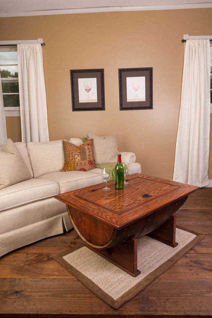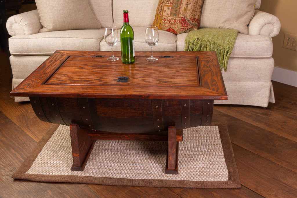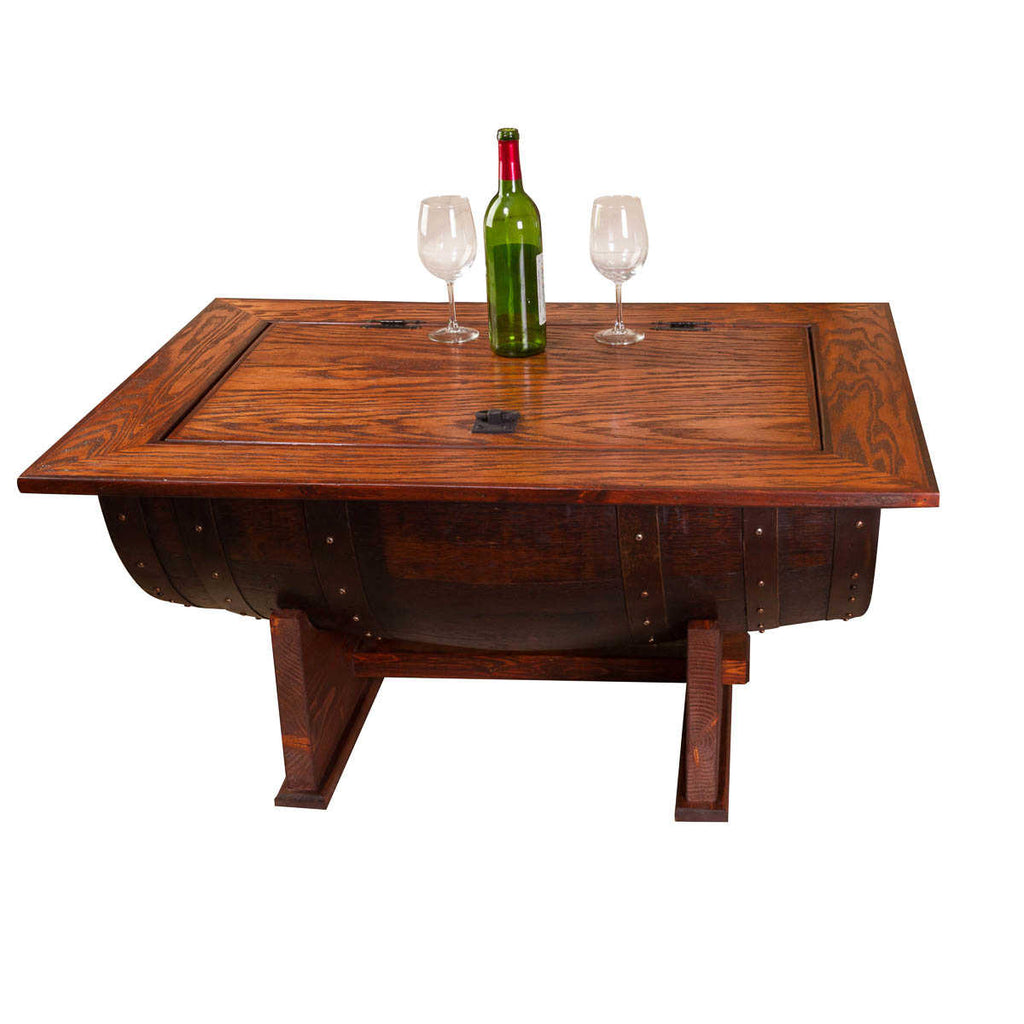 Beautiful wine barrel distressed finish coffee table boasts all the fine craftsmanship along with the elegance of detail. The distressed finish adds an additional element of design while the coffee table gives you plenty of hidden internal storage. The solid wood table provides a sturdy and attractive table surface made from solid white oak. Our wine barrel distressed finish coffee table is made from half of a vintage retired French wine barrel with a solid white oak distressed top and solid wood base. A hinged table top allows for easy access to the storage area. Dimensions: Measures 37" long by 27" wide and 20" tall.