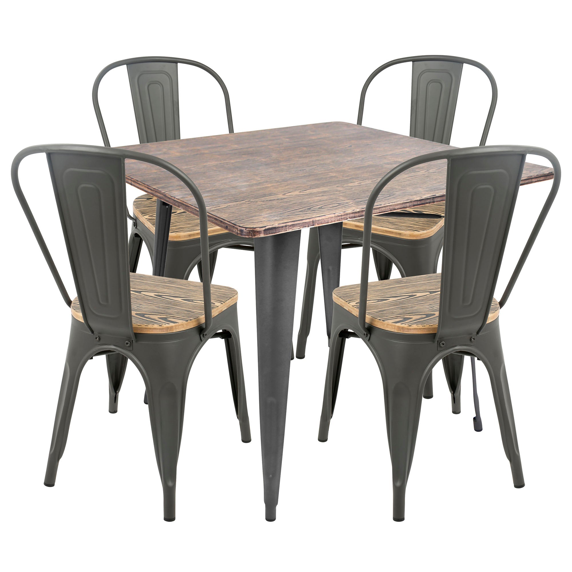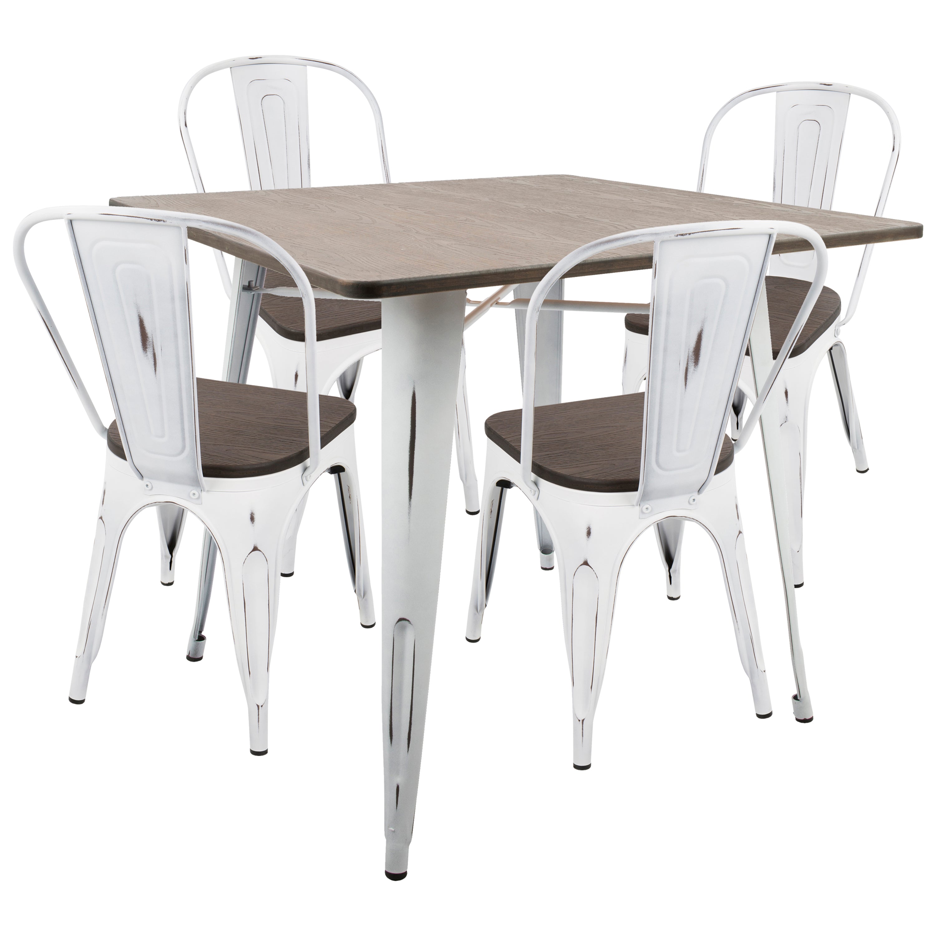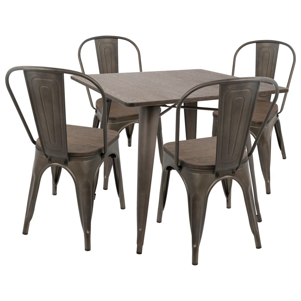 Antique-finished metal legs are juxtaposed with an espresso wood-finished Table top and seats to create the epitome of cool in this industrial-inspired dining solution. Includes four chairs and one Table.