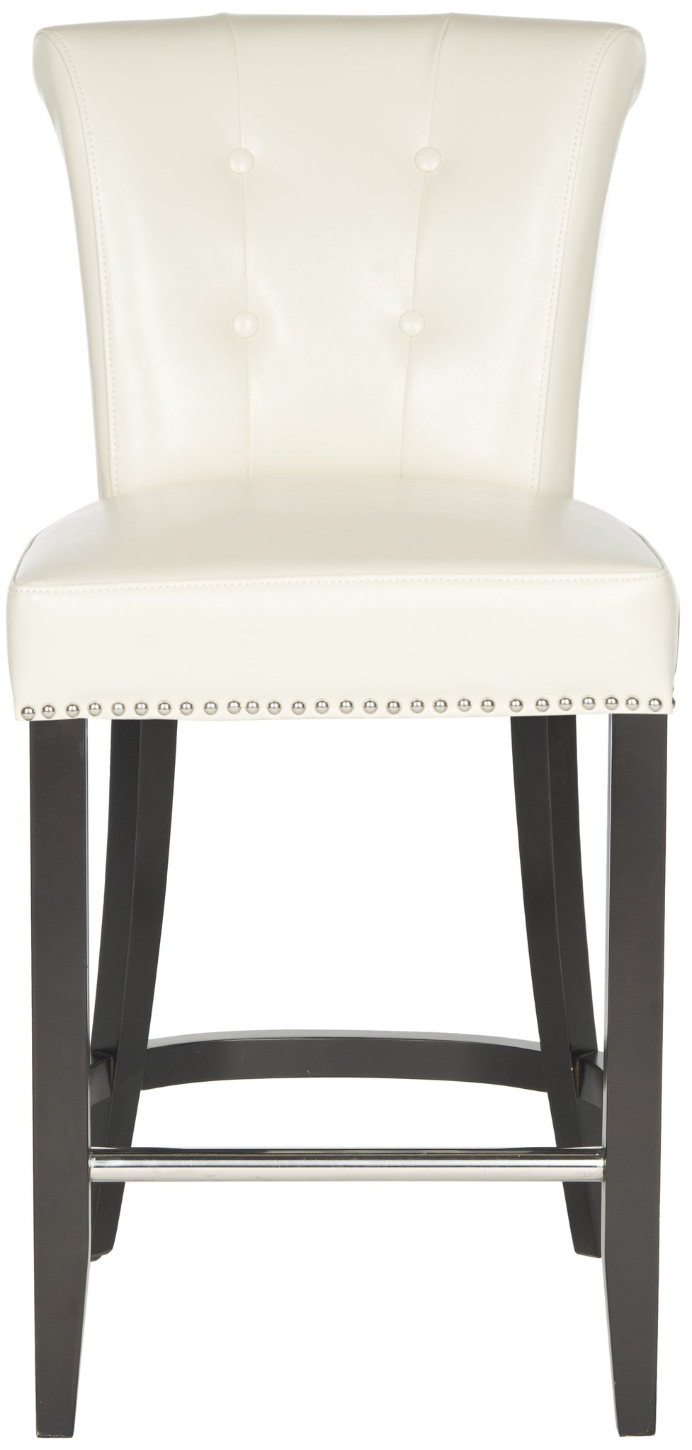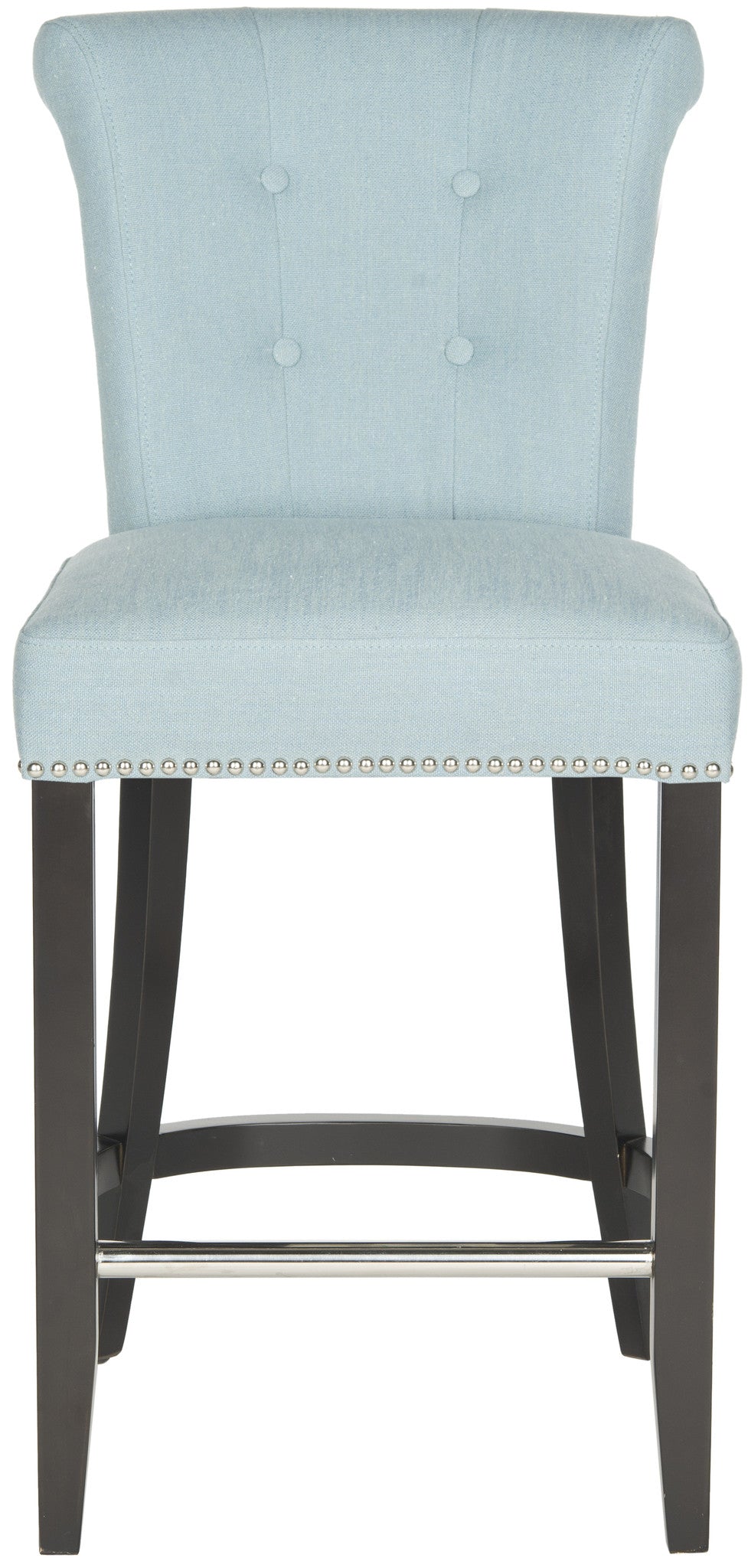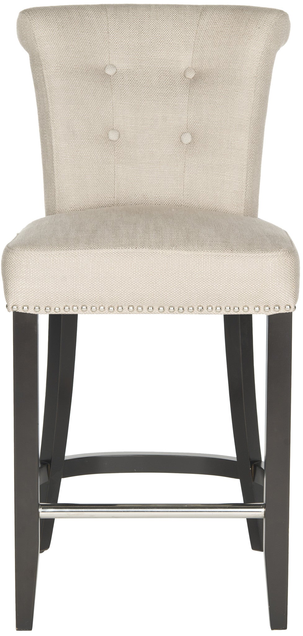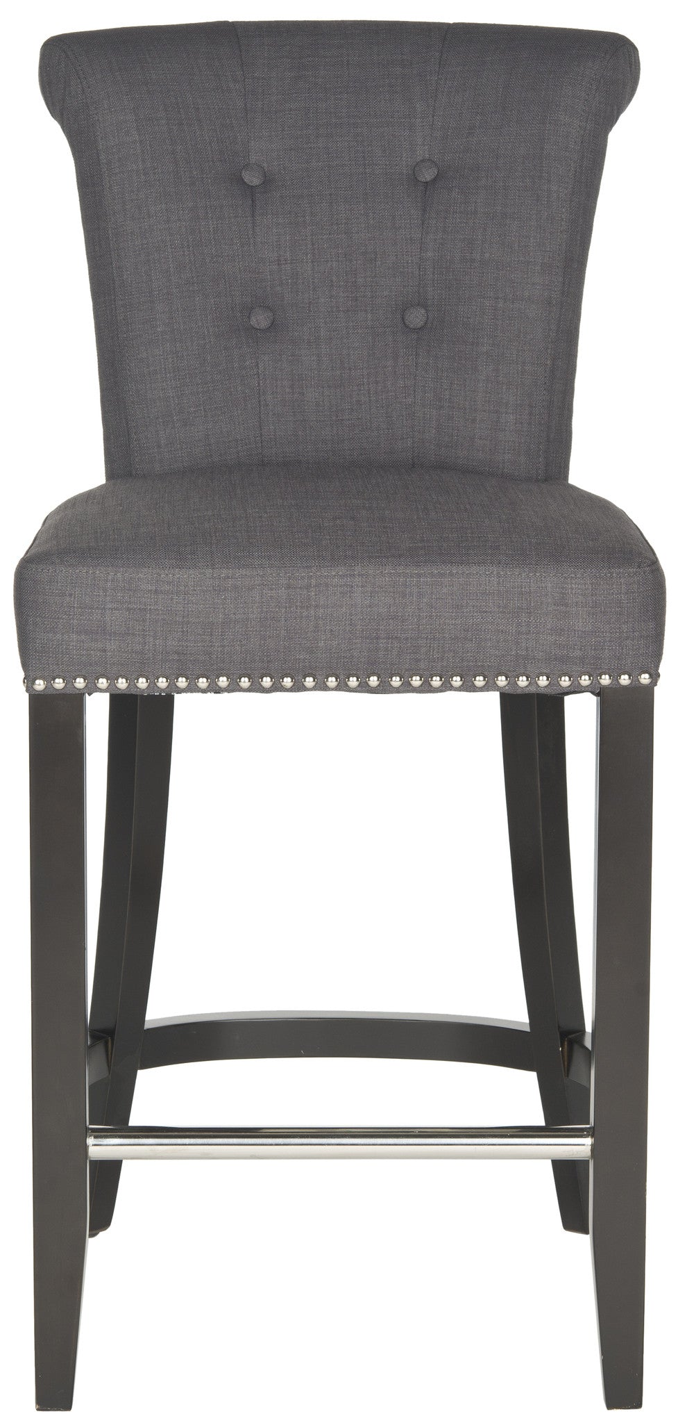 Dressed up with silver nail heads, foot rest and a clever metal ring on its back, the Addo ring counter stool is shown in charcoal linen-weave poly fabric with birch legs in espresso. Button tufts on the front of the tapered backrest add to the allure.