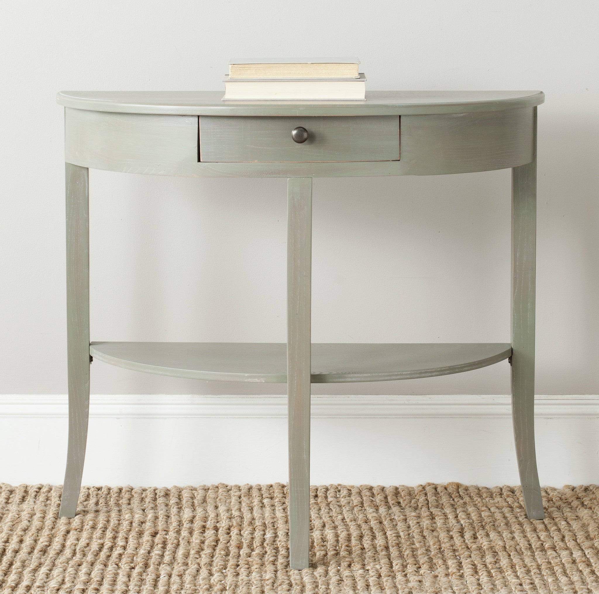 With clean lines inspired by Mission Style furniture, the transitional ash grey Alex console by Safavieh adapts to myriad decorating themes. Crafted of elm with a handy drawer and lower shelf, this demilune table is ideal in an entry hall or living room. Use the Alex console in pairs for a grand statement in a living room.
