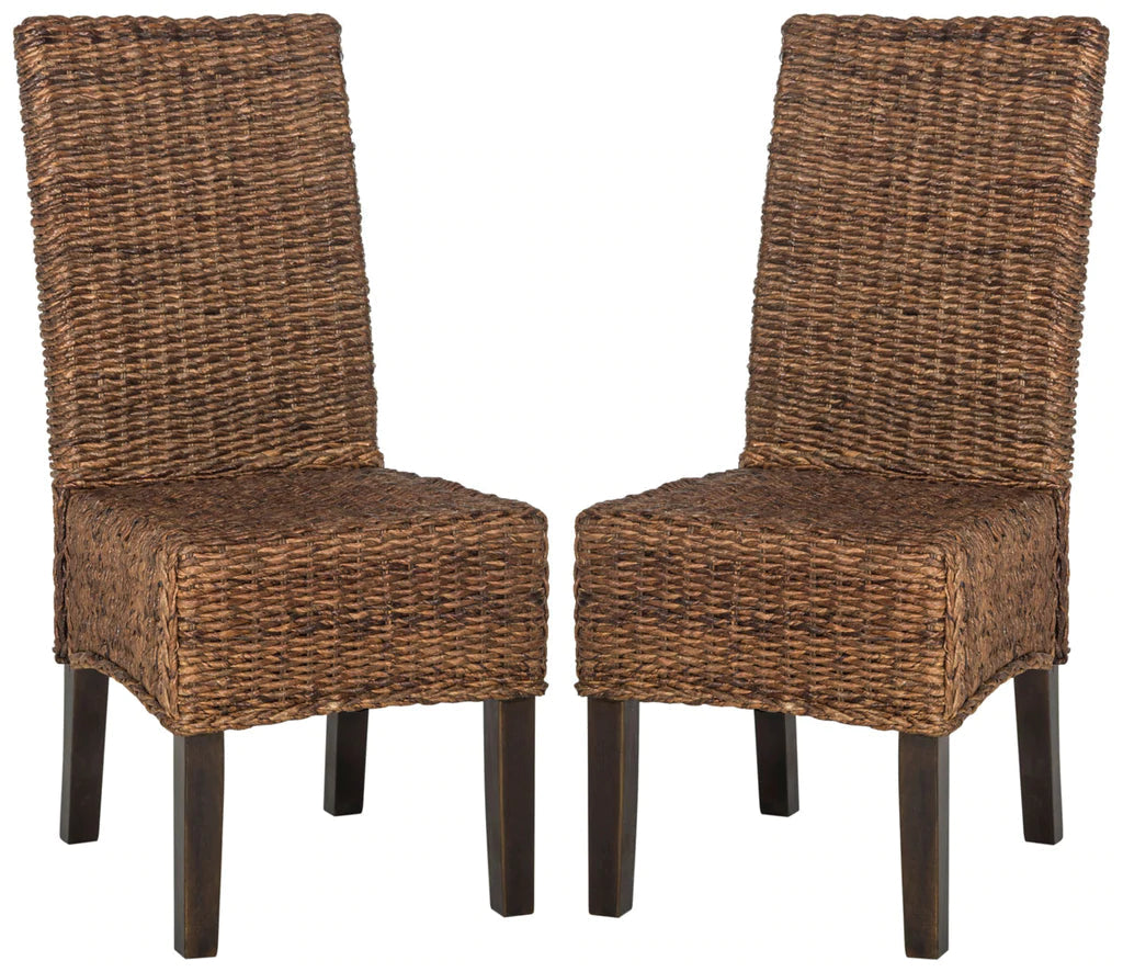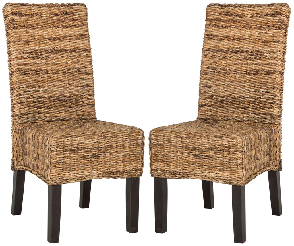 Crafted with exotic banana leaf fiber for its elegant natural coloring and shading, this set of two woven dining chairs is at home in dining rooms, kitchens and casual living spaces. Contrasting dark-finished hardwood legs add to the transitional allure.