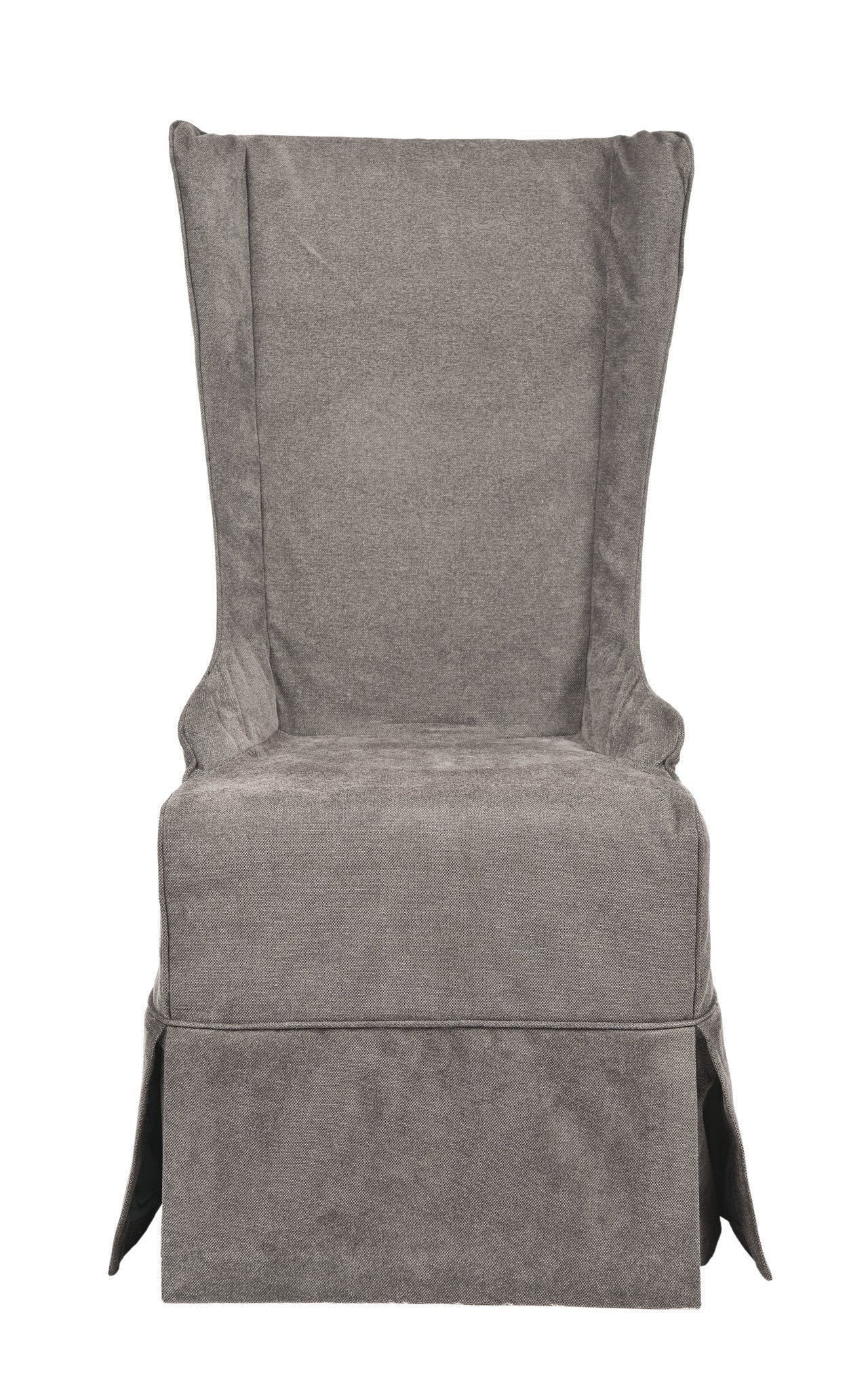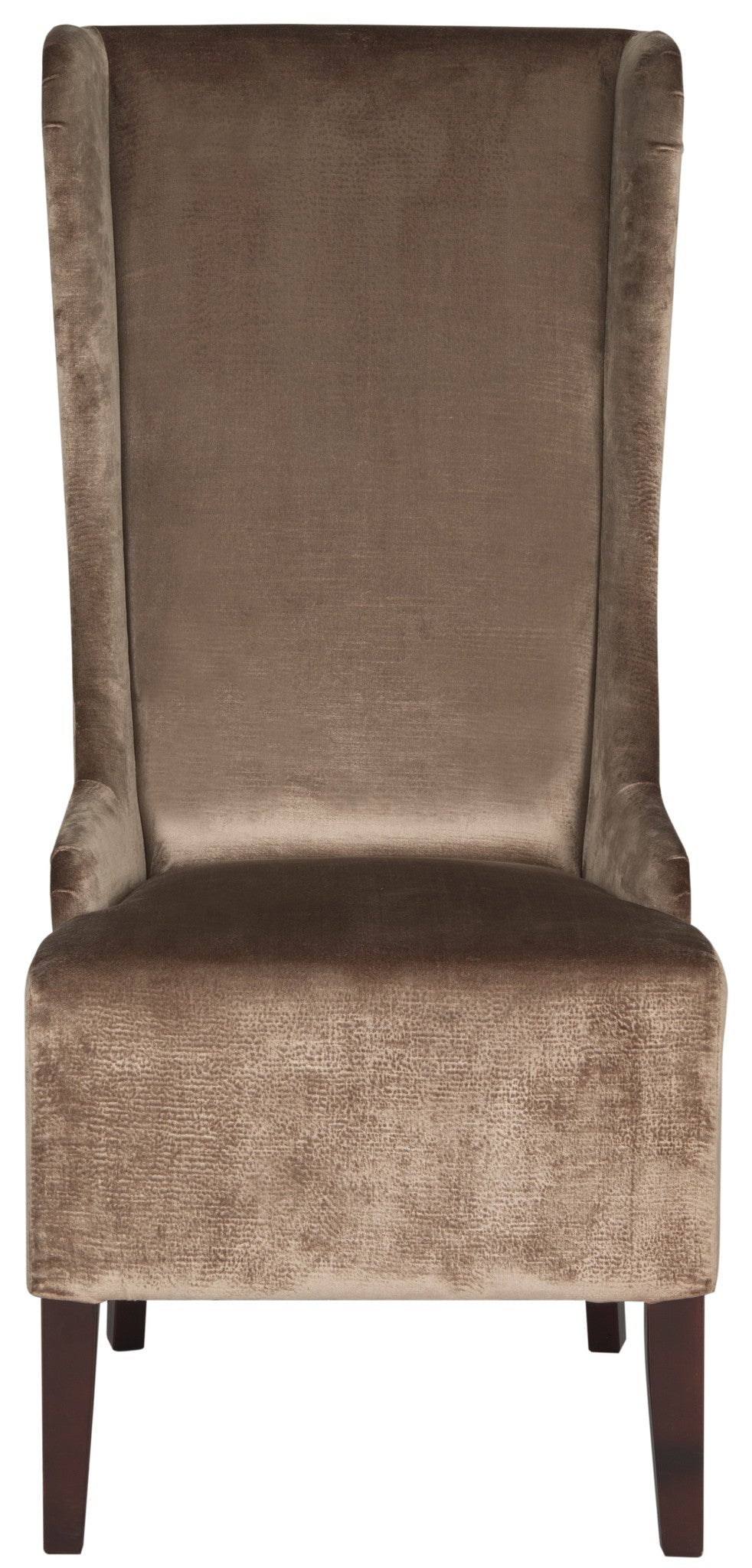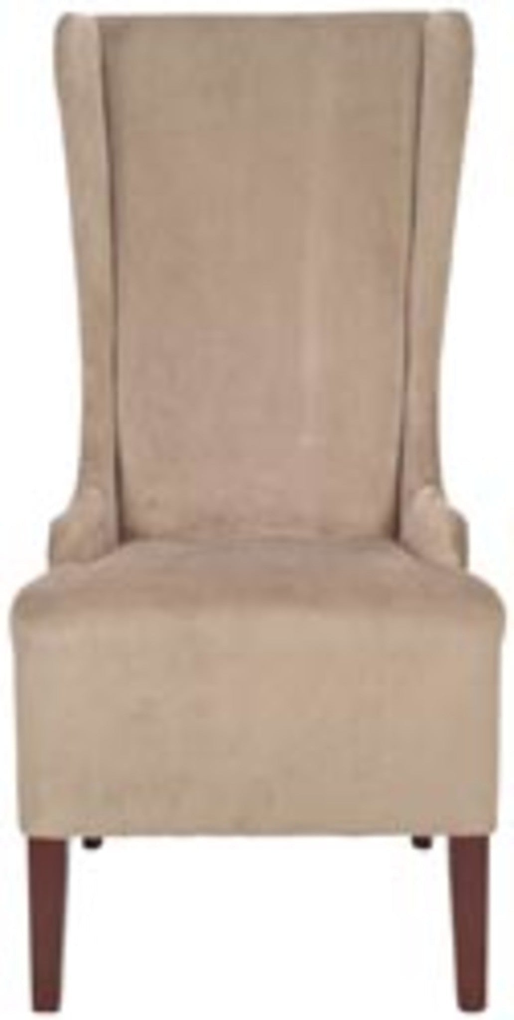 The Bacall high back chair, in dark champagne cotton fabric and cherry mahogany finished legs, absolutely commands attention. With a reaching, slightly tapered backrest and sloping arms, the dramatic Bacall is all about smart sophistication.