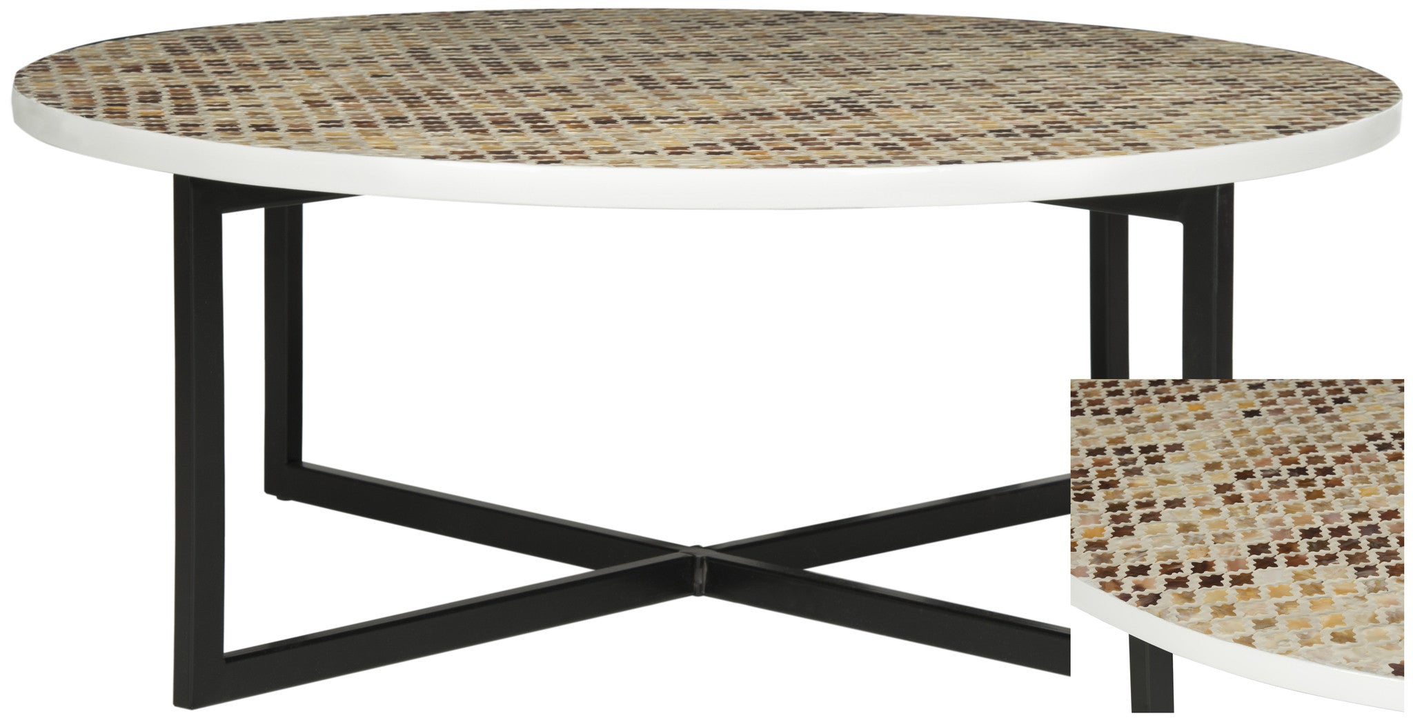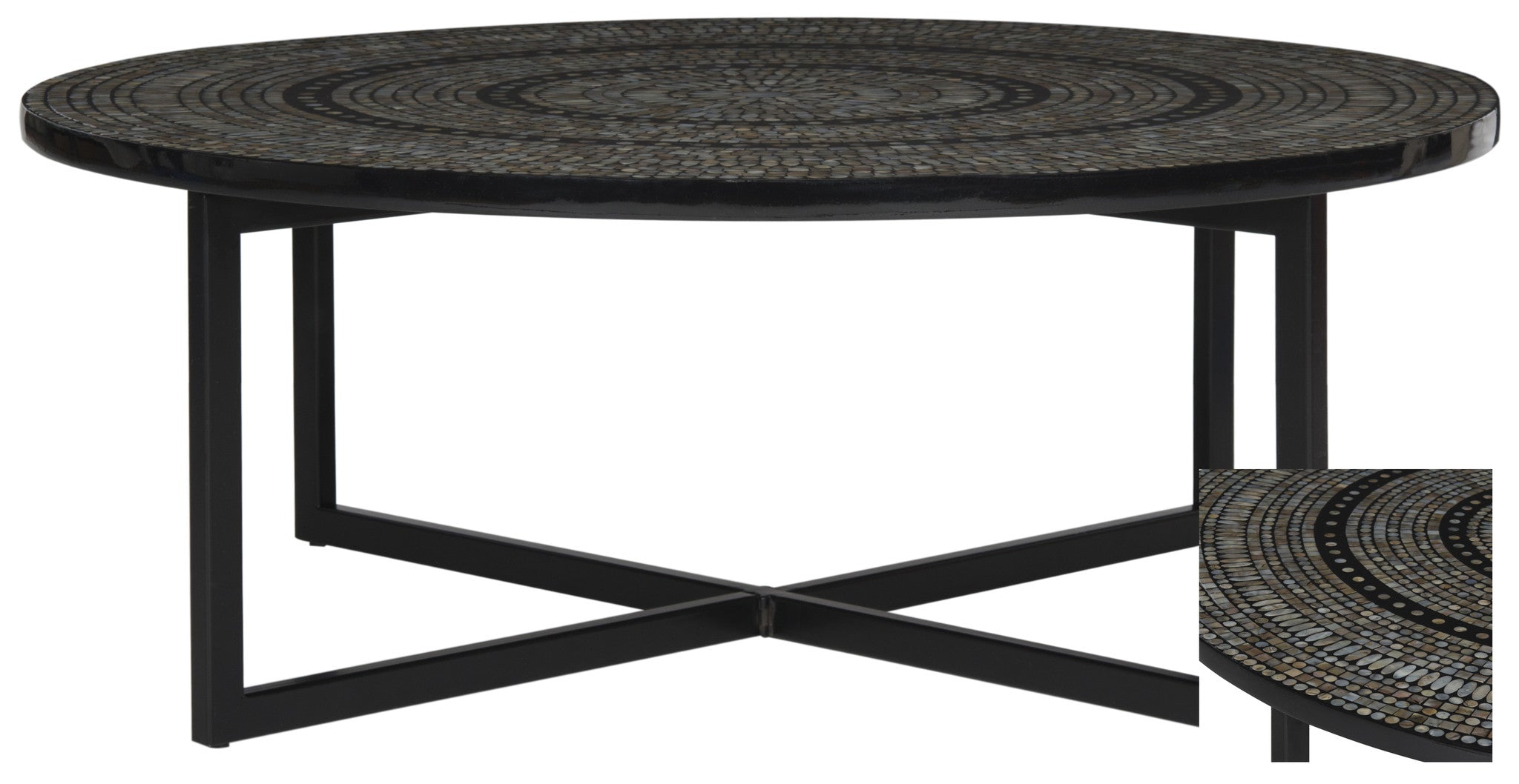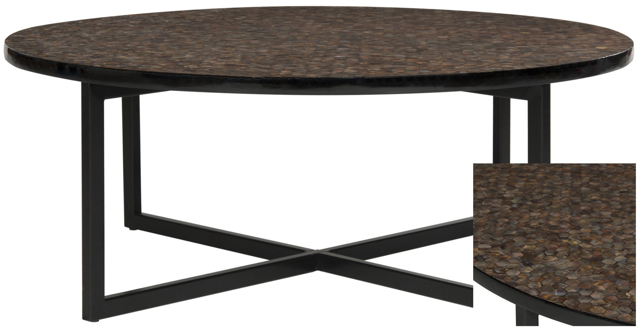 A chic conversation piece, the Cheyenne coffee table in brown mosaic brings new meaning to modern art for the home. The ancient craft of mosaic tile work inspired this pretty and practical piece, which is accented with graphic black powder coated legs.