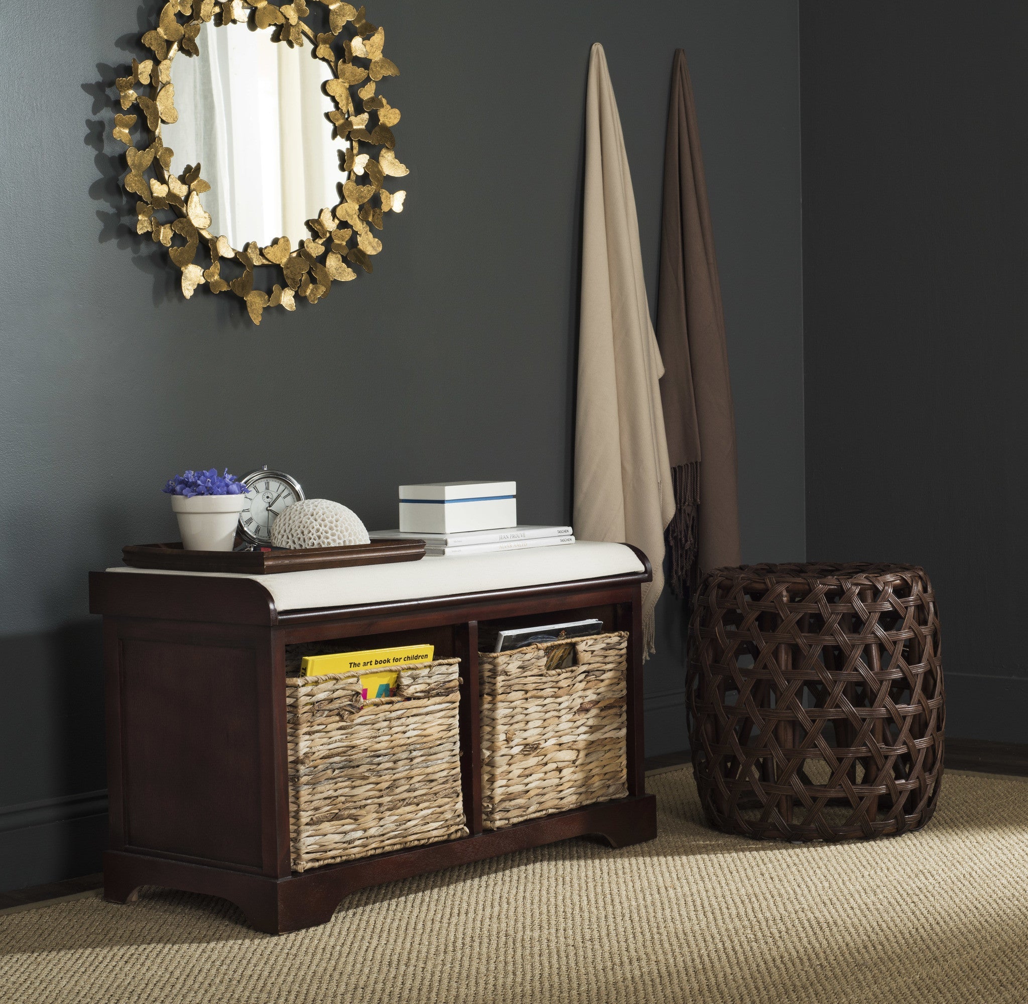 Sit back and relax. This pretty storage bench with dark brown pine frame and linen upholstered seat is perfect for changing shoes in entry hall, and its woven baskets can hold towels and other necessities in a master bath. A versatile piece in any room.