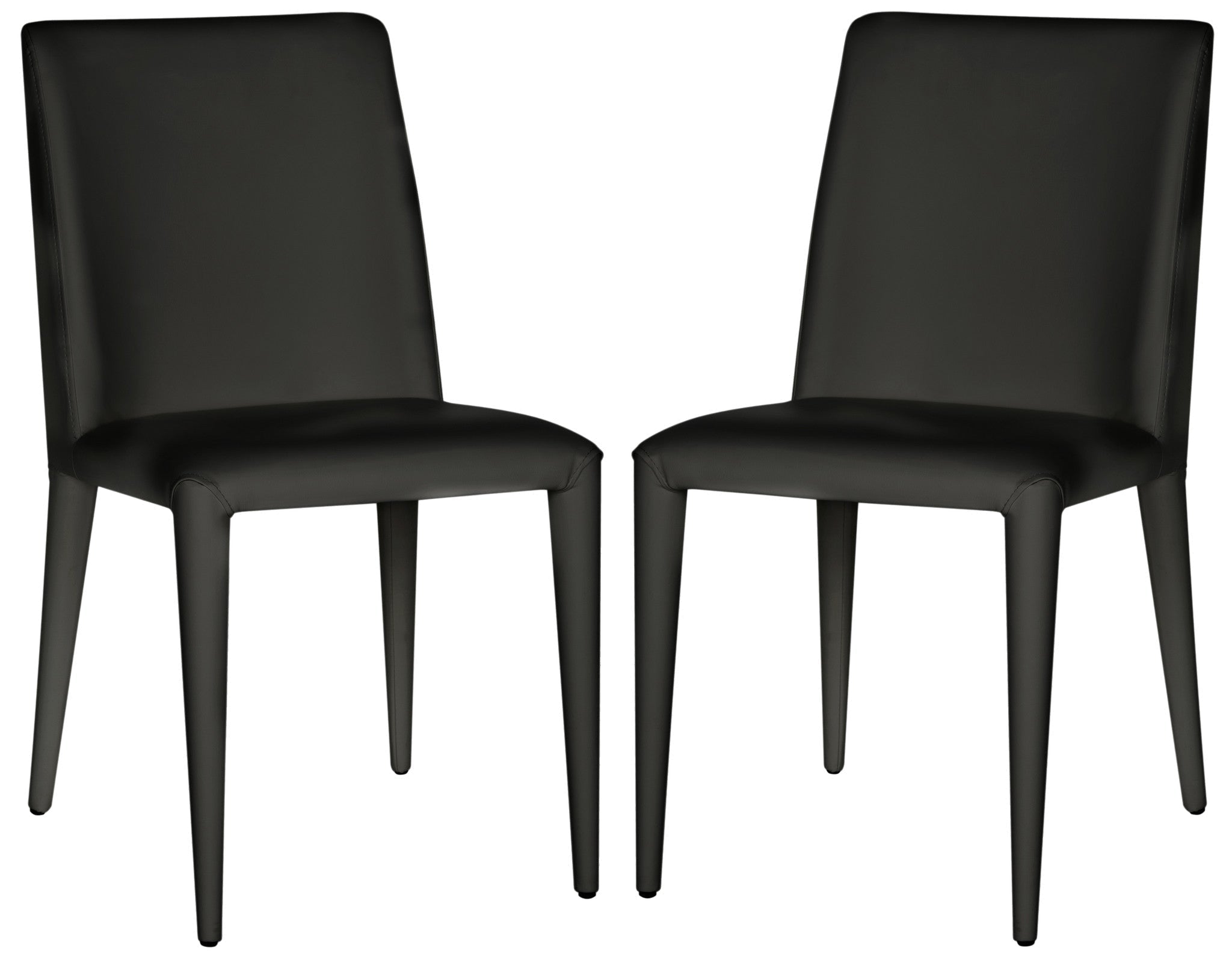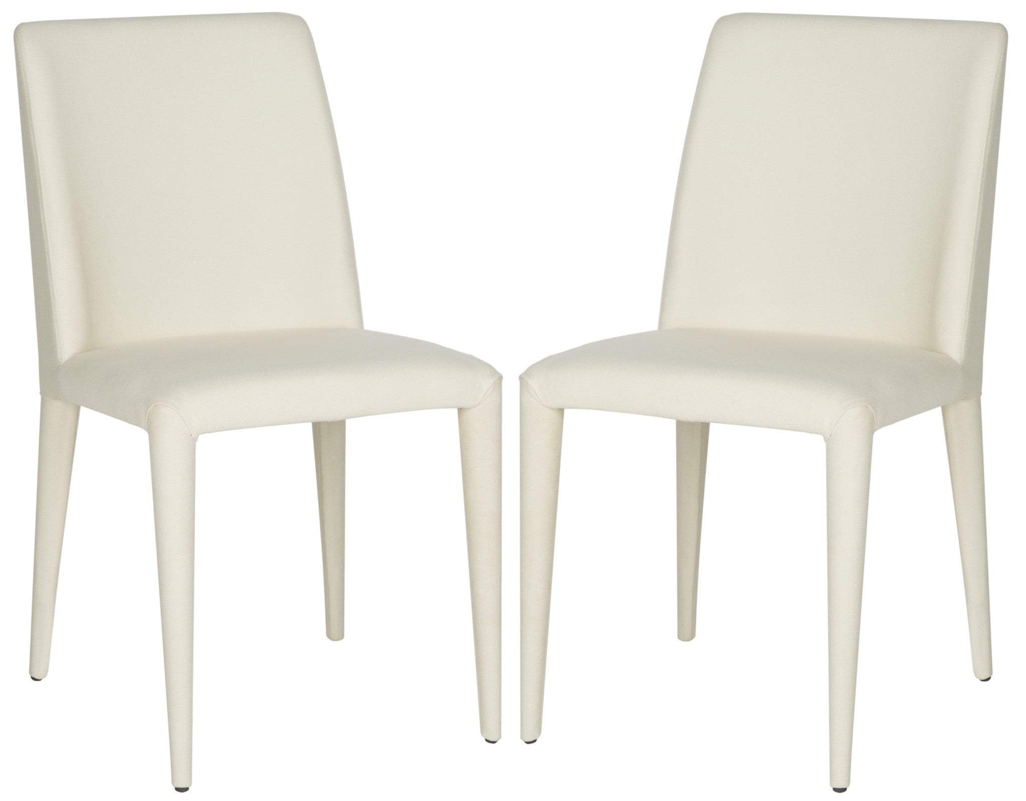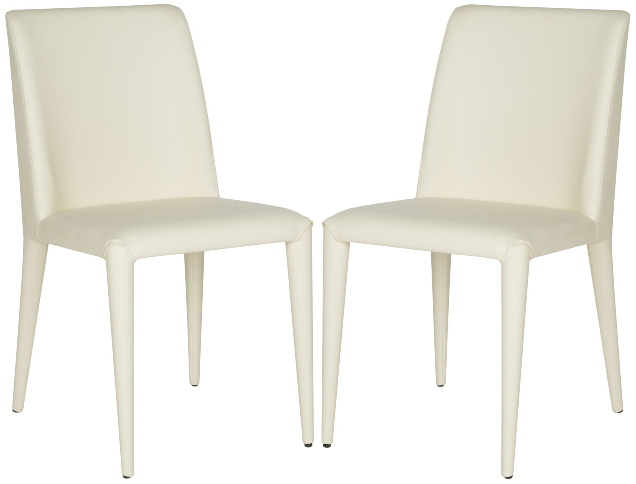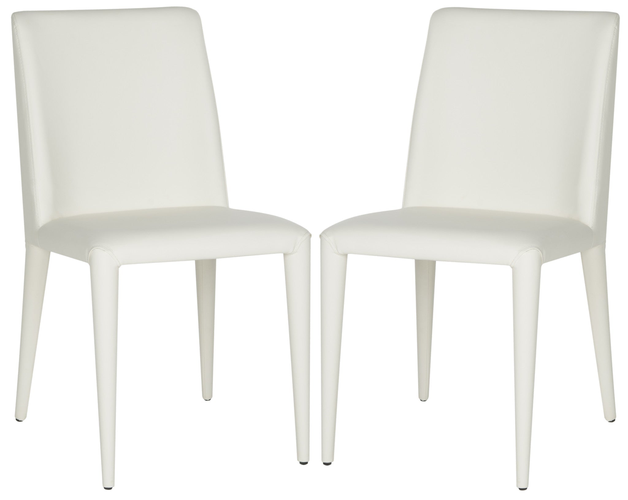 Modern elegance defines the clean-cut lines of this set of two white side chairs combining the tactile quality of leather with a high tech sculpted silhouette. Crafted of PU leather and iron, this design is a contemporary kitchen or dining room essential.