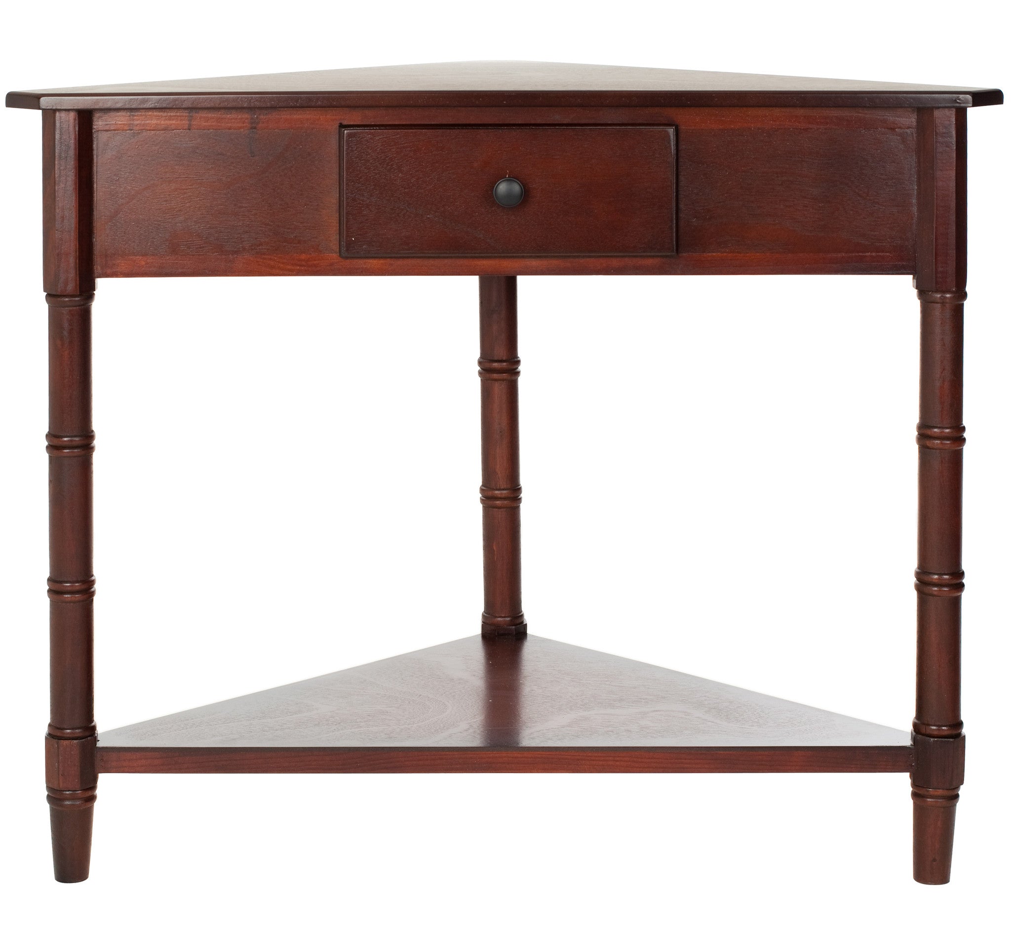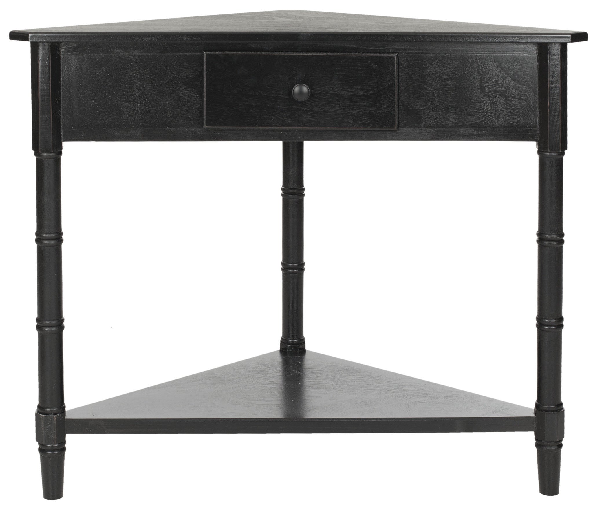 Curate an unused corner with the charming Gomez triangular table with clean lines that complement country casual, traditional and transitional interiors depending on finish. Crafted of pine with vintage gray finish the Gomez corner table features storage drawers, bottom shelf and gracefully turned legs.