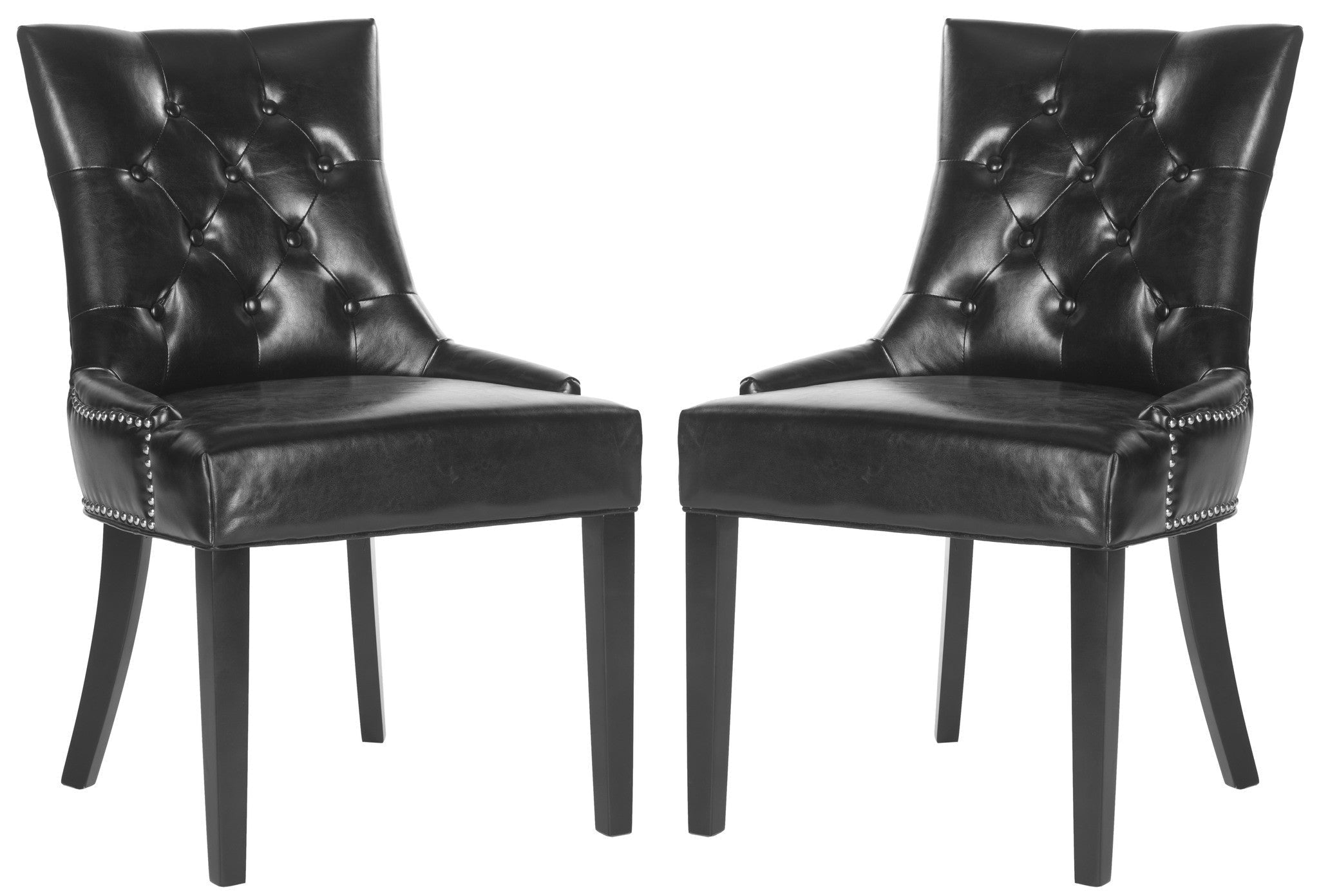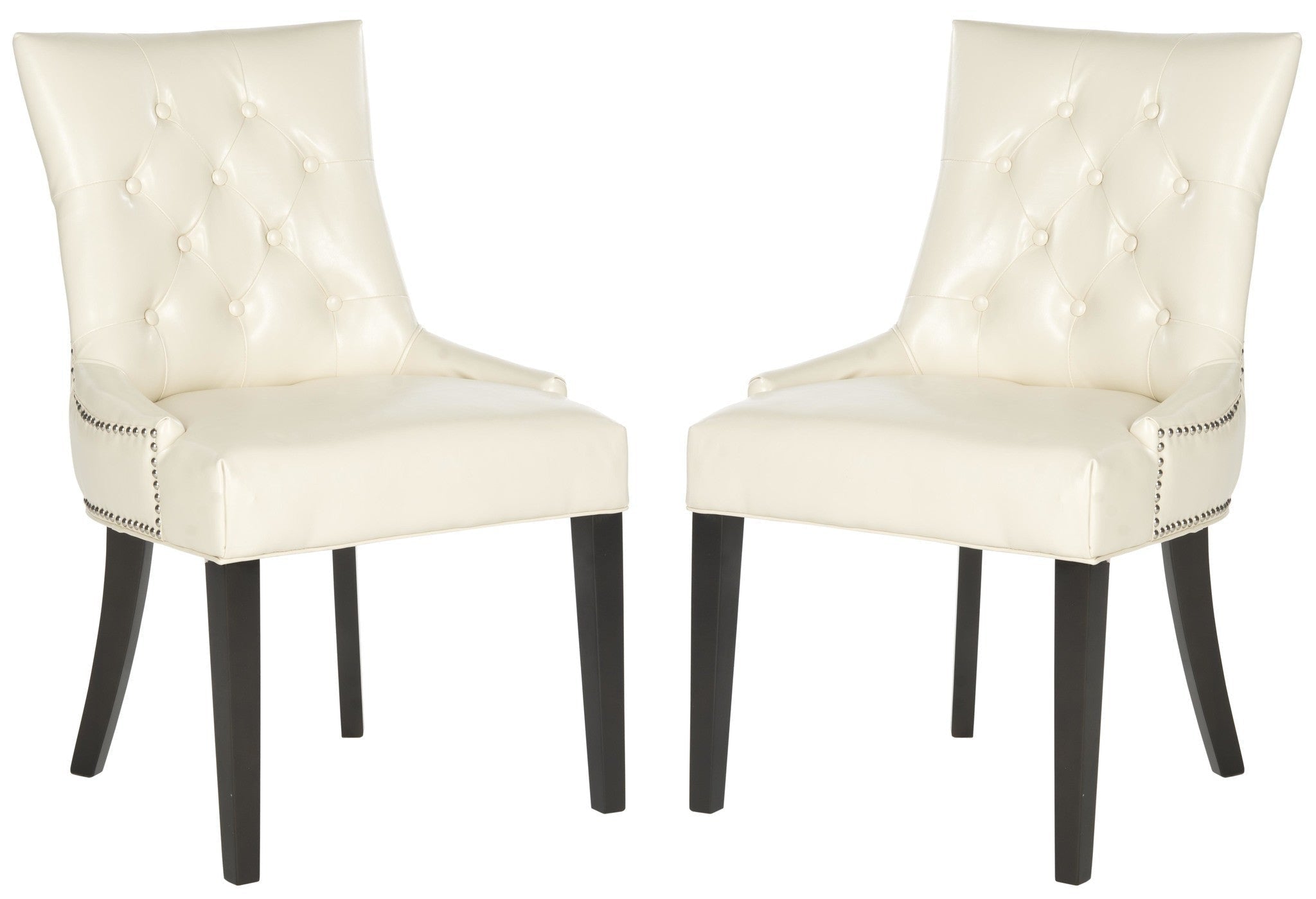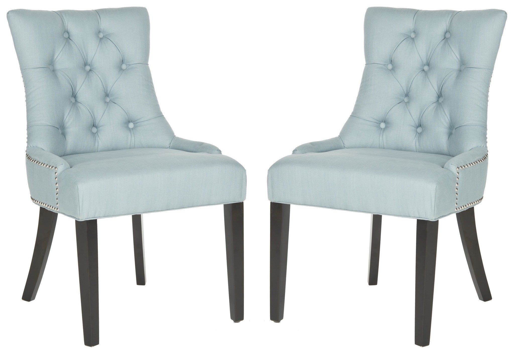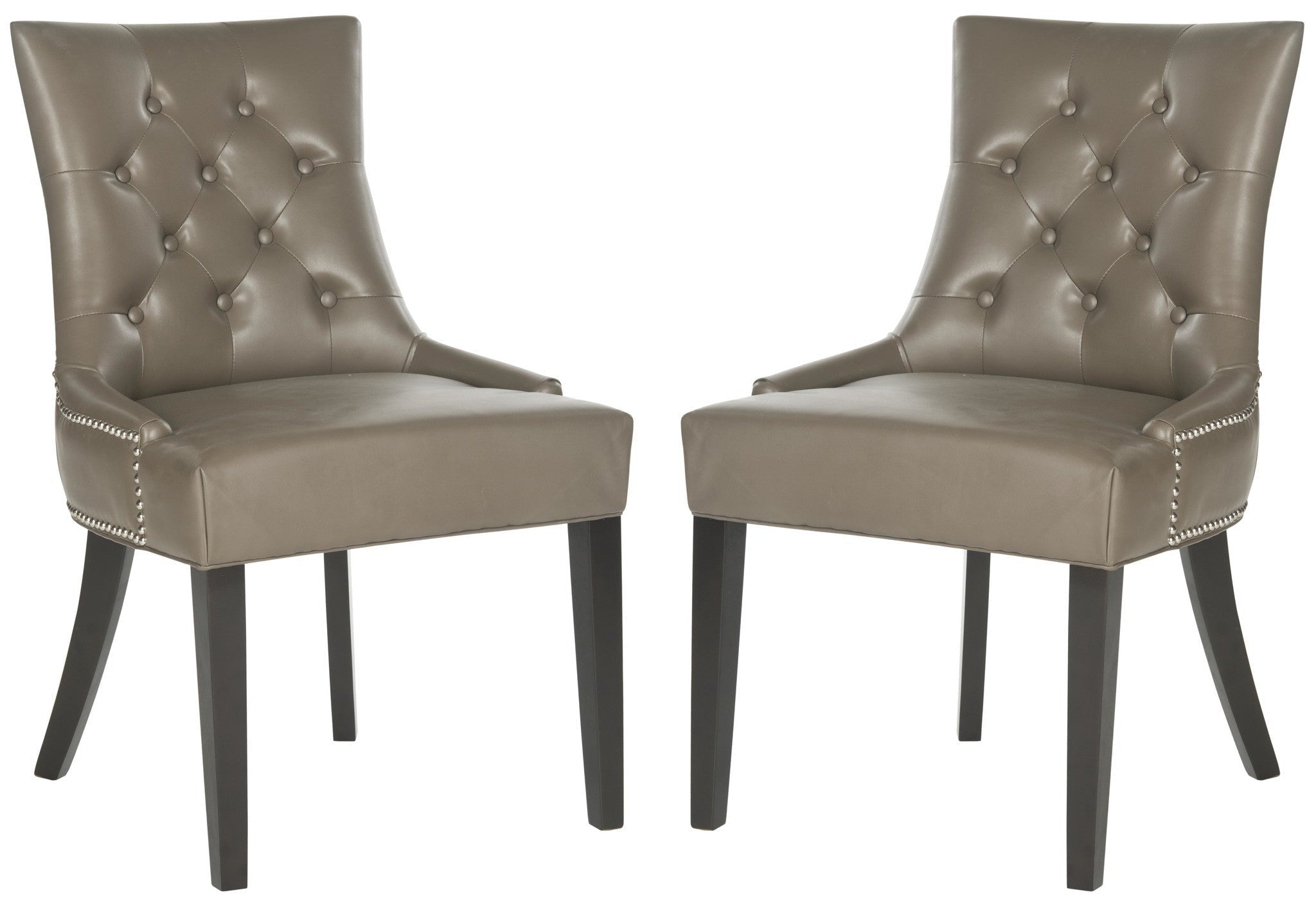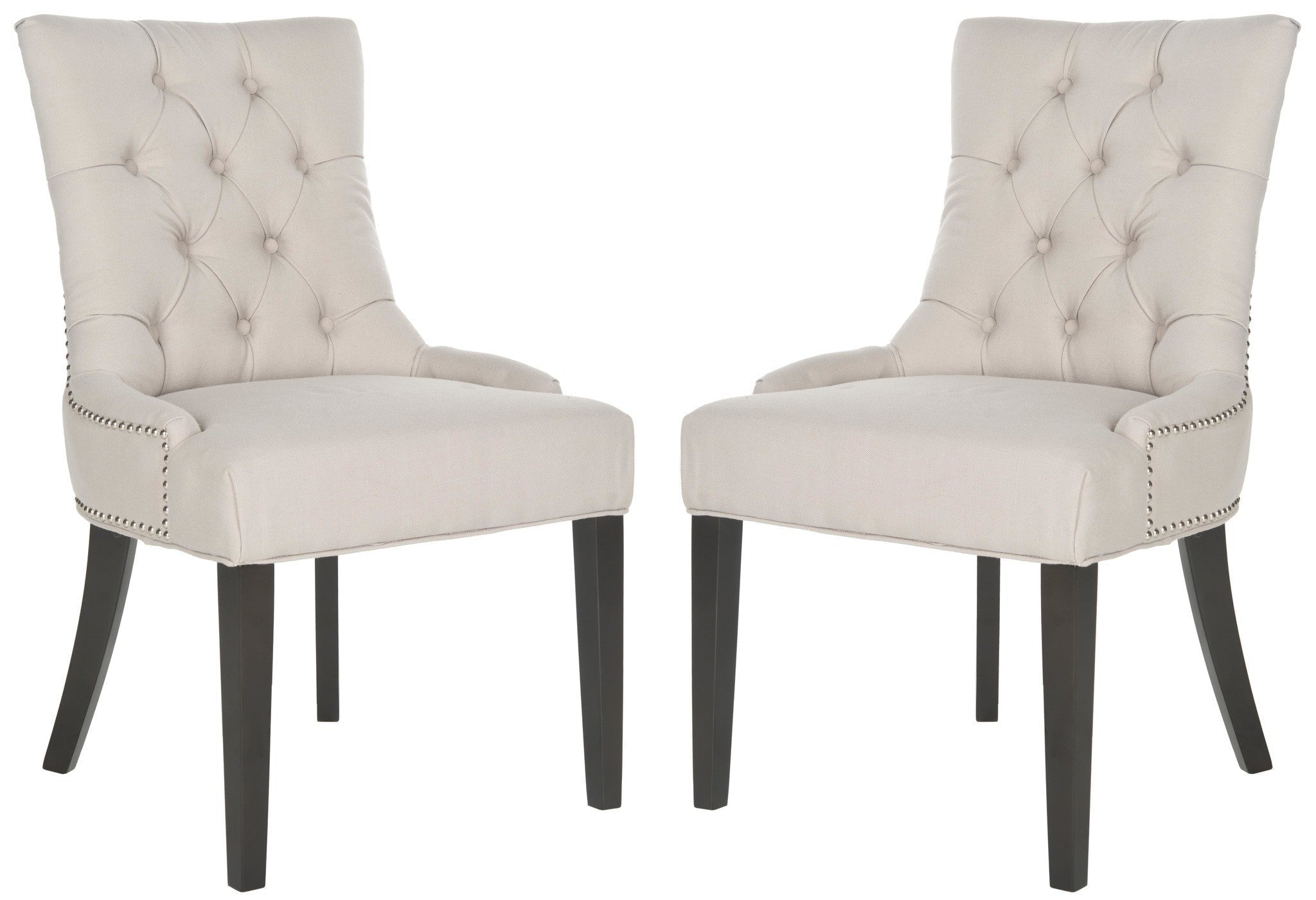 Brimming with designer details, the stylish Harlow ring chair by Safavieh transforms any dining room with instant glamour. Dressed up with silver nail heads and a clever metal ring on its back, Harlow is shown in taupe linen with birch legs in espresso. Button tufts on the front of the tapered backrest add to the allure of this set of two chairs.