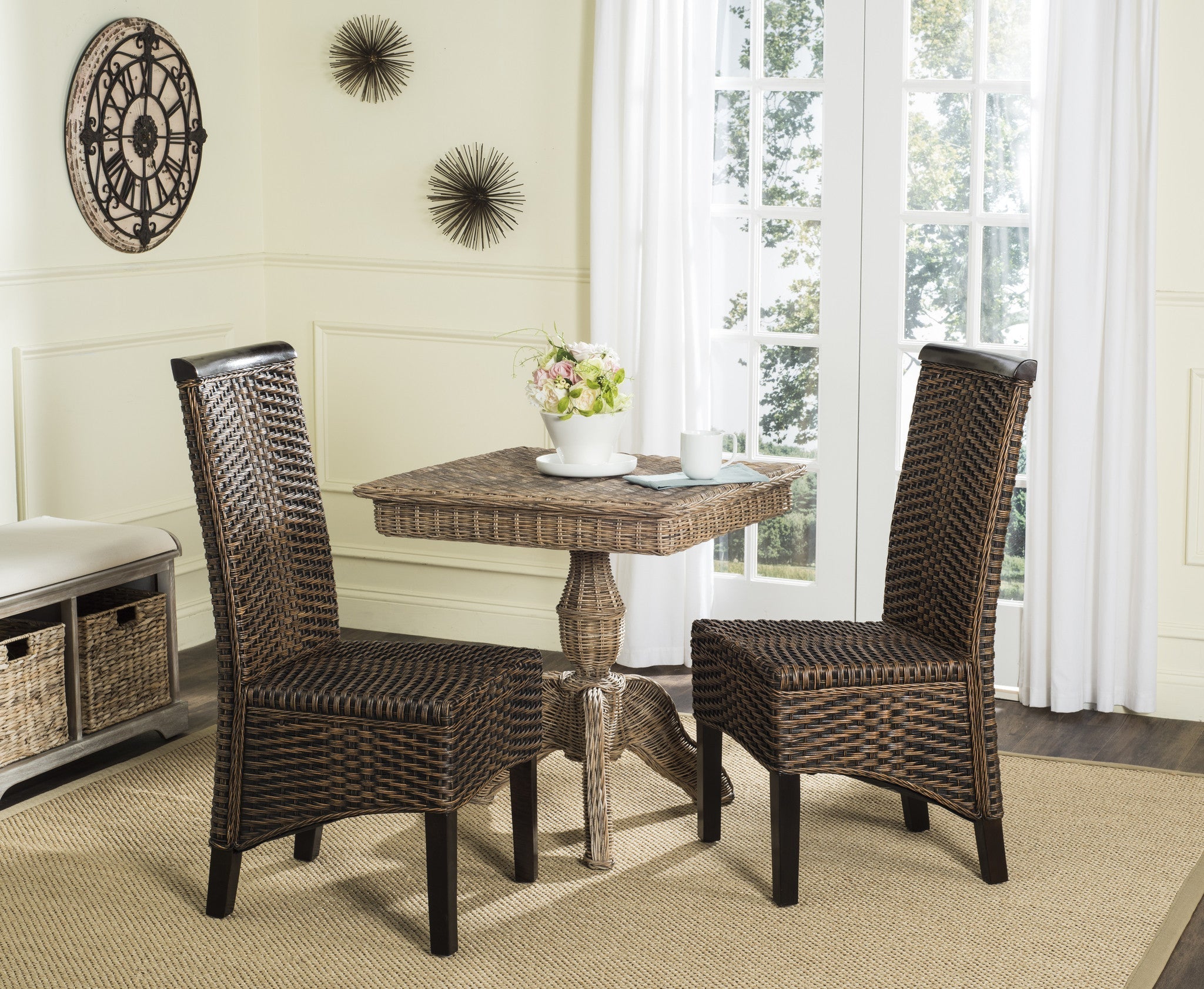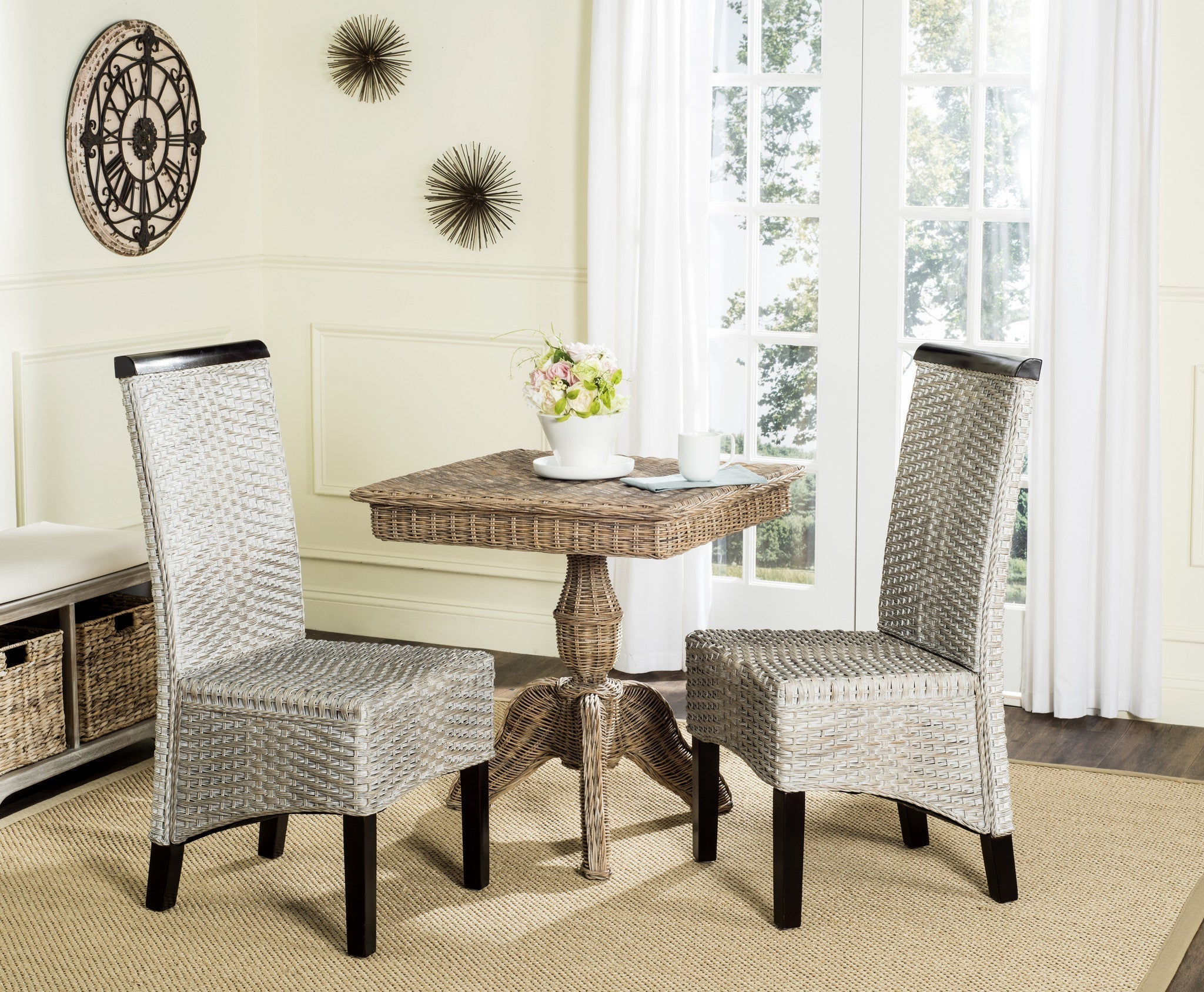 Rich in designer details, this transitional set of two grey wicker dining chairs adds a luxury look to dining rooms, kitchens and casual spaces. Crafted of rattan with contrasting legs and accent bands on seat backs of hardwood in a dark mahogany finish.