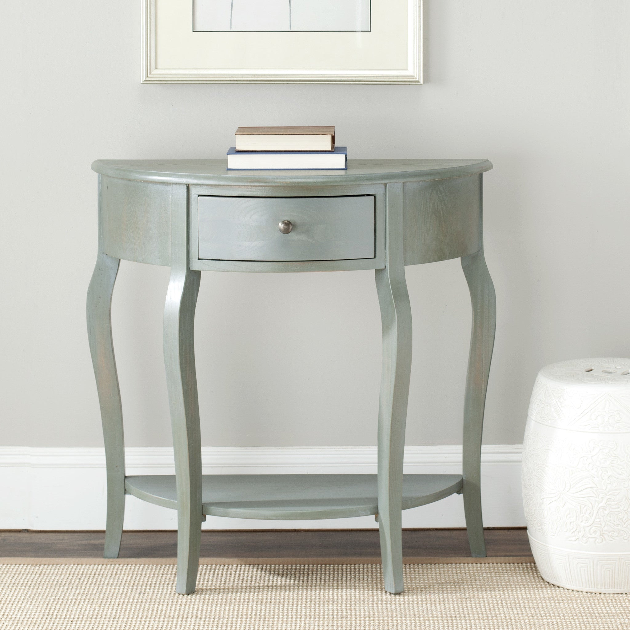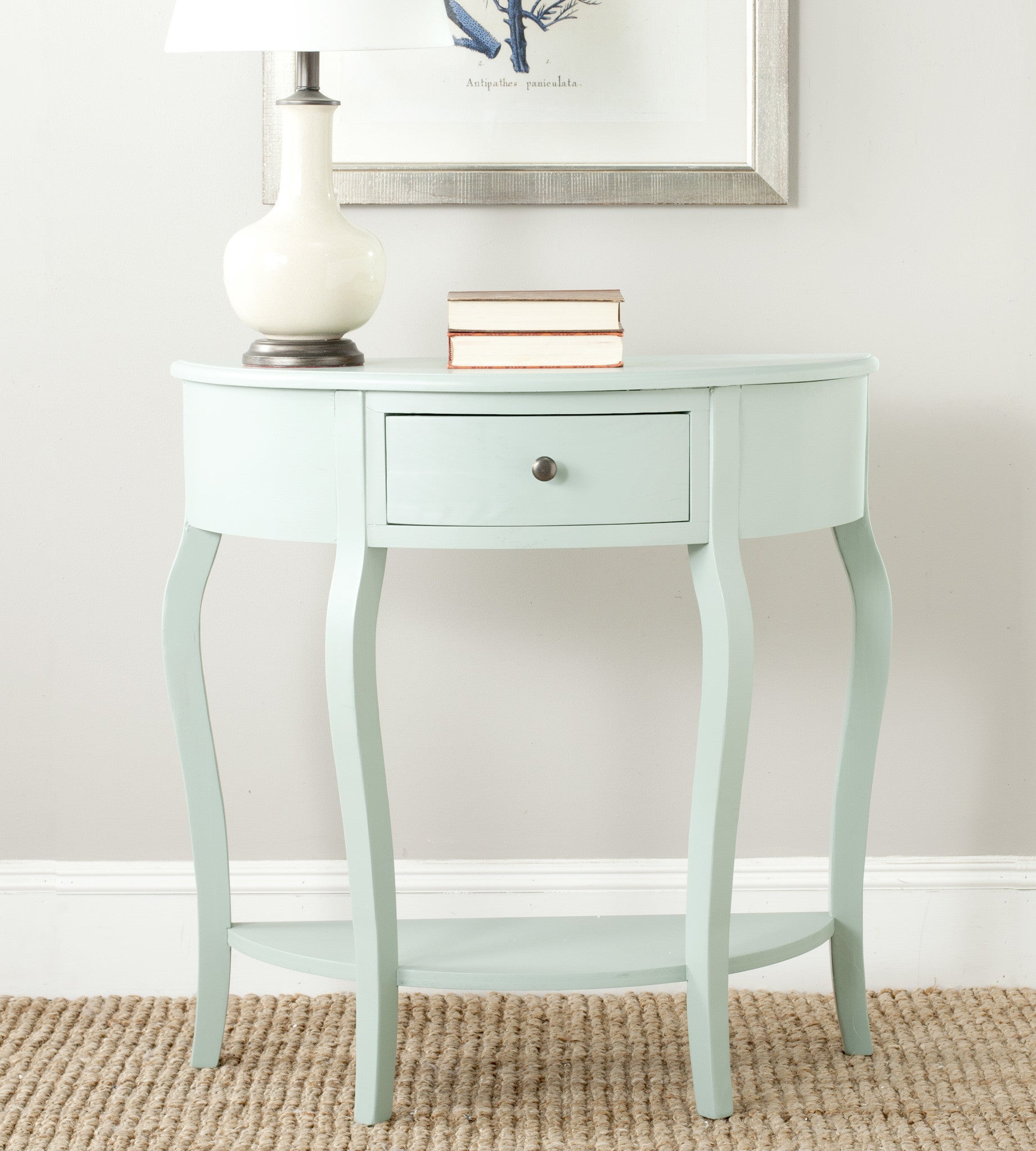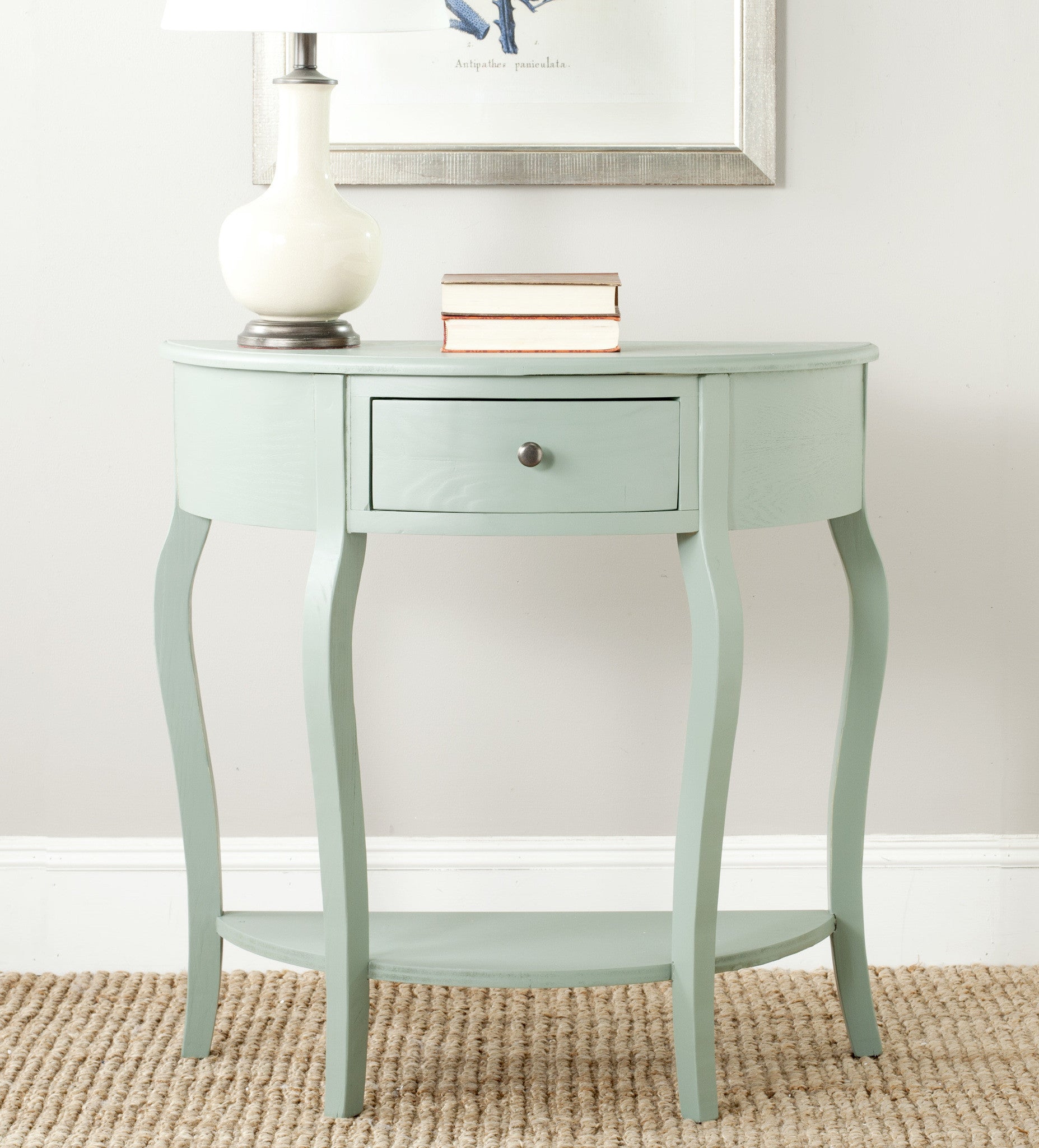 Despite its diminutive stature, the Jan demilune console has presence. Classic and elegant, but Nt stuffy, the piece is crafted of elm wood with whitewashed finish and features gentle curved legs paired with a drawer and shelf. Form and function exist in perfect harmony with this transitional console.