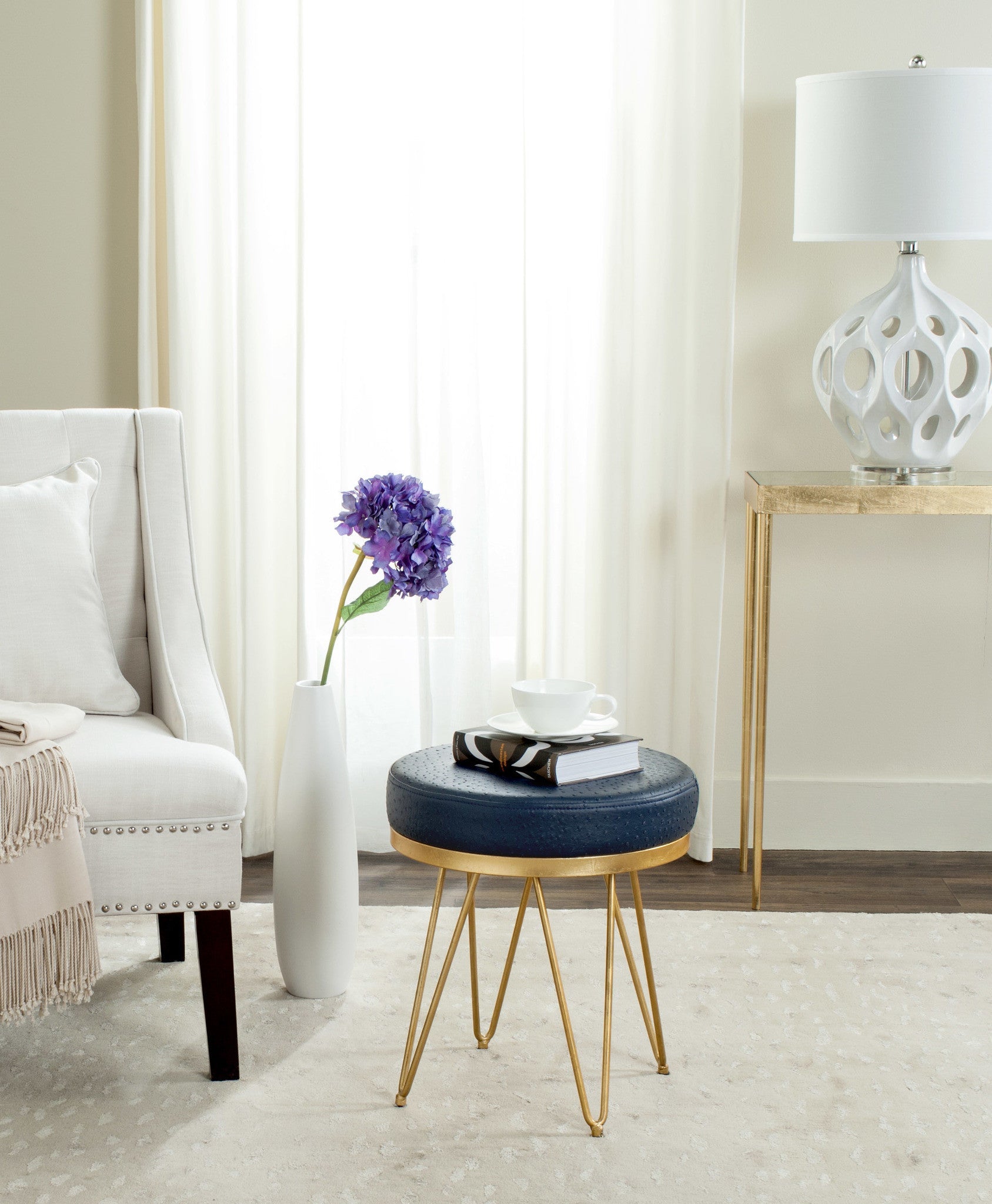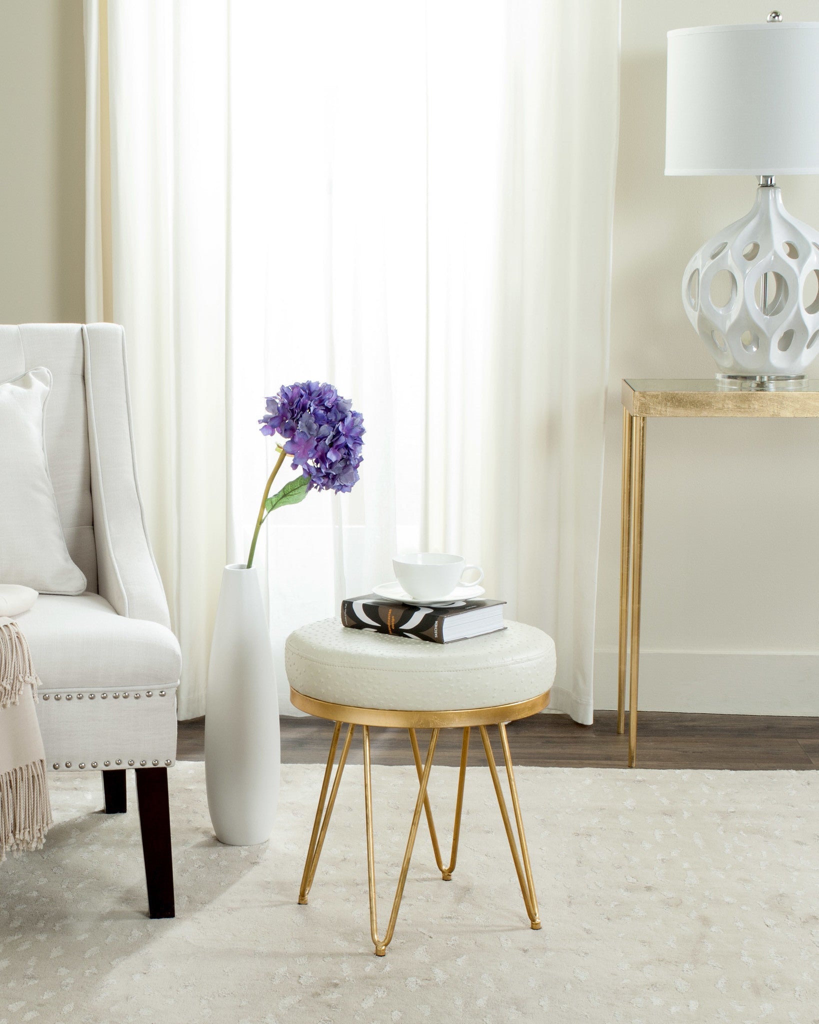 Interior designers love this modern round bench. Inspired by the gracious, feminine style of one of Beverly Hills legendary grand hotels, this classic piece boasts a gold finish and refined cr¨me upholstery. Perfect for a cocktail or an extra seat.