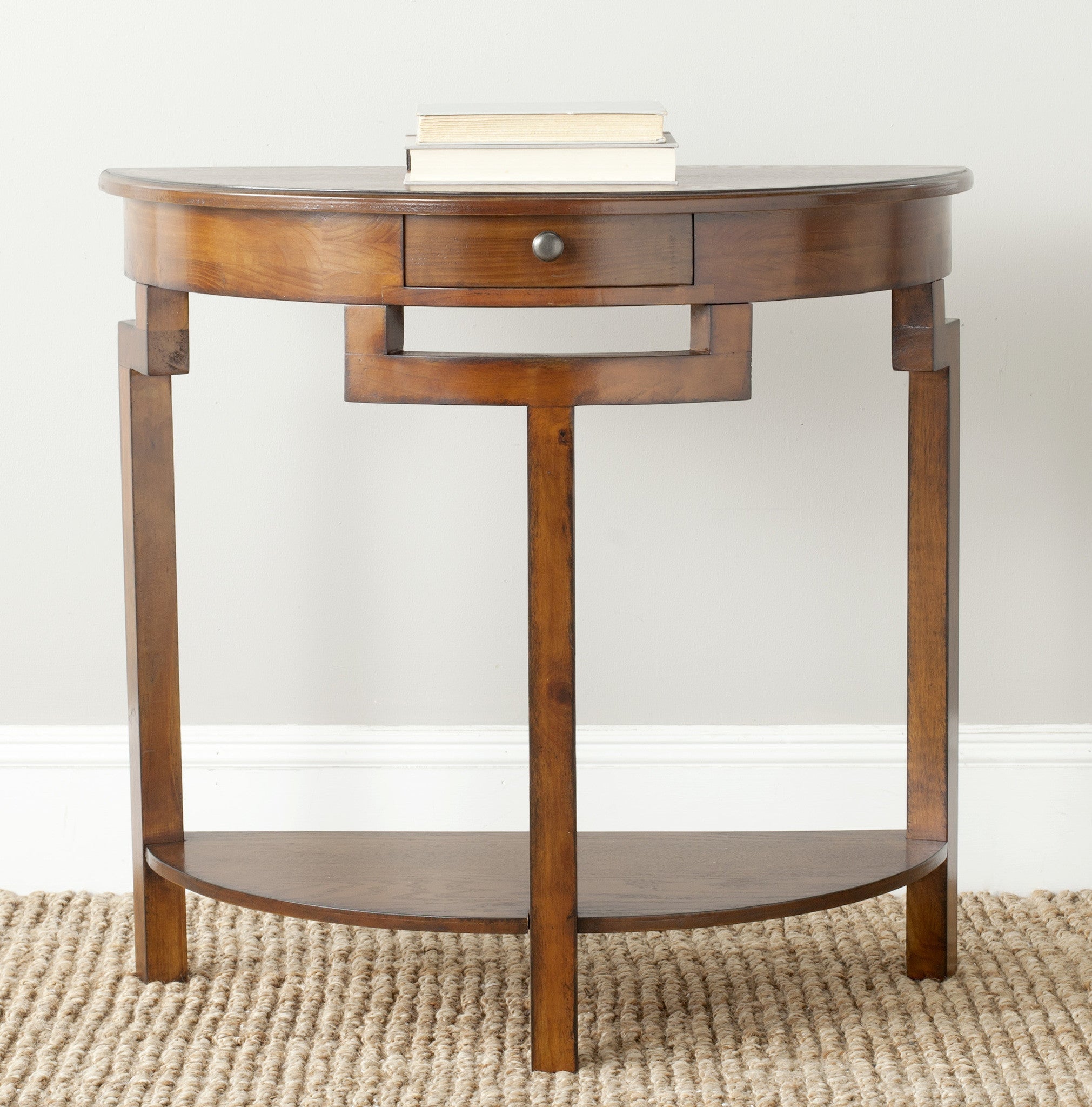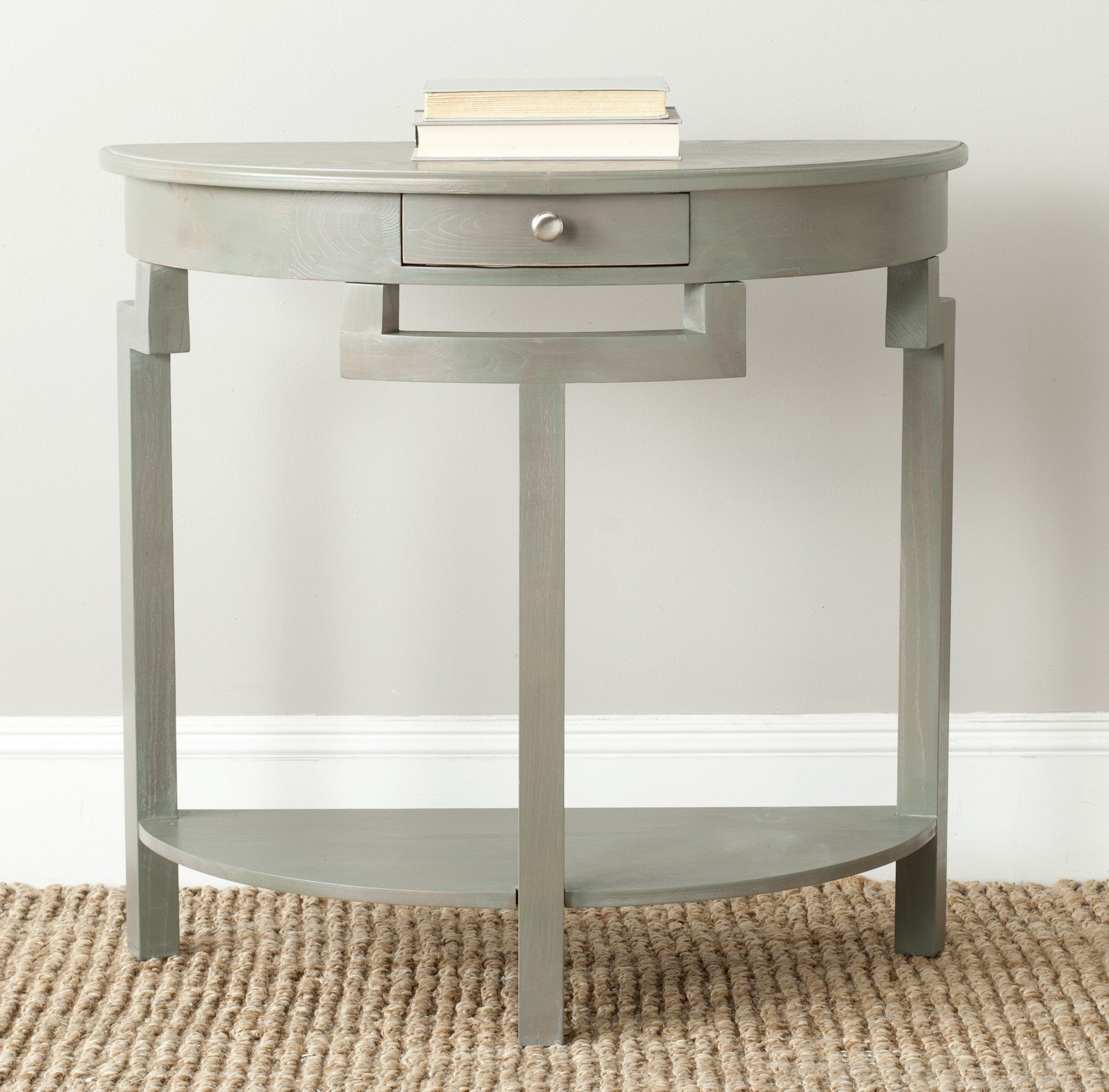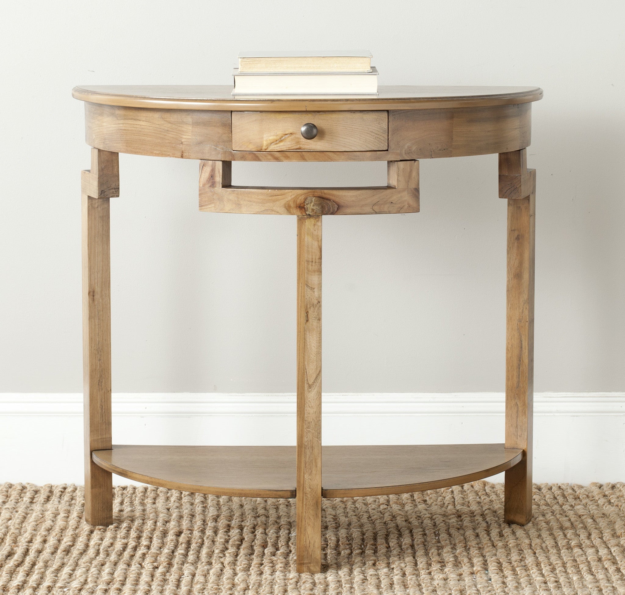 A handsome demilune table for an entry hall or living room wall, the Liana console is transitional with an industrial chic edge. Crafted of elm wood in an ash grey finish, Liana has a handy drawer and lower shelf for magazines or accessories.
