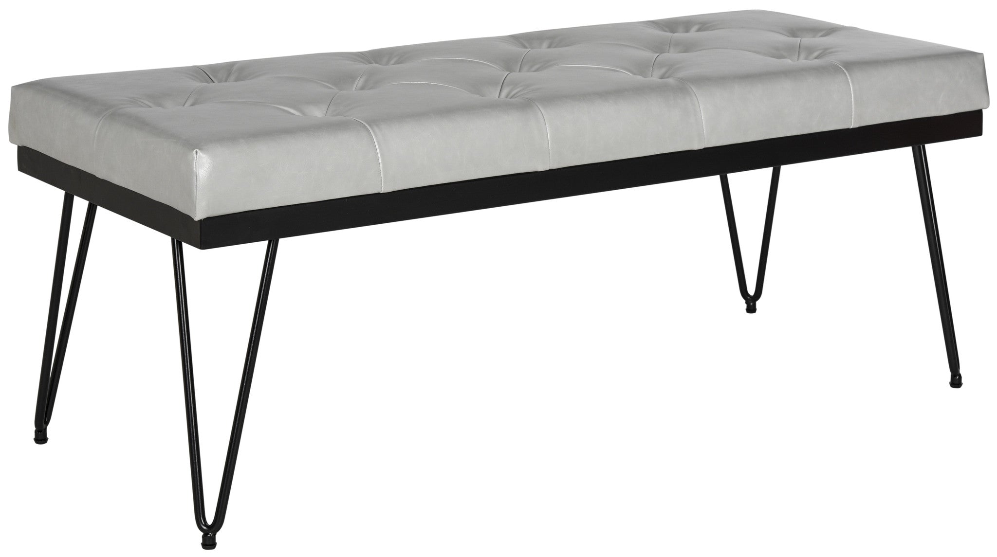 Sleek and sculptural, this chic new design takes the viewing bench to a new level of sophistication. With grey PU leather upholstery and black hairpin legs, it offers extra seating in the living room or bedroom, as well as a bit of architectural interest.