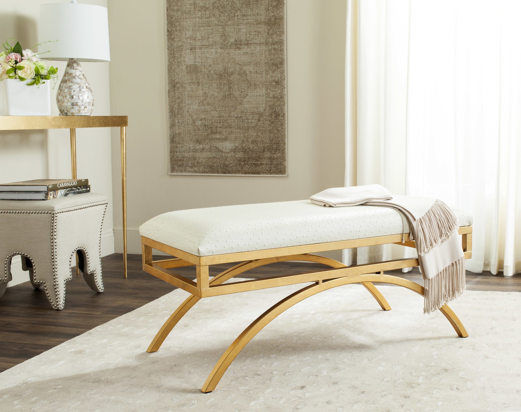This radiant arc bench was inspired by the iconic modern pieces of Italian designer Gio Ponti. Sleek and sophisticated, its tailored upholstery complements its warm gold finish. Ideal for extra seating, a glass of wine, or even as a bench in the boudoir.