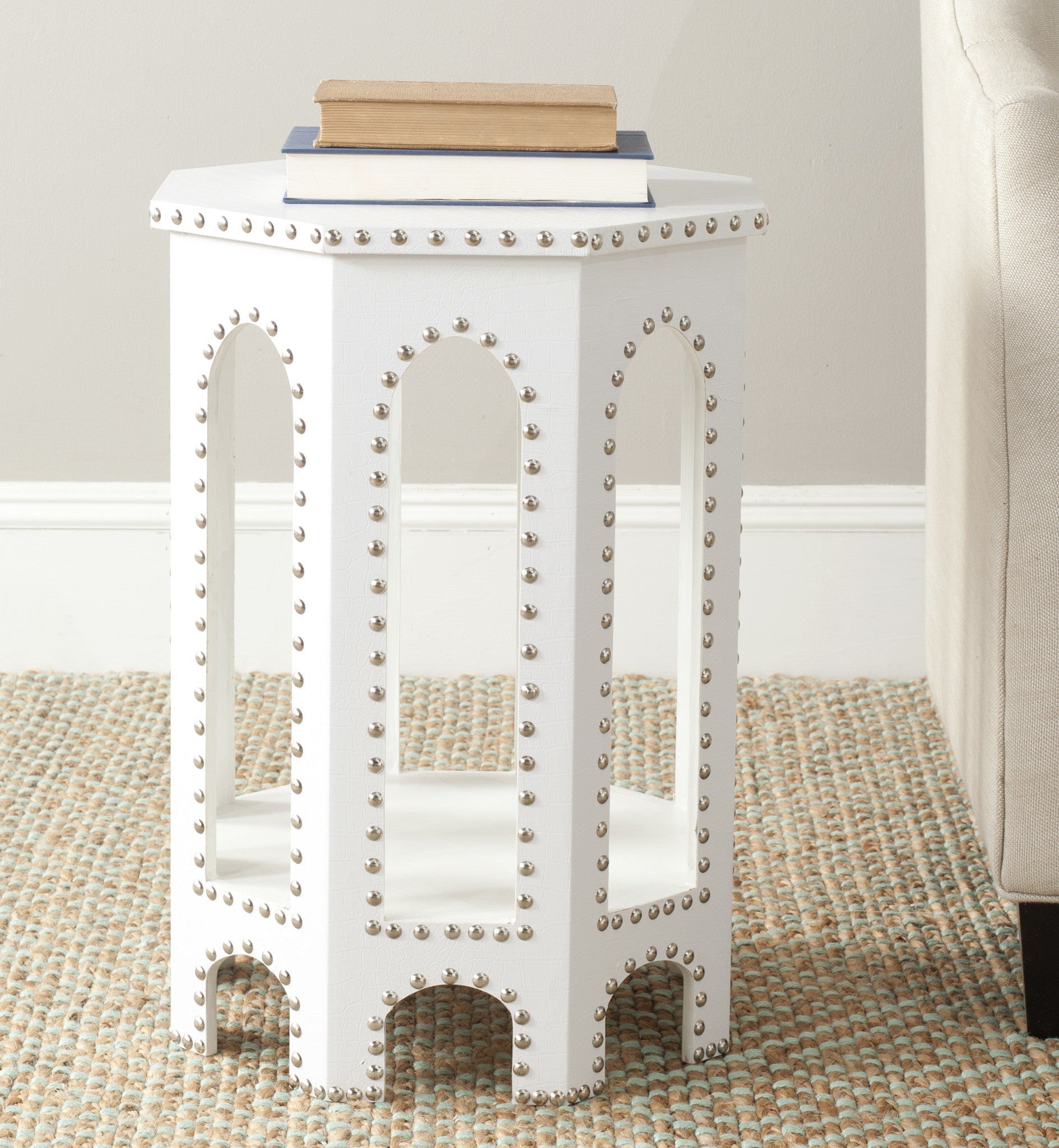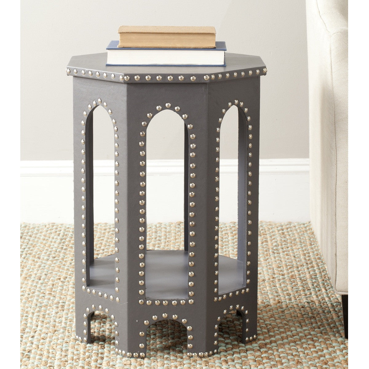 Inspired by the timeless, romantic feeling of gothic arches, the White, Green, Grey, Charcoal Nara Side Stool offers a contemporary spin on classic style. Crafted with iron nail head detail, its six sides blend geometric form with a fresh, solid palette.