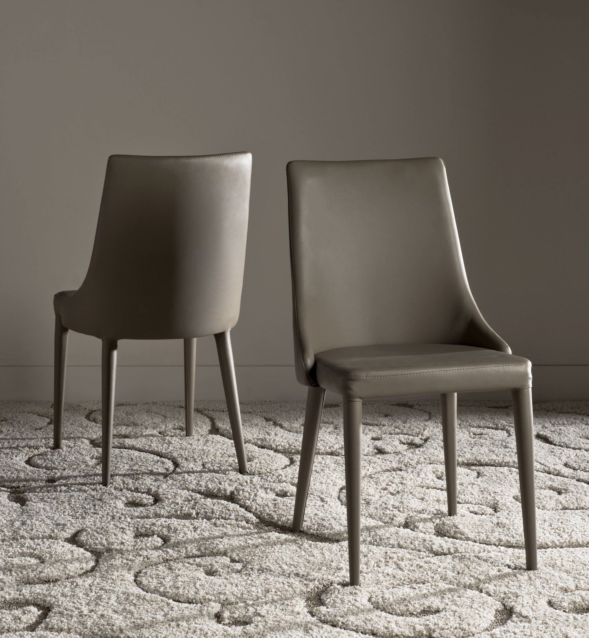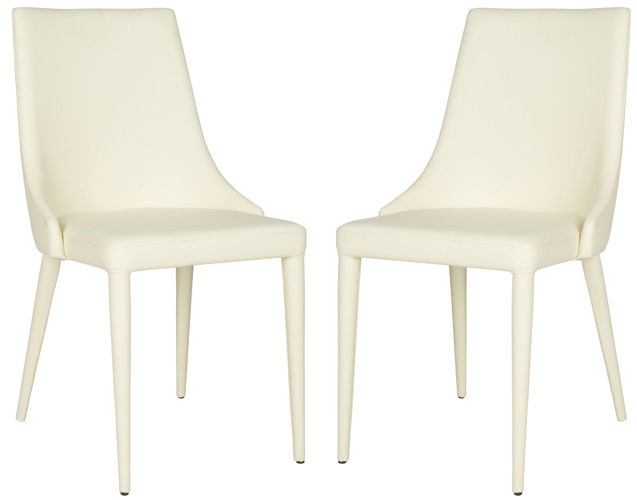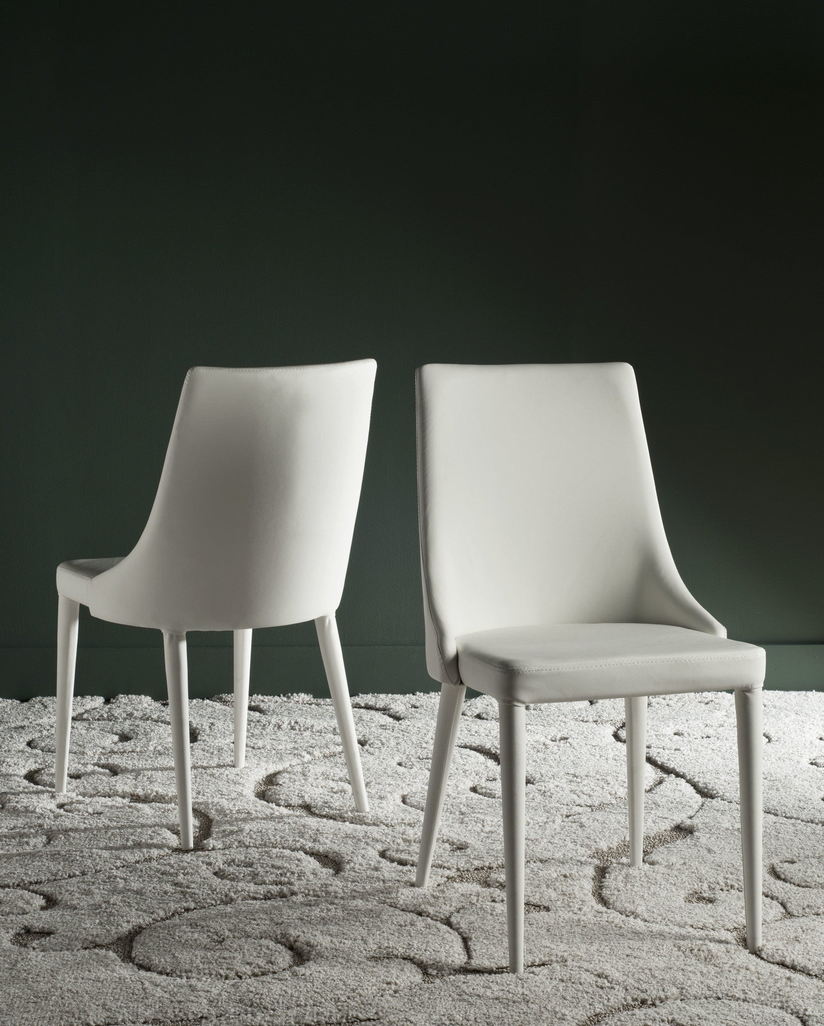 The white chair becomes an ideal dining companion when it's crafted of easy-care PU leather and a sturdy iron frame. This smart set of two side chairs combines the sleek style of the deco barrel chair with contemporary lines inspired by London's skyline.