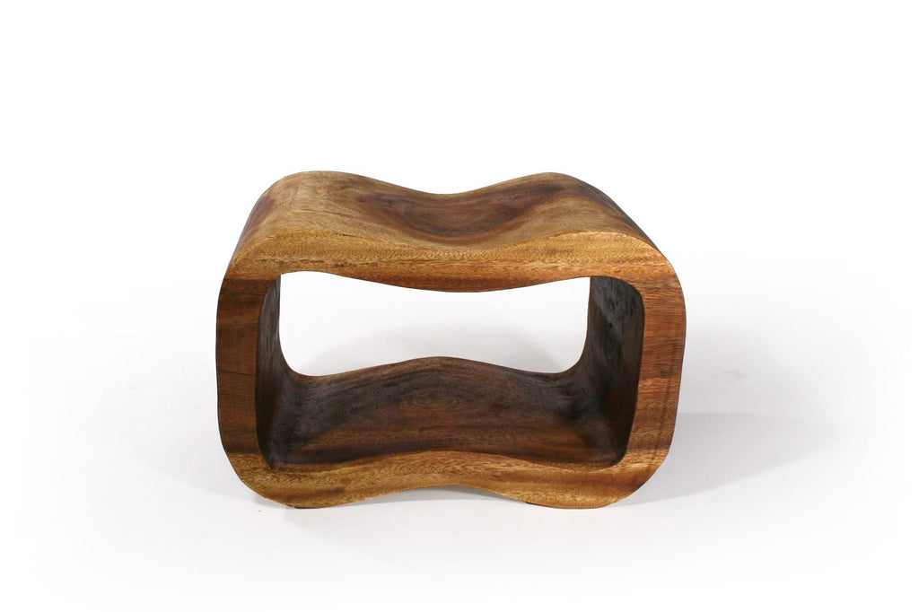 This is by far the most unique one piece bench we have ever seen. It is carved from a single solid piece of Monkey Pod wood leaving a thick wall on four sides and scooped top providing for a comfortable sitting area and extremely sturdy and useful storage area. The bench can also be set on it™s end for use as a stool, end table, or striking accent piece. It measures 24 inches long x 13.5 inches high x 15 inches wide. These benches are also finished in eco-friendly Livos Black Walnut Oil, with light and dark variations throughout the piece.