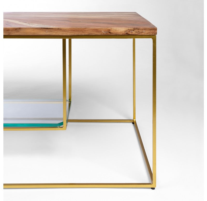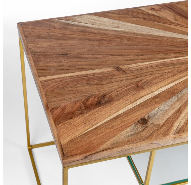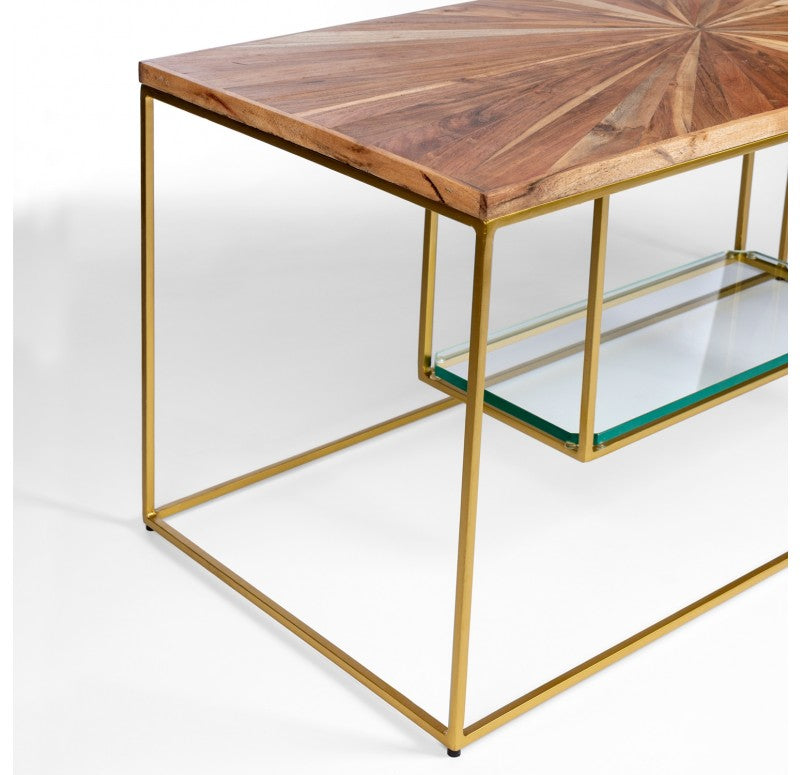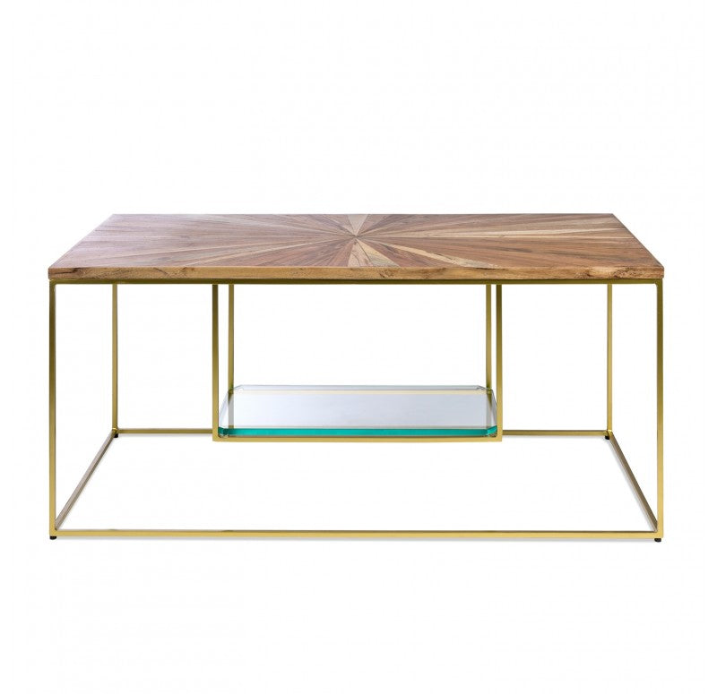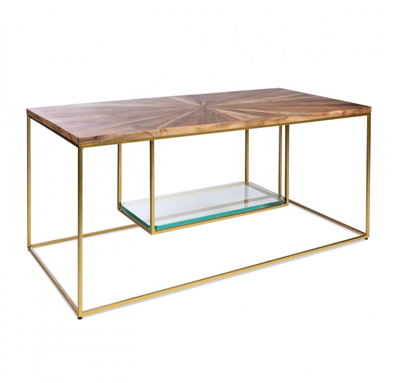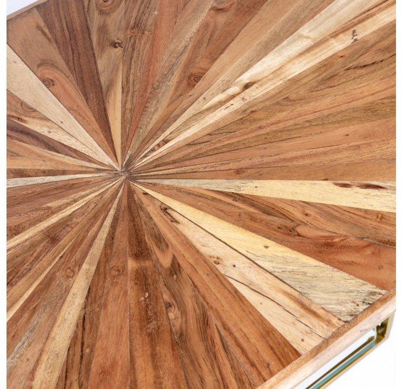 The table top is hand crafted of radiating mixed wood shapes and the base is made of durable powder coated iron with levelers. The surface will have textural differences between each intricate piece of wood. Exposed nail holes. The thick glass lower shelf is removable. Indoor only. Truck shipping. Weight: 37.5 lbs.