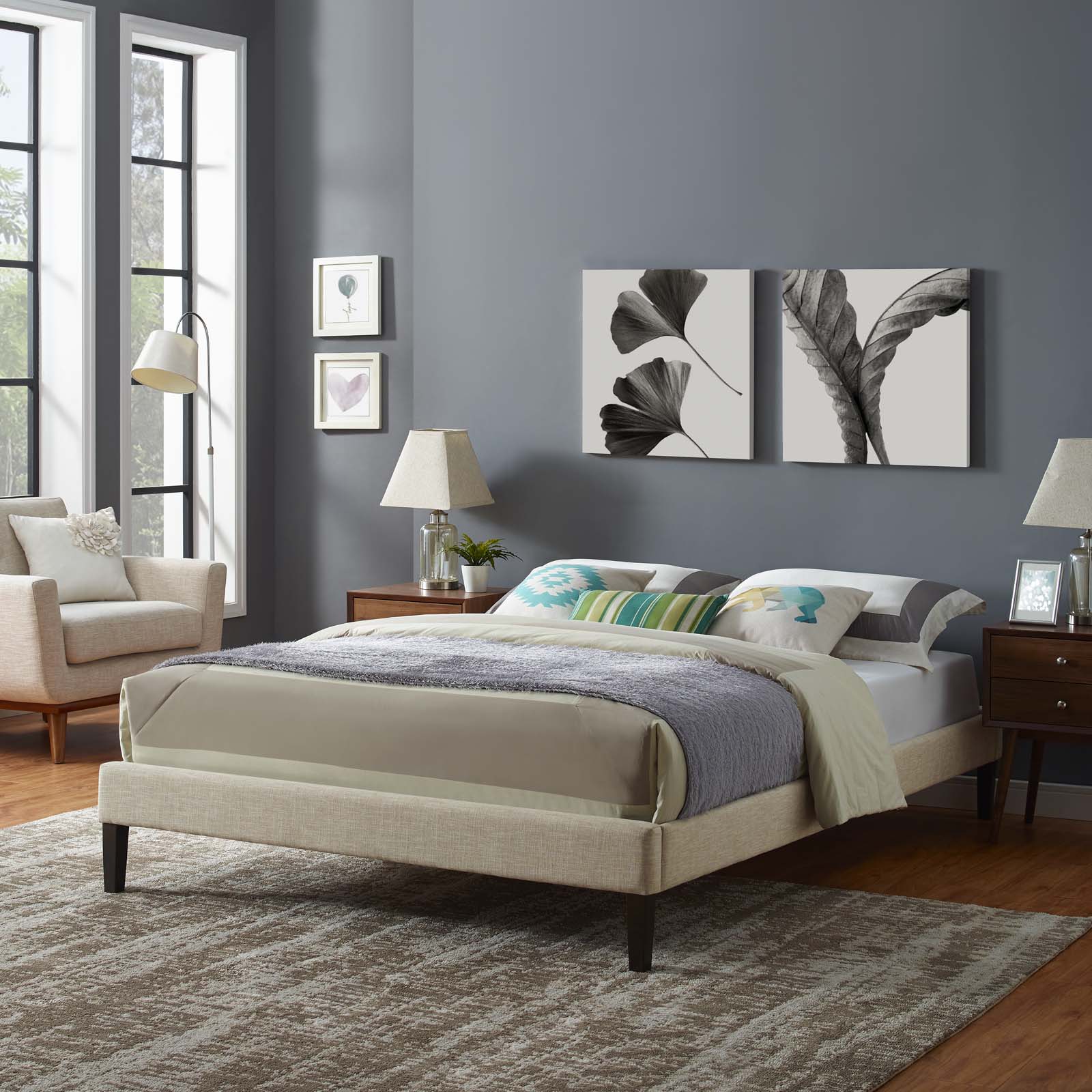 Accelerate your bedroom decor with the Tessie Platform Bed. Made with a solid wood frame upholstered in polyester fabric, Tessie features tapered wood legs, plastic foot glides, ten sturdy wood slats with a centered supporting bar and two support legs for enhanced stability. Due to the wooden slat support system, the use of a box spring is unnecessary. Tessie supports memory foam mattresses such as our Aveline series, and is compatible with one of our headboard styles: Jessamine, Terisa, Laura, Phoebe, Camille, and Josie. Perfect for mid-century modern, minimalist and contemporary bedrooms. Mattress not included. Set Includes: One - Tessie Bed Frame