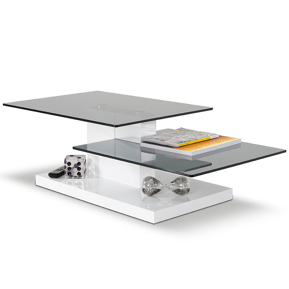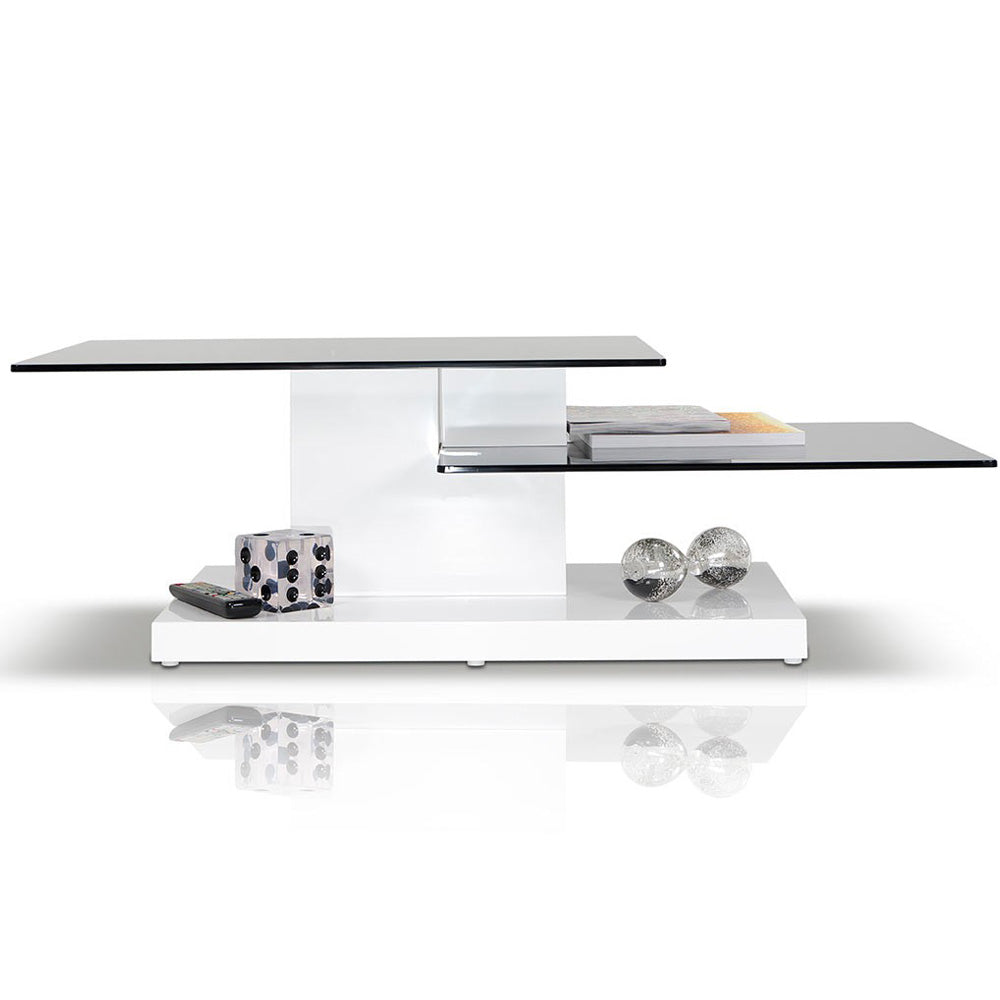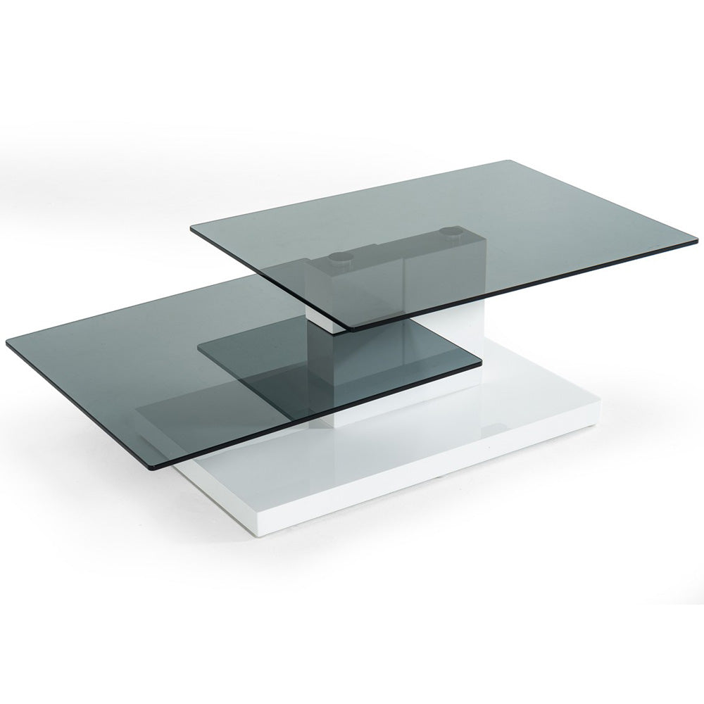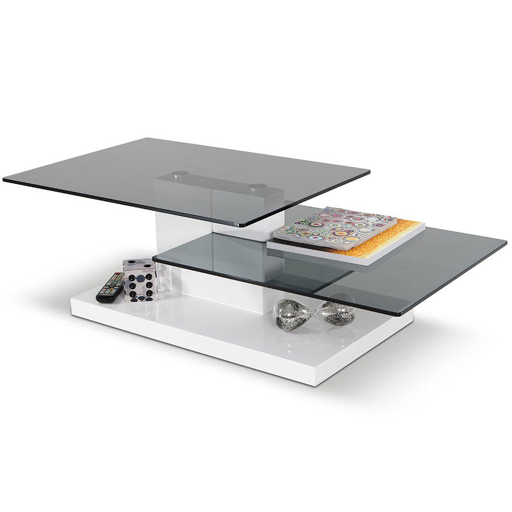 Two tiers of black glass stair-step downwards towards the white high gloss base to provide additional storage space while creating an intriguing design. Rounded glass edges administer a safer living environment.