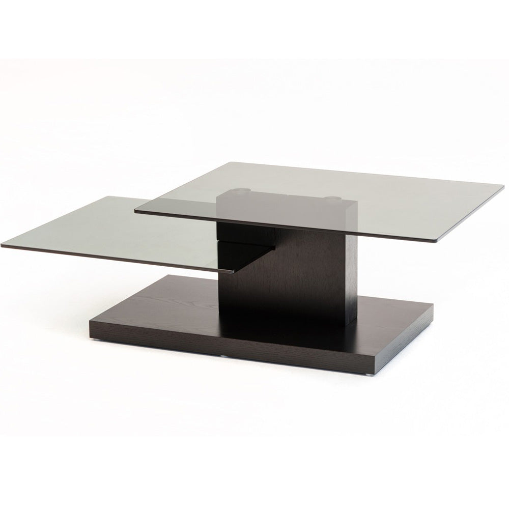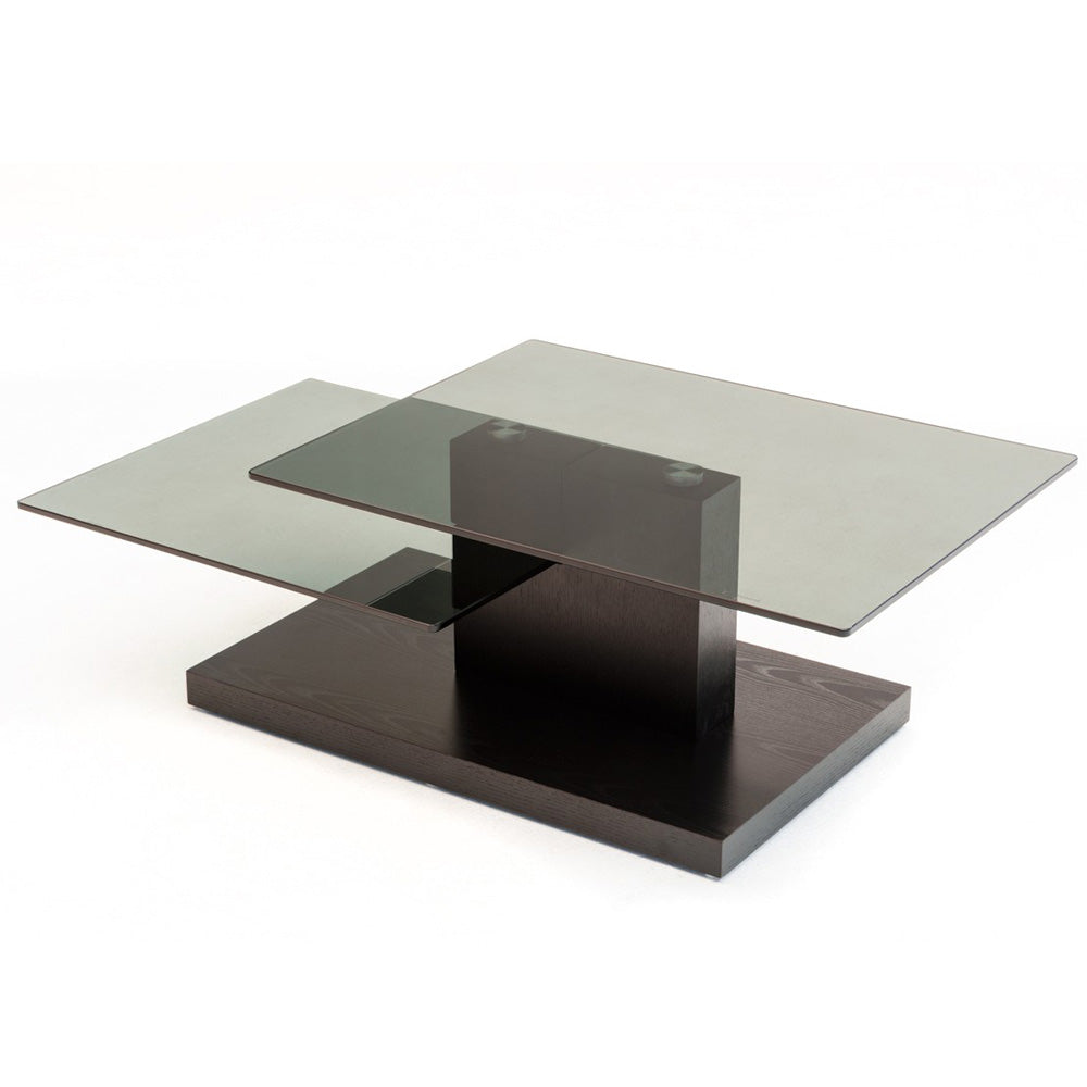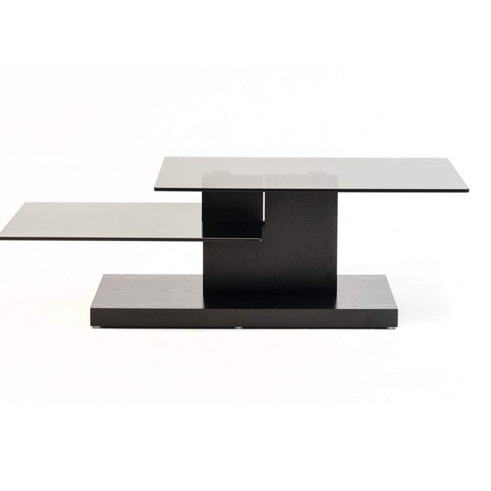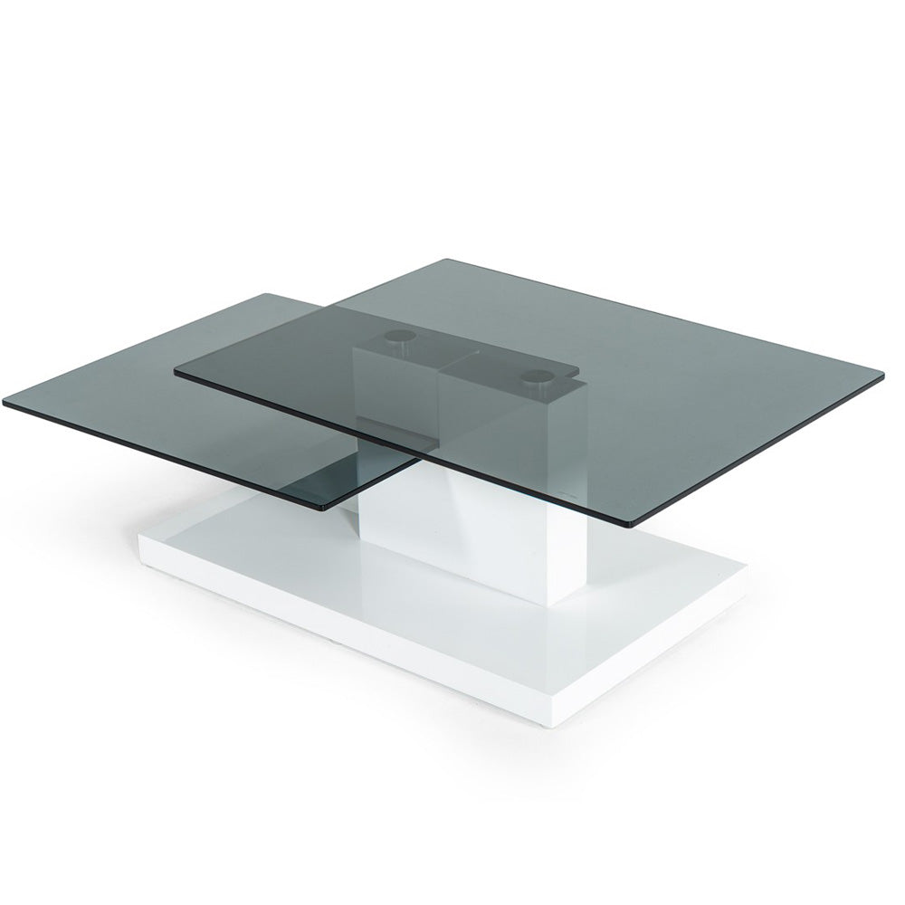 Two tiers of black glass stair-step downwards towards the white high gloss base to provide additional storage space while creating an intriguing design. Rounded glass edges administer a safer living environment.