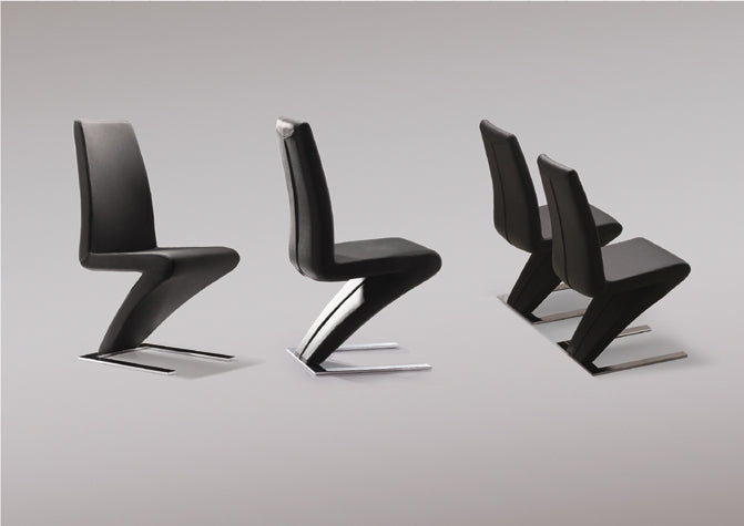 Dine in style with the Zayd Dining Chair. The unique “Z”-shaped design is accentuated by the ¾ square stainless steel base and black leatherette upholstery. Available colors include white, grey, black and espresso.
