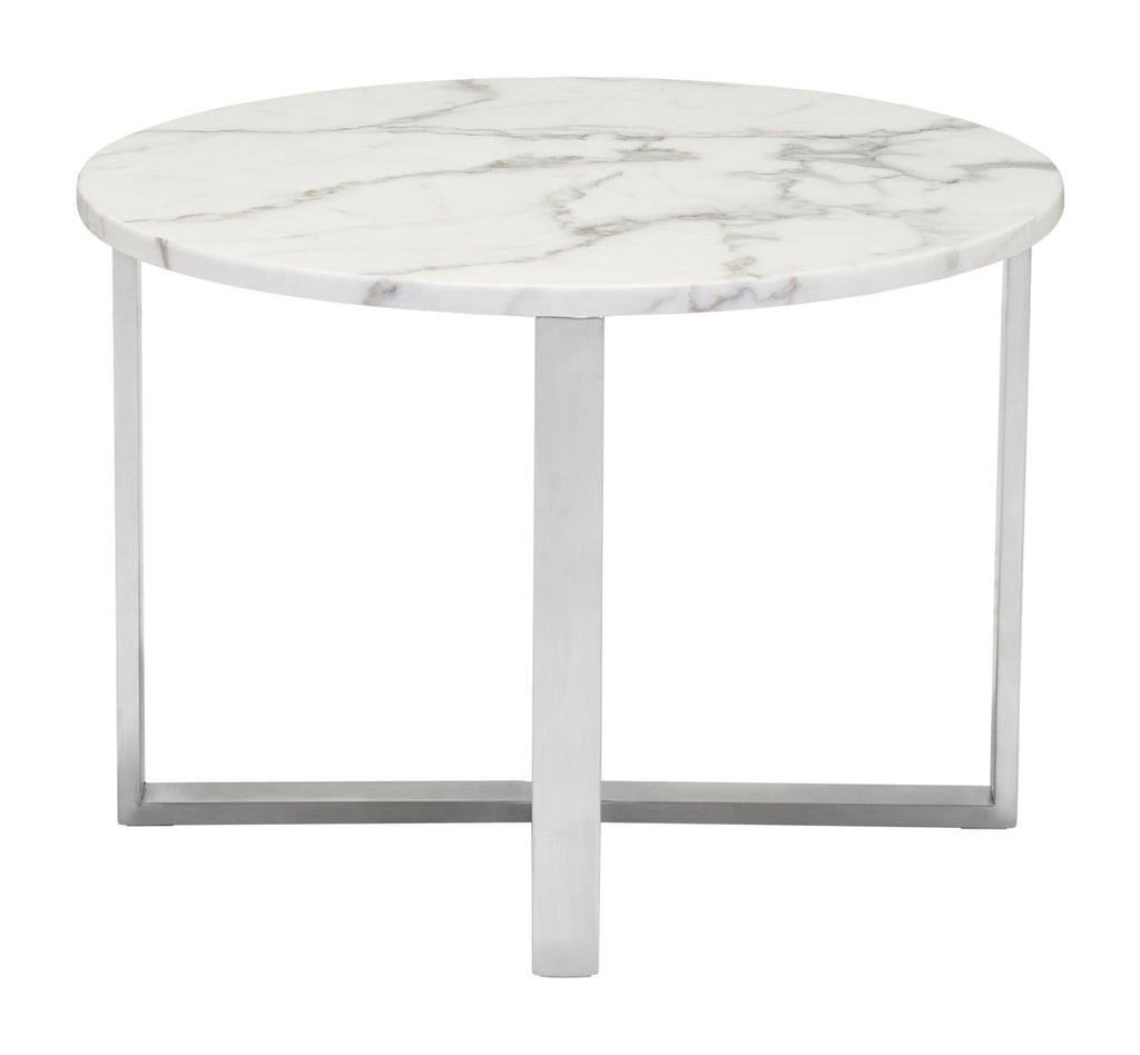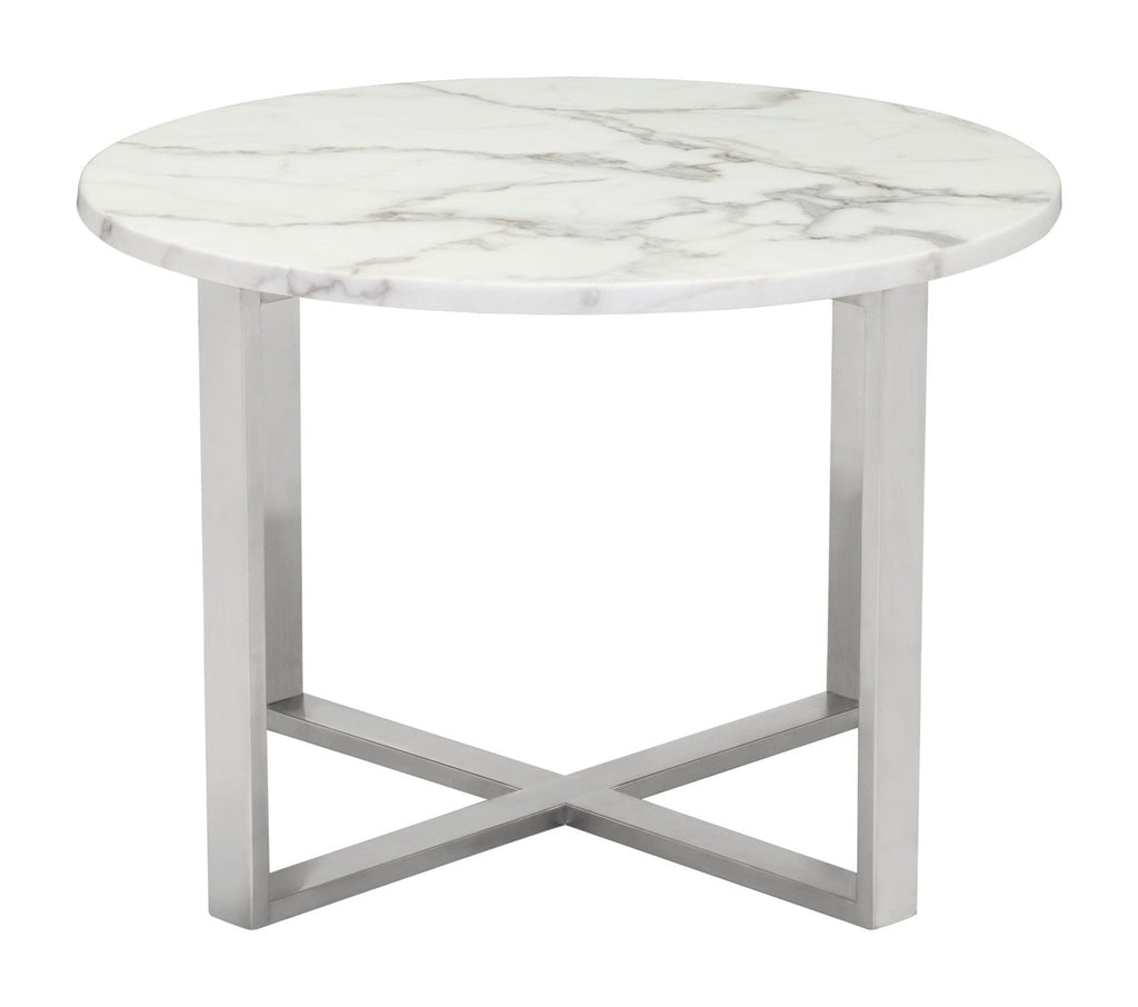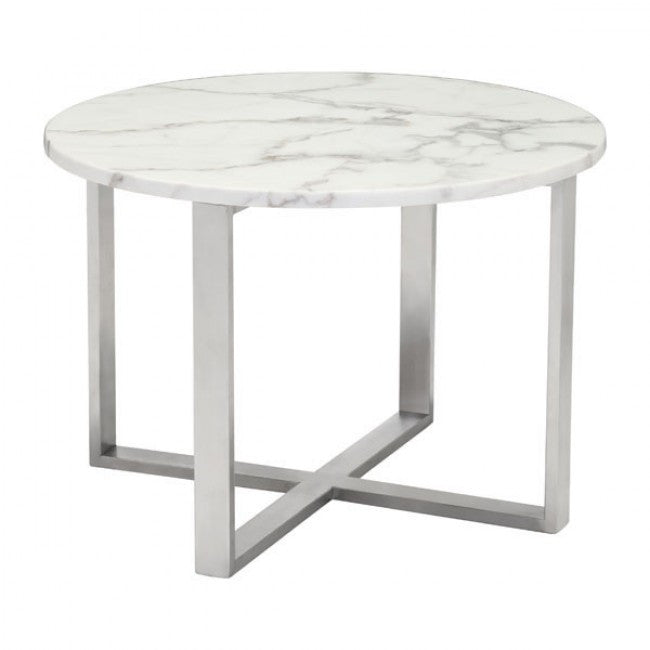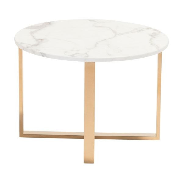 Posh sophisticated elegance; the Globe end table features a slim cross style base in stainless steel finished in bright Gold; supporting a stunning faux marble round top.