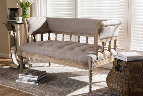 Baxton Studio Nora Swedish Gustavian Style Distressed Oak Wood Linen Upholstered Sofa Settee