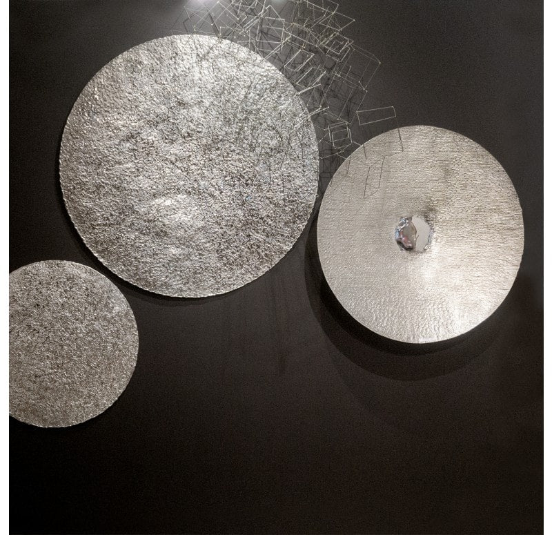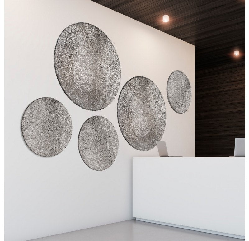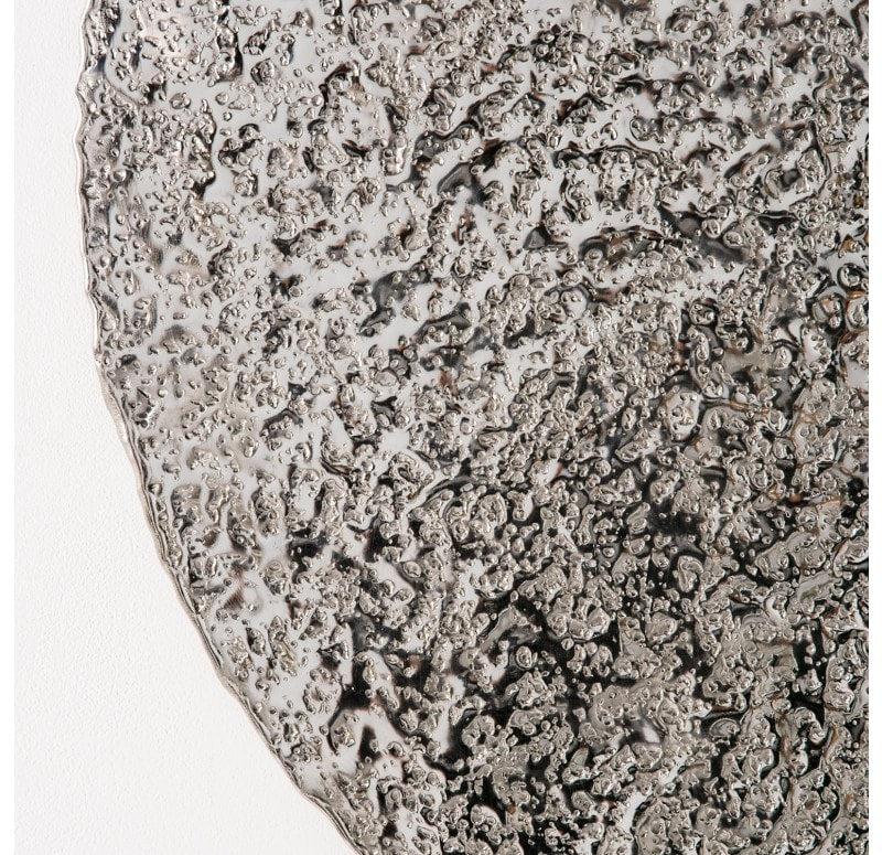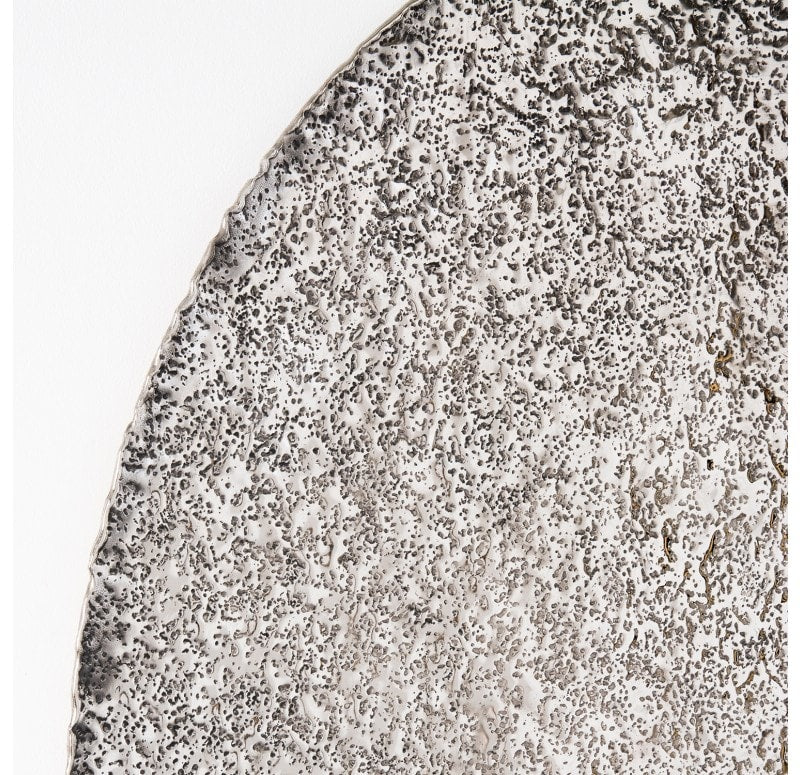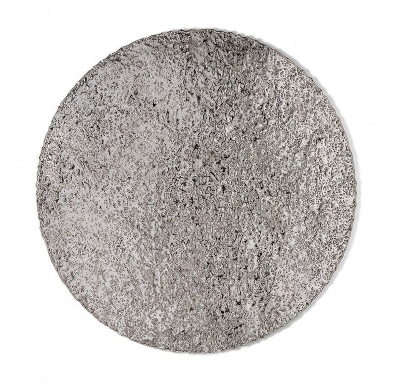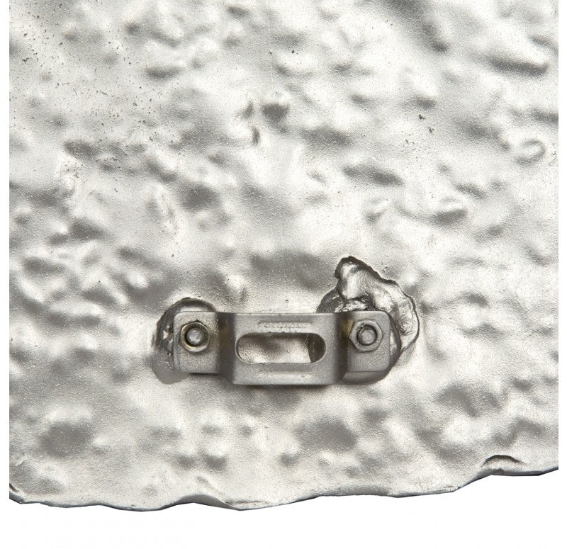 Flat shape. Hand hammered, each different. Cleat hanger included. Outdoor friendly but will oxidize over time. Weight: 6.4 lbs.
