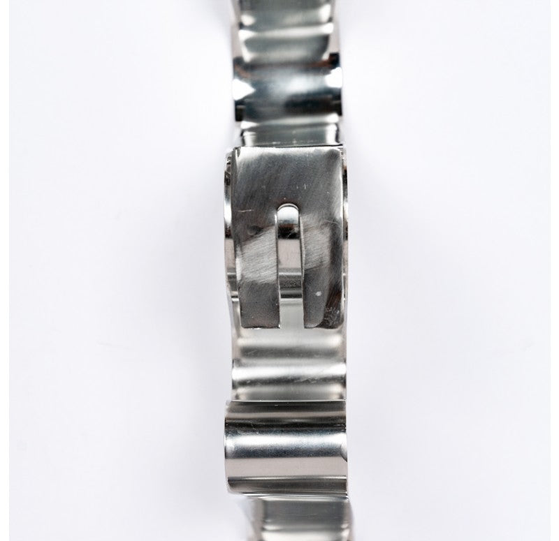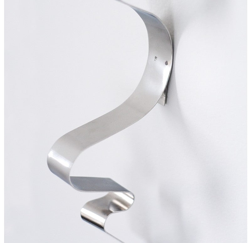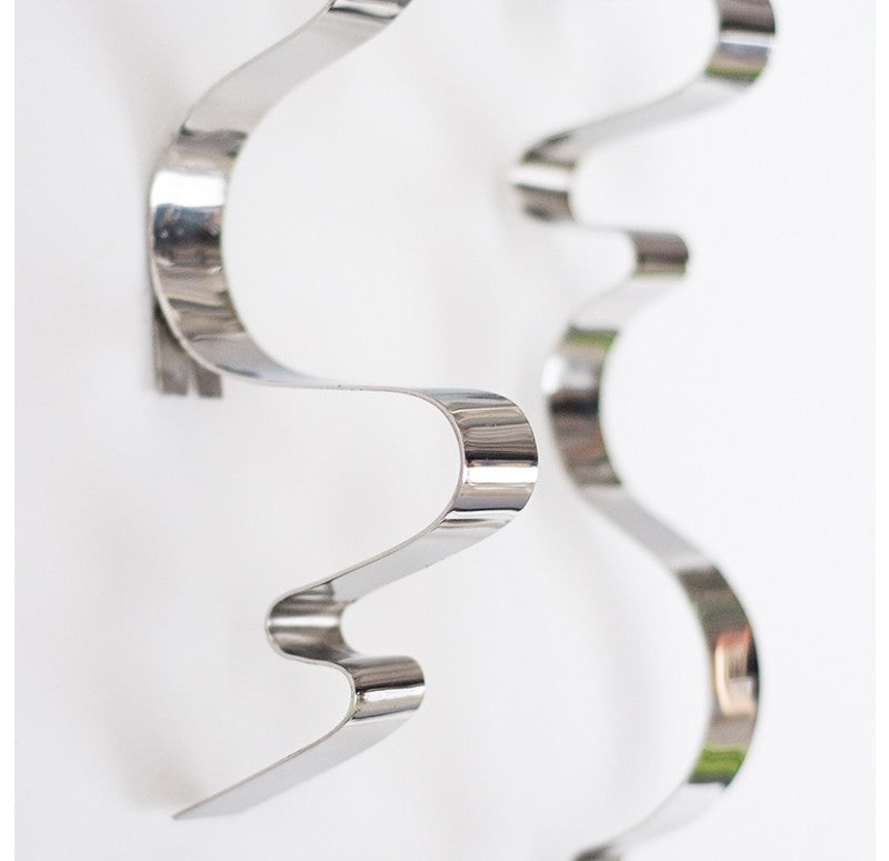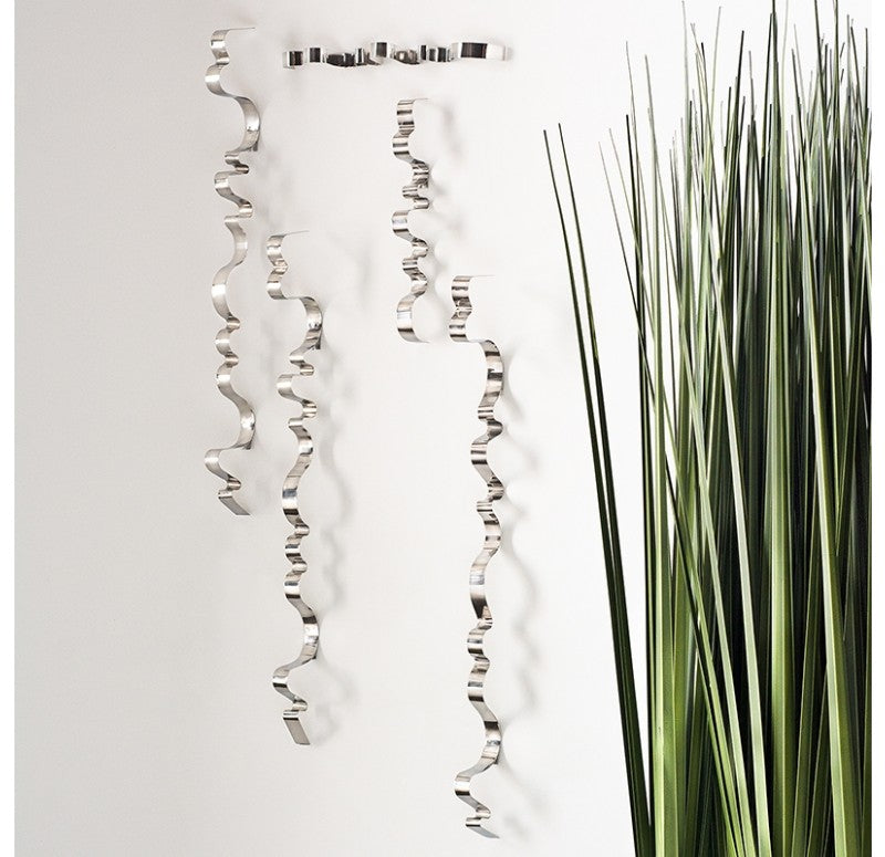 The Pulse Wall Art comes as a set of polished stainless steel strips with a hanger that slides over the screw head on the wall.