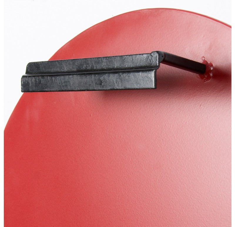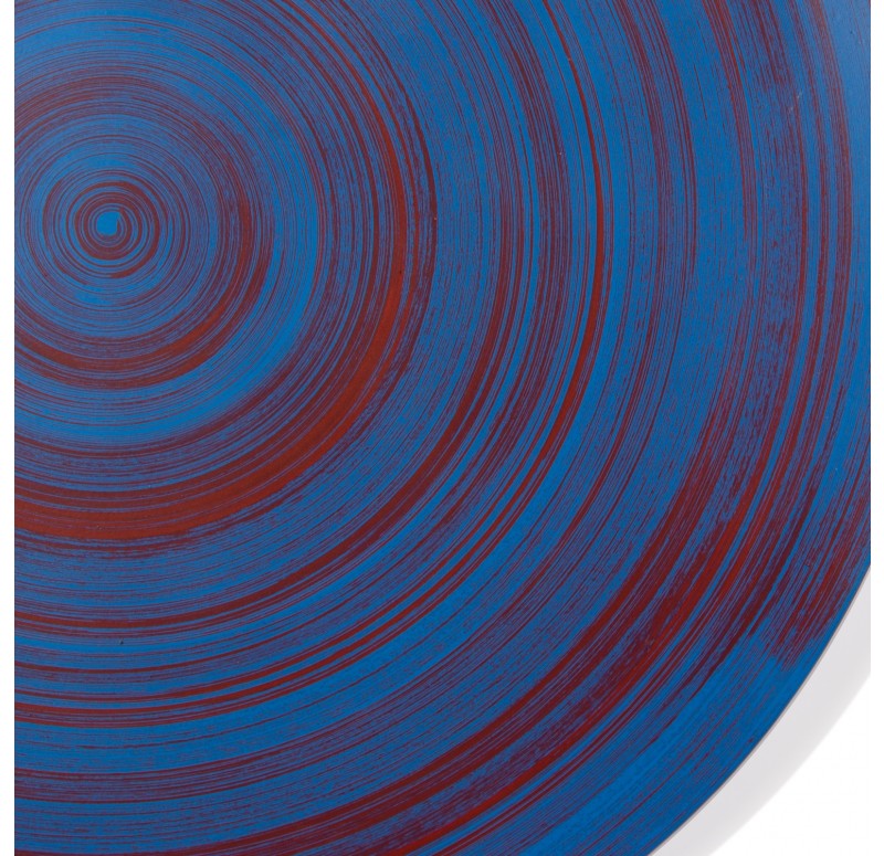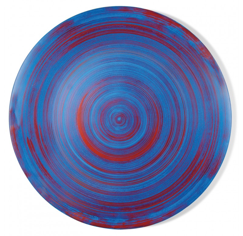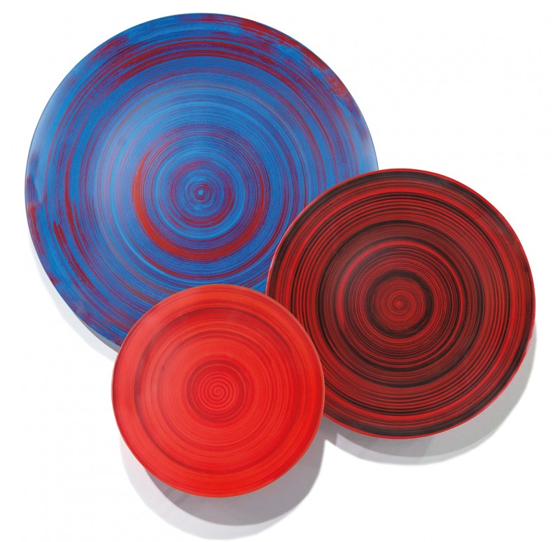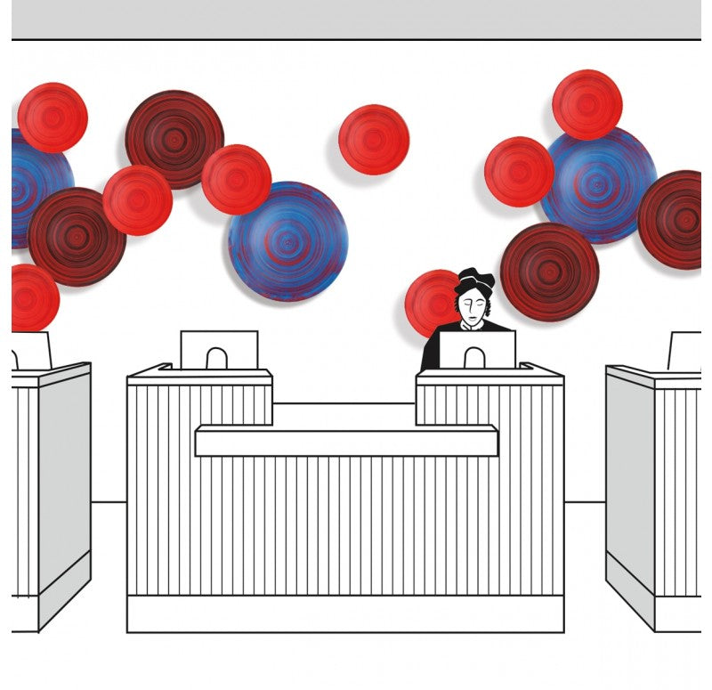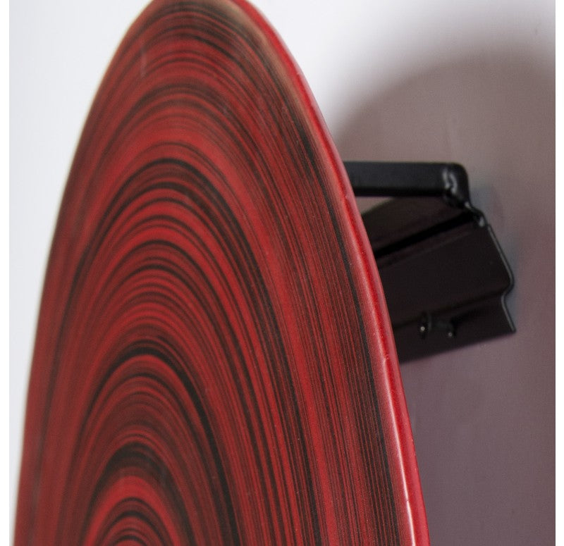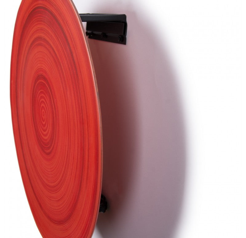 Thick iron discs are hand painted red/black/blue in a circular pattern and powder coated to create a visually moving series. Cleat hangers extend from the wall at different levels to allow overlapping if hung together (largest diameter closest to the wall and smallest diameter farthest from the wall).