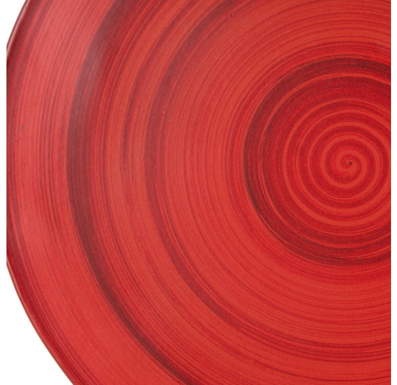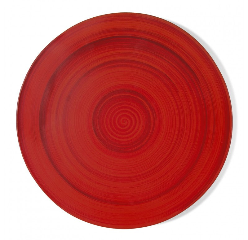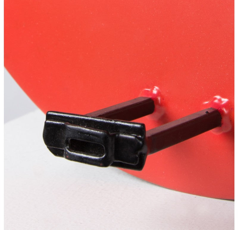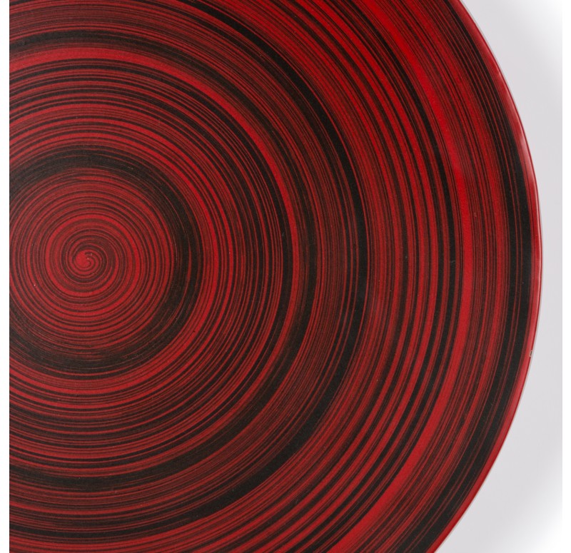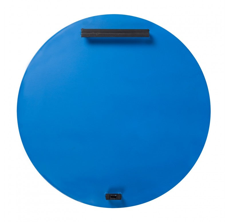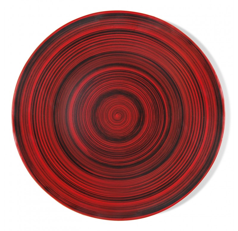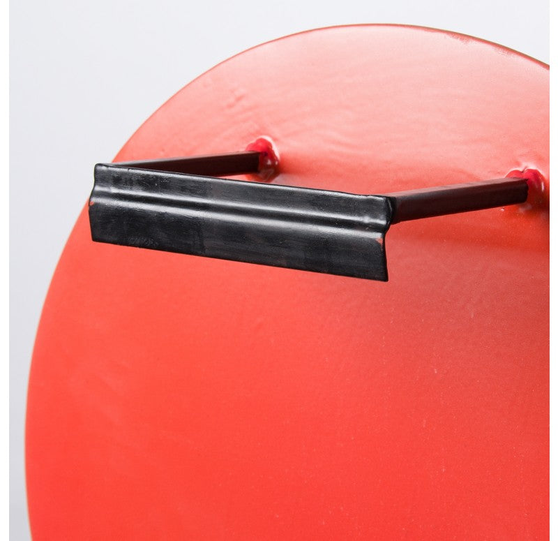 Thick iron discs are hand painted red/black/blue in a circular pattern and powder coated to create a visually moving series. Cleat hangers extend from the wall at different levels to allow overlapping if hung together (largest diameter closest to the wall and smallest diameter farthest from the wall).
