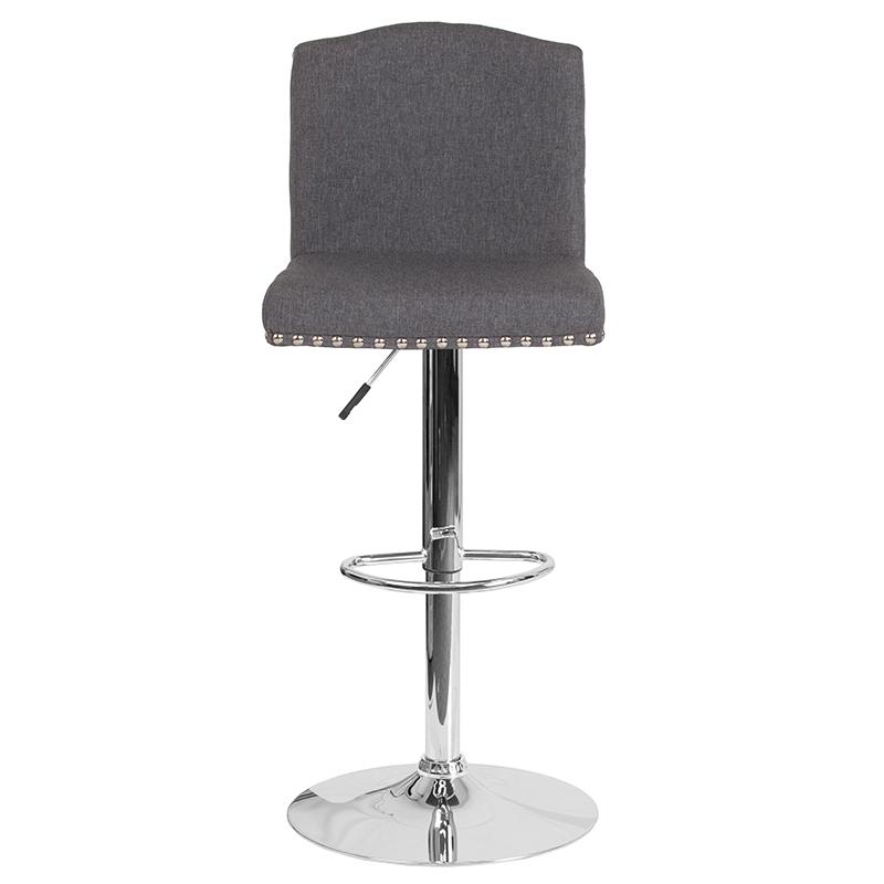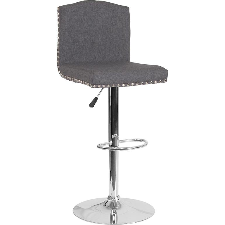 This stylish dark gray, fabric upholstered, adjustable height barstool provides just the right accent to feature at your breakfast bar or kitchen counter. The beautifully designed back has an arched peak. The seat is padded with 2" of foam and adorned with nail trim. The swivel seat easily adjusts from counter to bar height using the convenient gas lift handle, located just below the seat. The chrome details give it a modern contemporary appeal, while the contrasting decorative nail heads and curved lines are reminiscent of idyllic classical design. To help provide additional protection to the floors, the base has a concealed plastic ring. Designed for residential use, this barstool is an excellent choice when you want a contemporary look for your home.