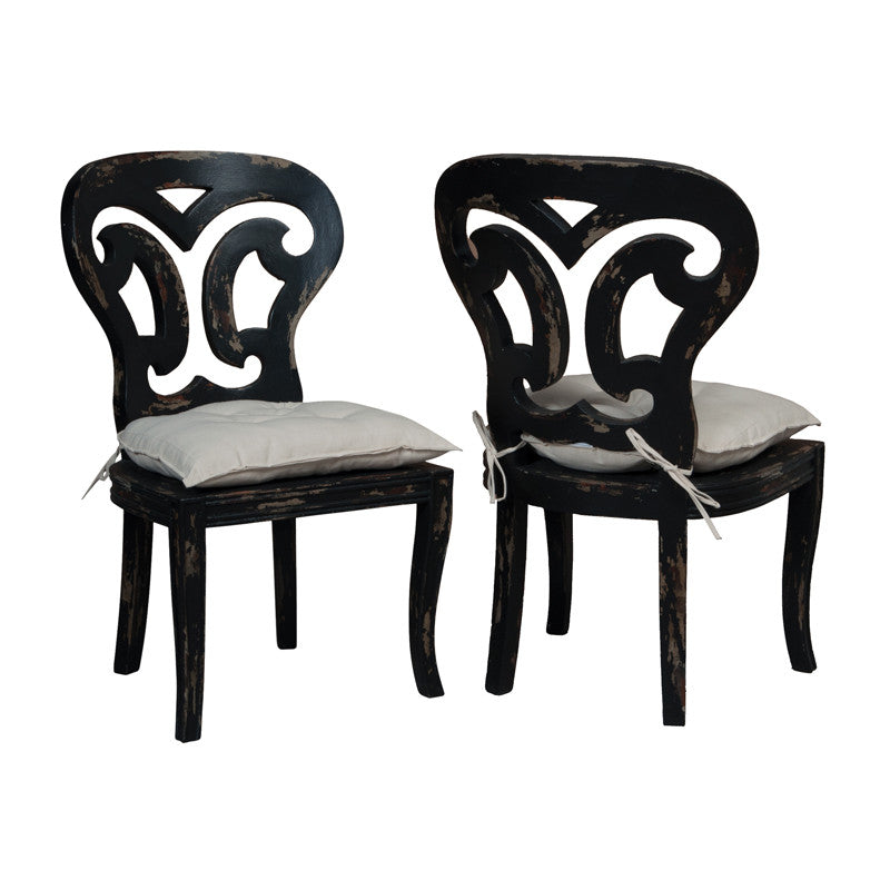 Vintage Noir finish on hand-carved dining chair. Linen cushion. Pair.