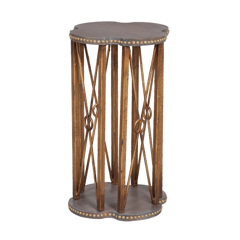 Heritage Gray Dark Stain finish on table top and base with antiqued gold metal accents.