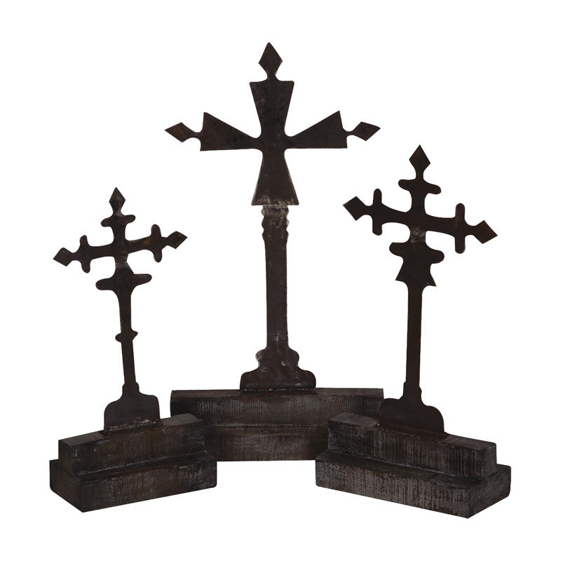 Reclaimed set of three tin crosses mounted on wood bases finished in Heritage Grey Stain.