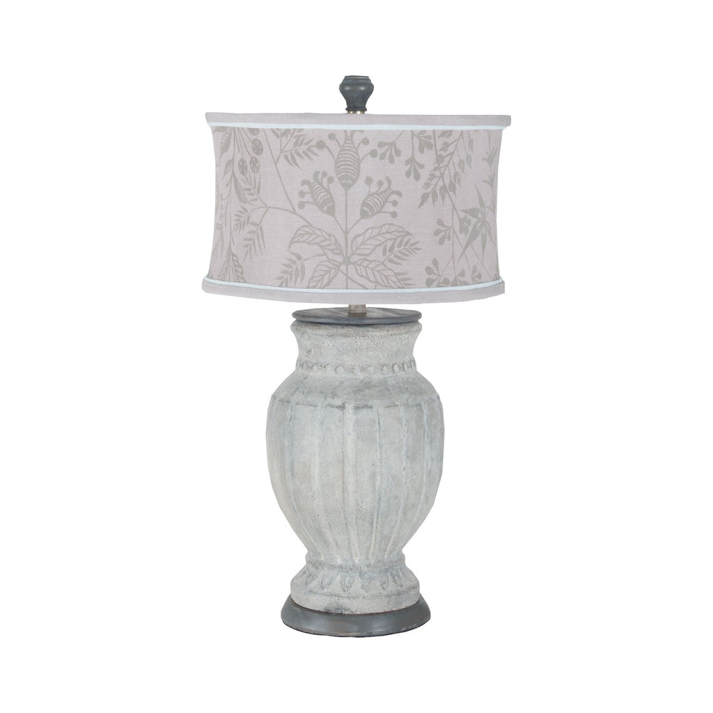 Concrete finish on terra cotta lamp on wood base. Hand-painted floral pattern on linen shade with aqua trim.