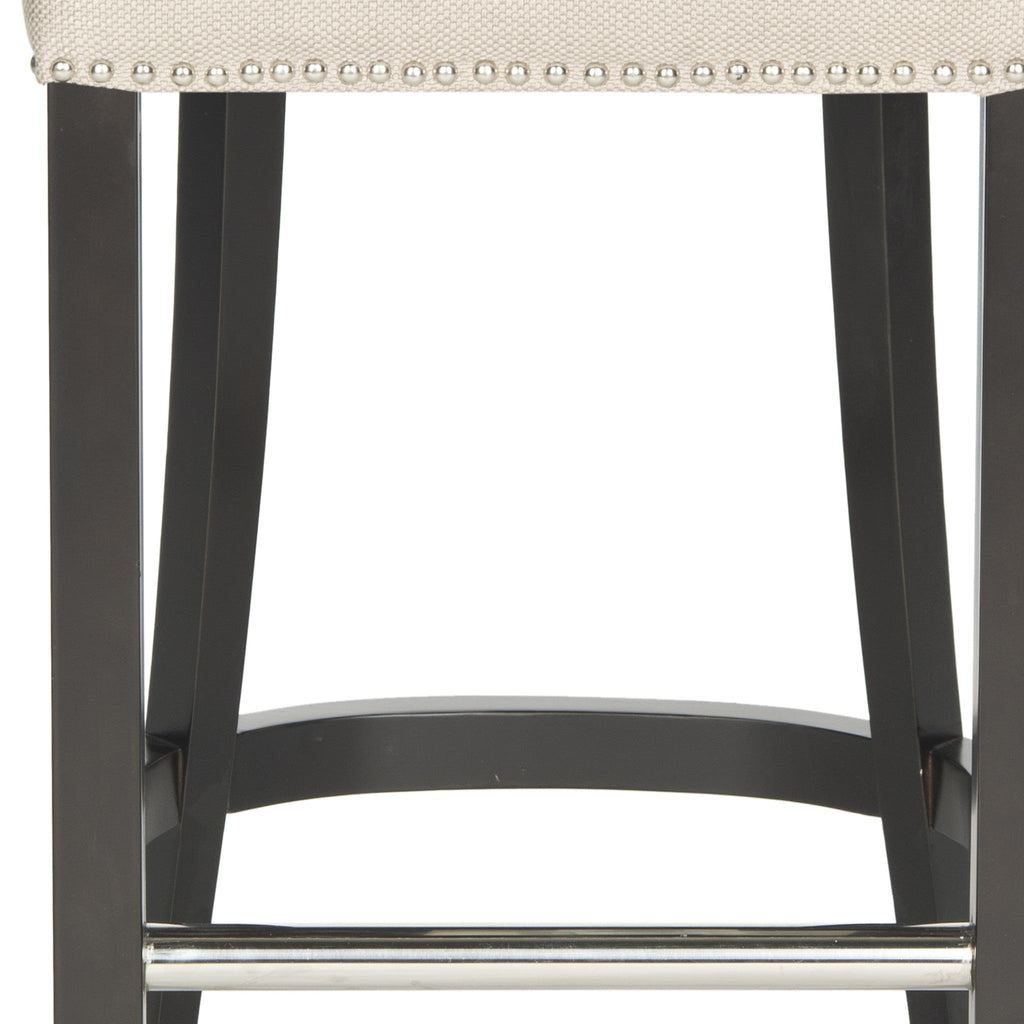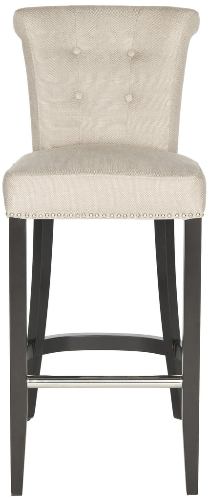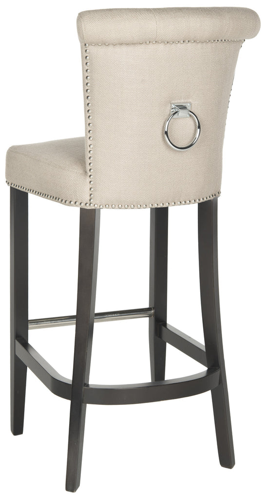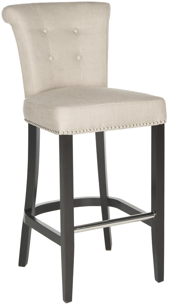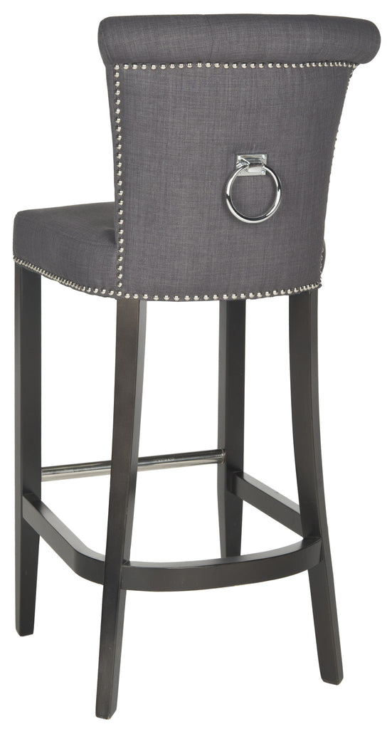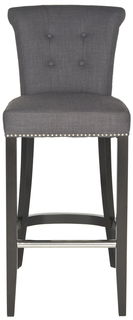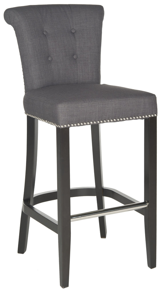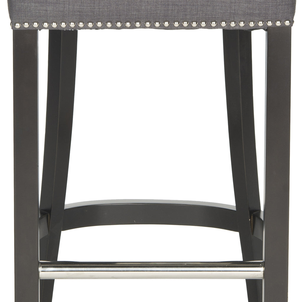 Dressed up with silver nail heads, foot rest and a clever metal ring on its back, the Addo ring bar stool is shown in charcoal linen-weave poly fabric with birch legs in espresso. Button tufts on the front of the tapered backrest add to the allure.