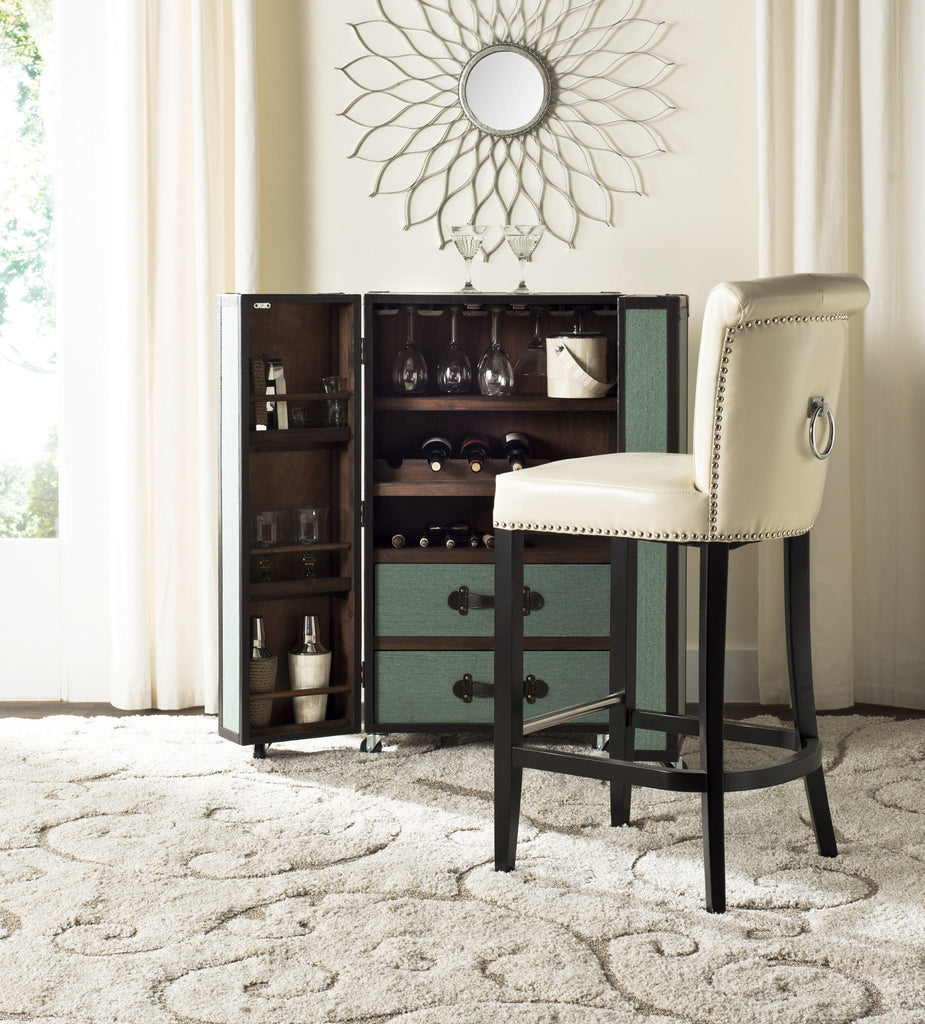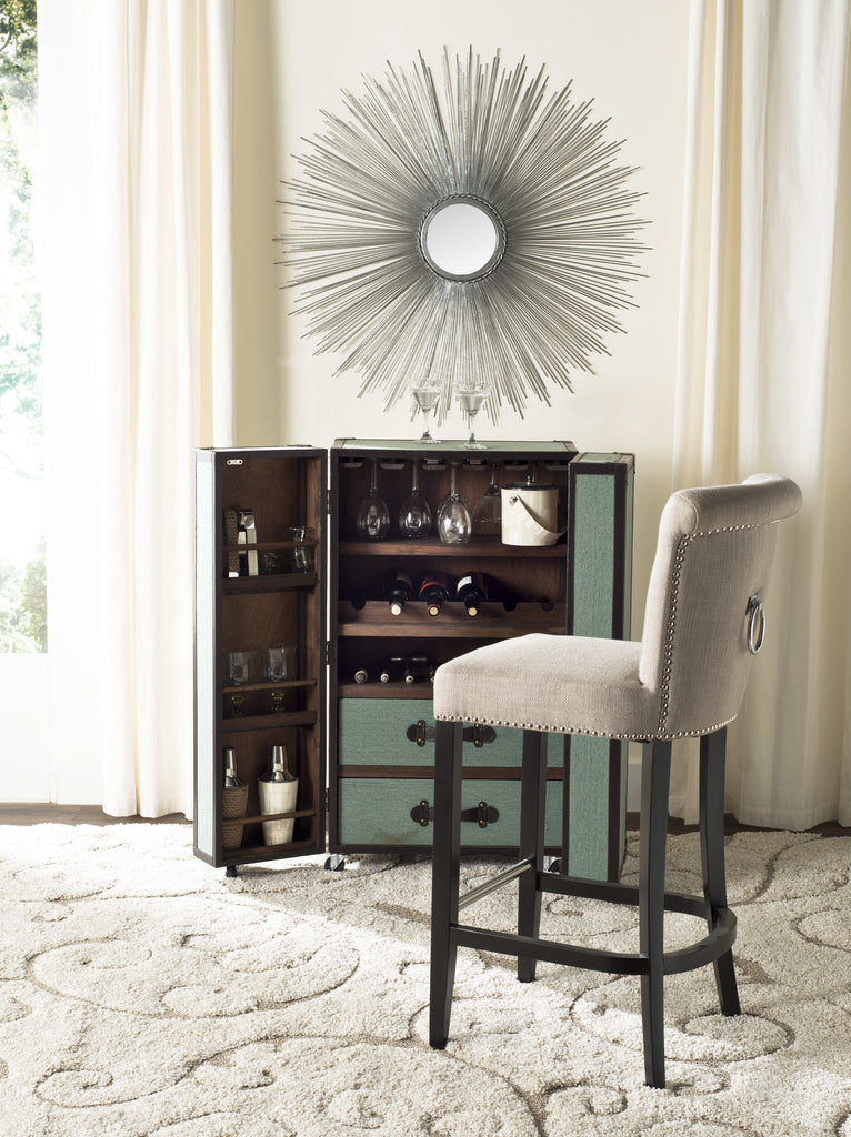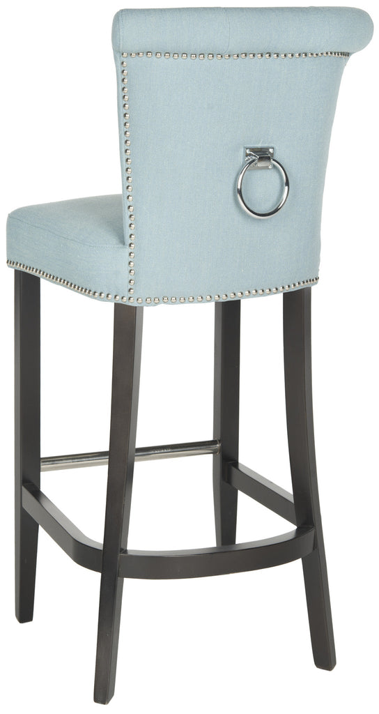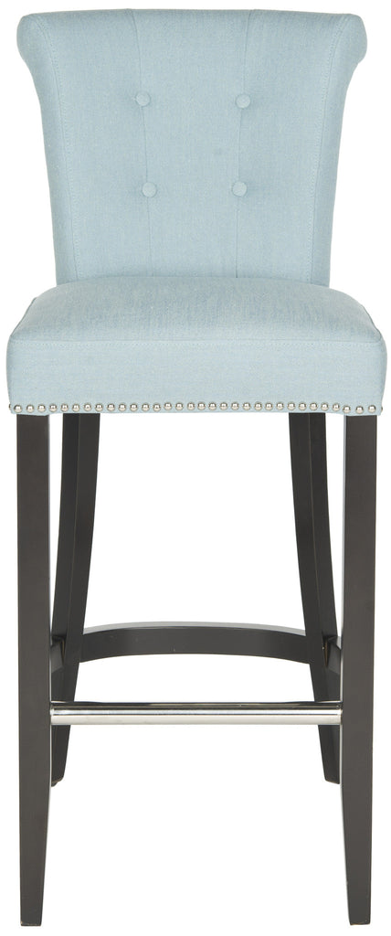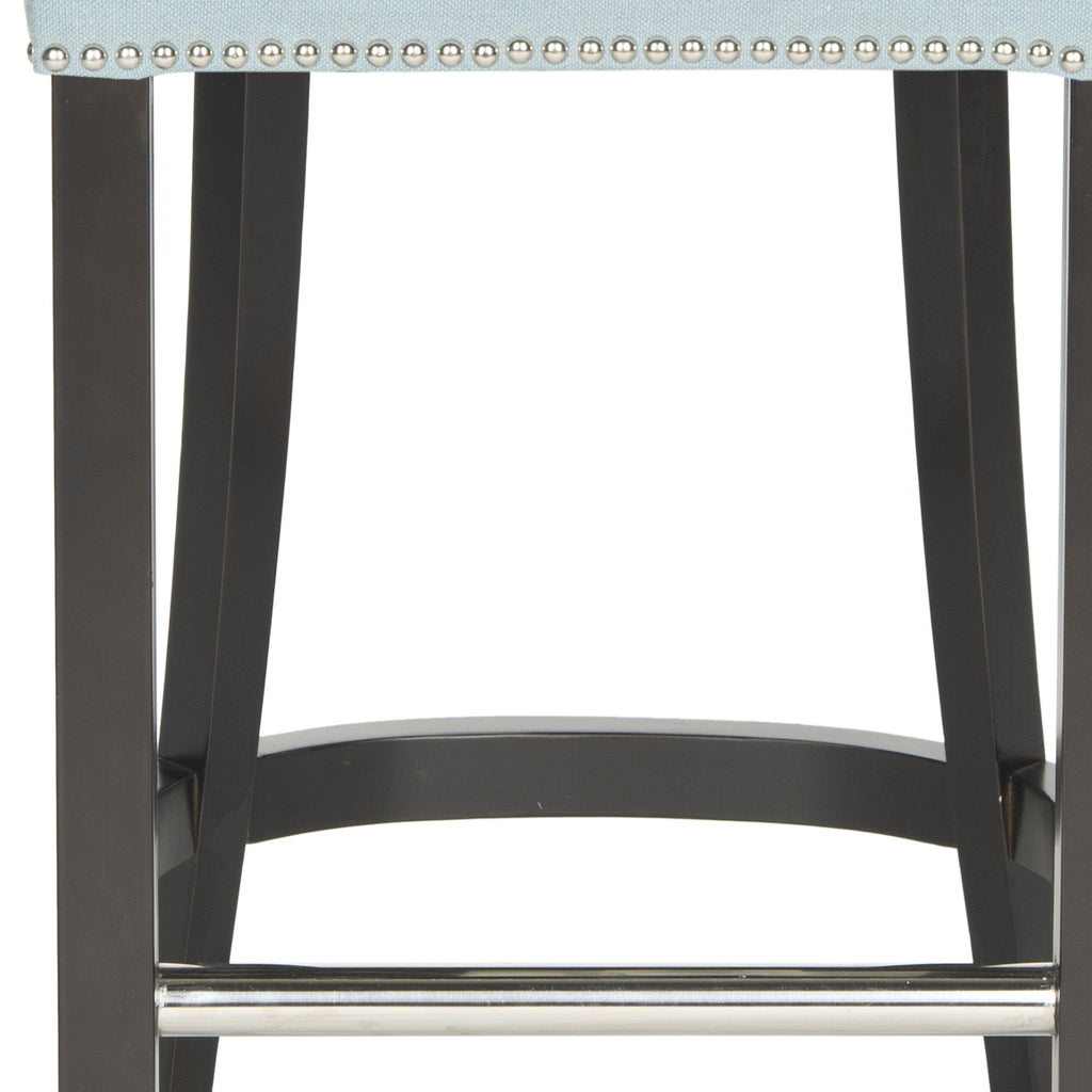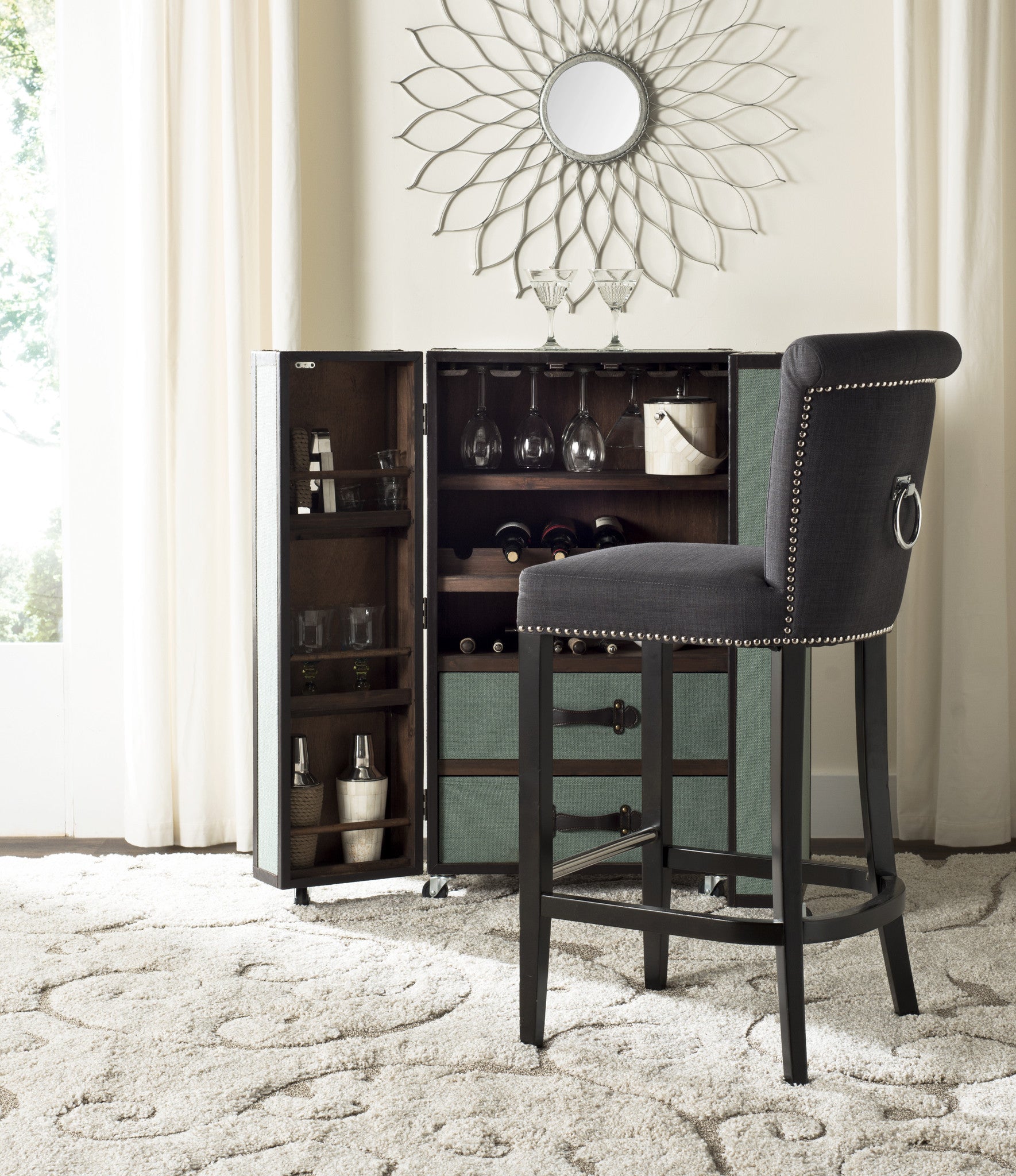 Dressed up with silver nail heads, foot rest and a clever metal ring on its back, the Addo ring bar stool is shown in charcoal linen-weave poly fabric with birch legs in espresso. Button tufts on the front of the tapered backrest add to the allure.