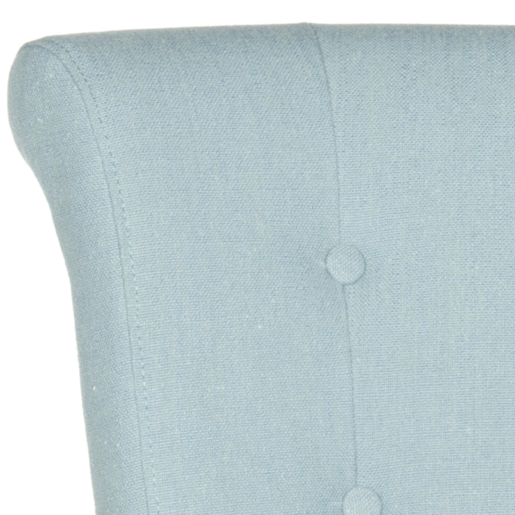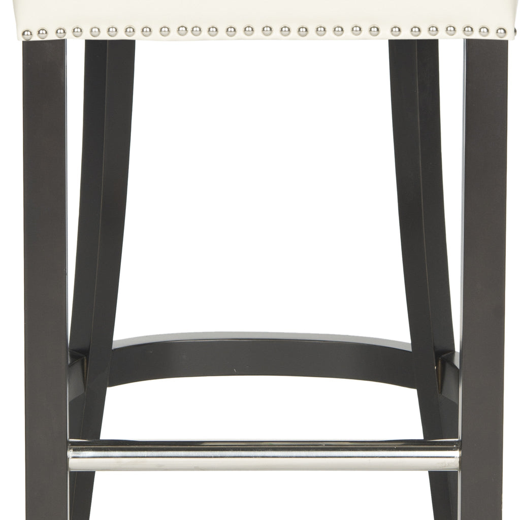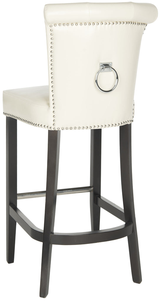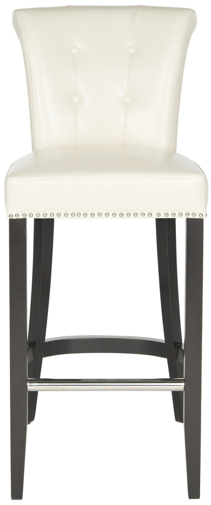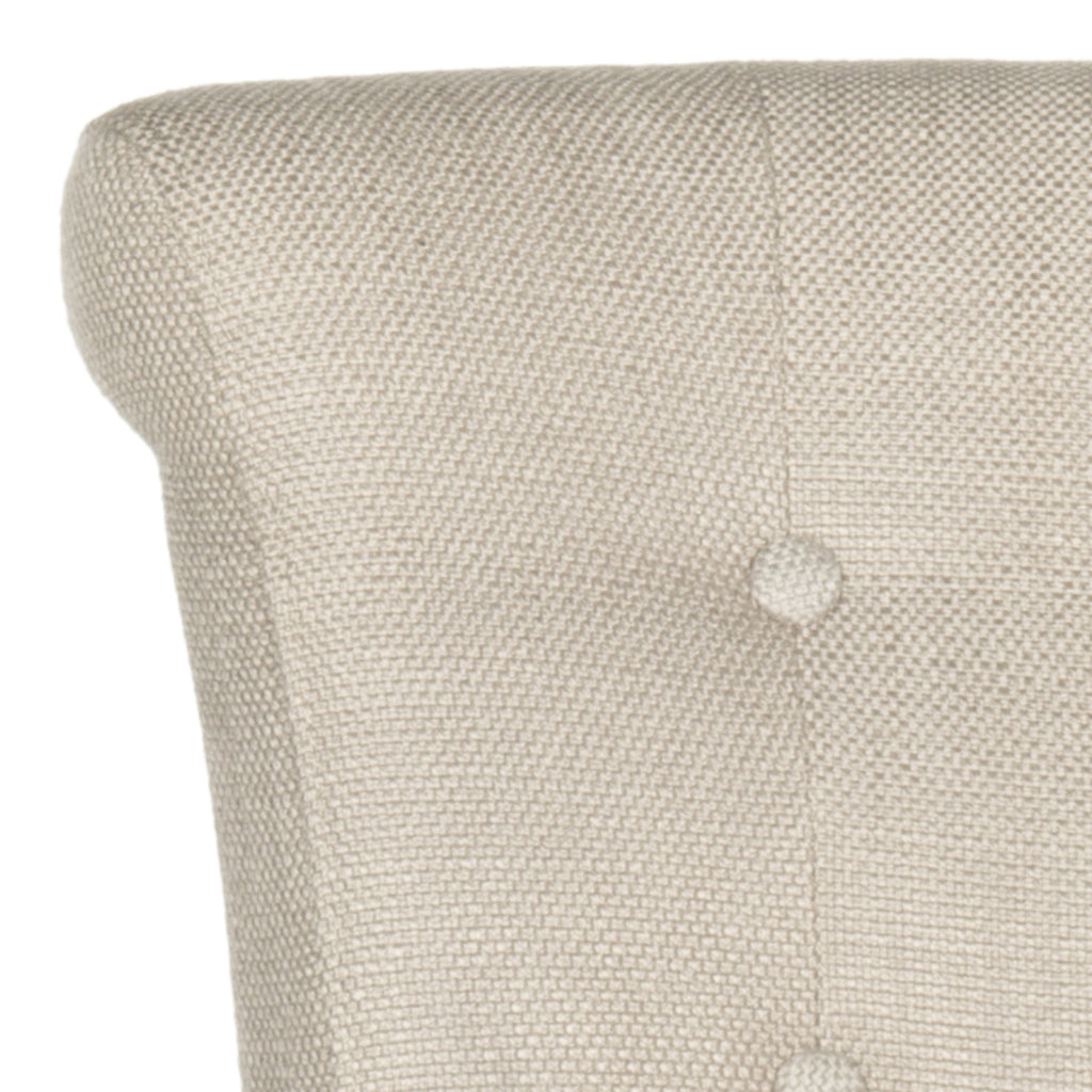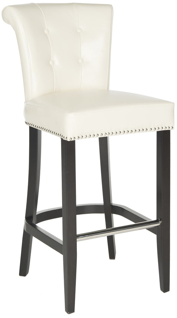 Dressed up with silver nail heads, foot rest and a clever metal ring on its back, the Addo ring bar stool is shown in charcoal linen-weave poly fabric with birch legs in espresso. Button tufts on the front of the tapered backrest add to the allure.