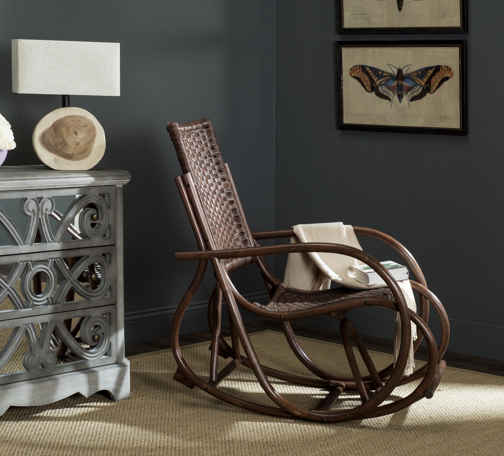 Inspired by the timeless Bauhaus aesthetic of the design classic created by Michael Thonet, this modern wicker rocking chair is a designer favorite. Its finely crafted grey frame offers a warm, exotic interpretation of the modern marvel.