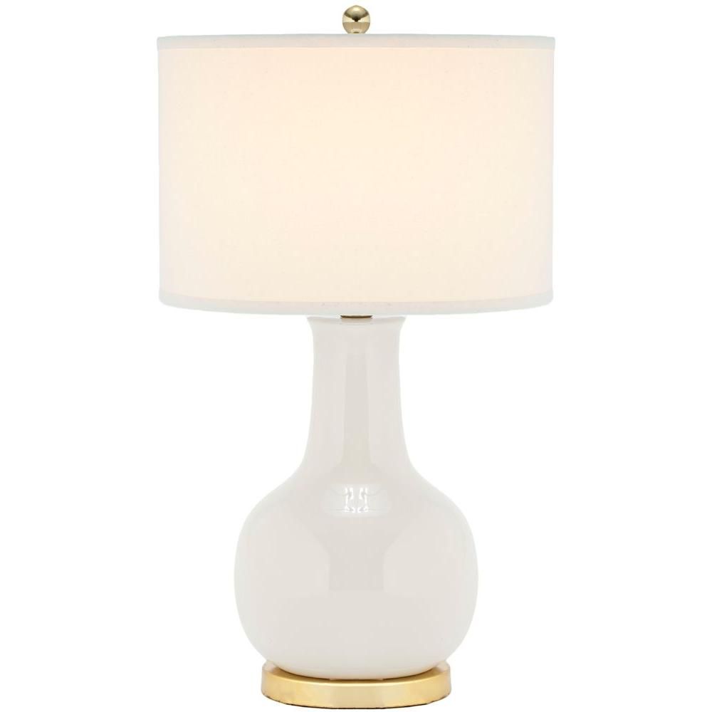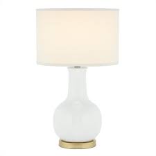 The Paris Lamp is sure to illuminate any room with elegance and style. Its classic gourd body of pristine white glazed ceramic is accented with gold-finished metal neck and base, and topped with a hard white drum shade of cotton.