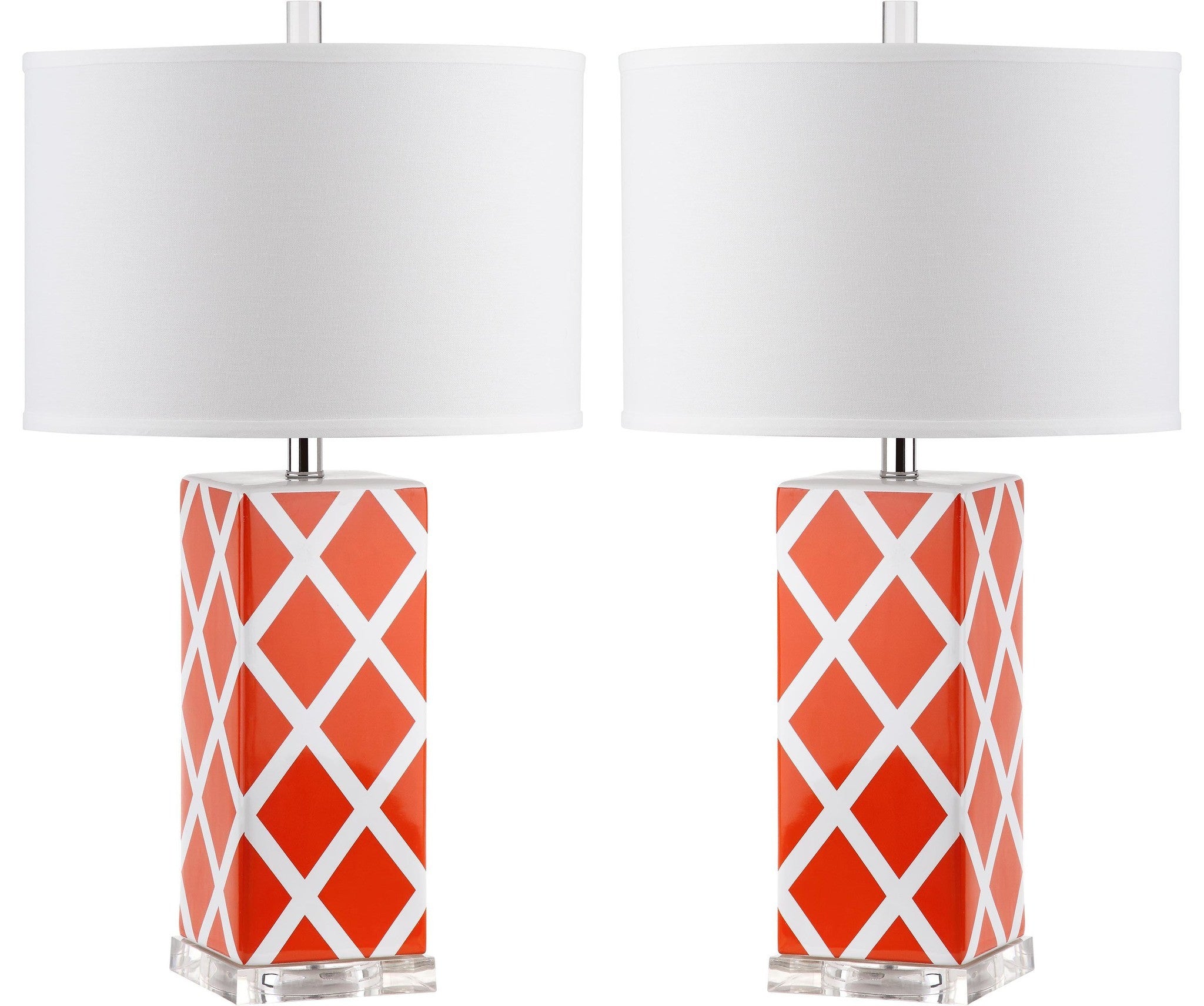 Forever plaid takes on new meaning with the Garden Lattice table lamp by Safavieh. Crafted of orange and white ceramic with acrylic base and a silver neck, this graphic windowpane design is topped with a contemporary white cotton hardback drum shade.