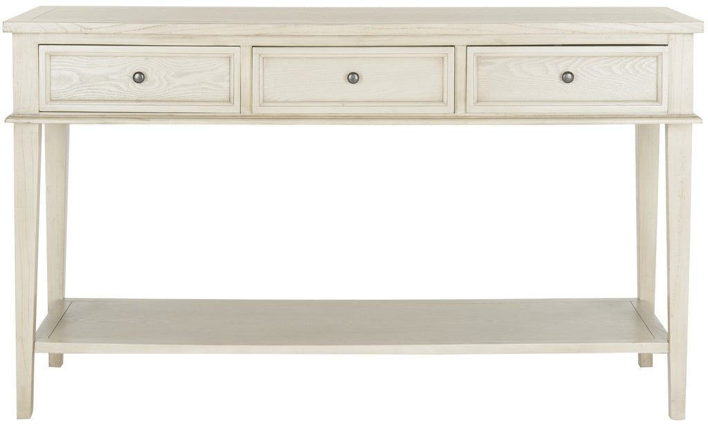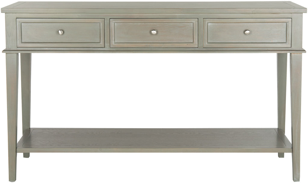 Simple lines and purity of function lend a timeless quality to the Shaker-inspired Manelin console with tapered legs, three drawers and lower shelf. Crafted of pine in a sepia finish, this console is at home in country, rustic or transitional settings.