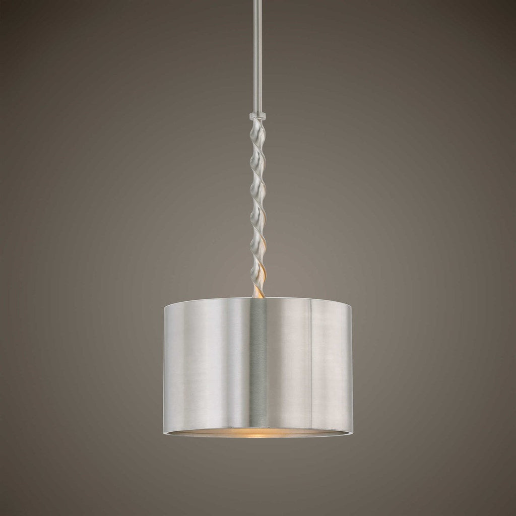 This sleek brushed nickel drum shade has a twisted steel decorative rod with bold ridges as an additional design element. 1-100 watt max, Edison socket. Includes 15wire, and 3-12"stems & 1-6" stem for adjustable installation.